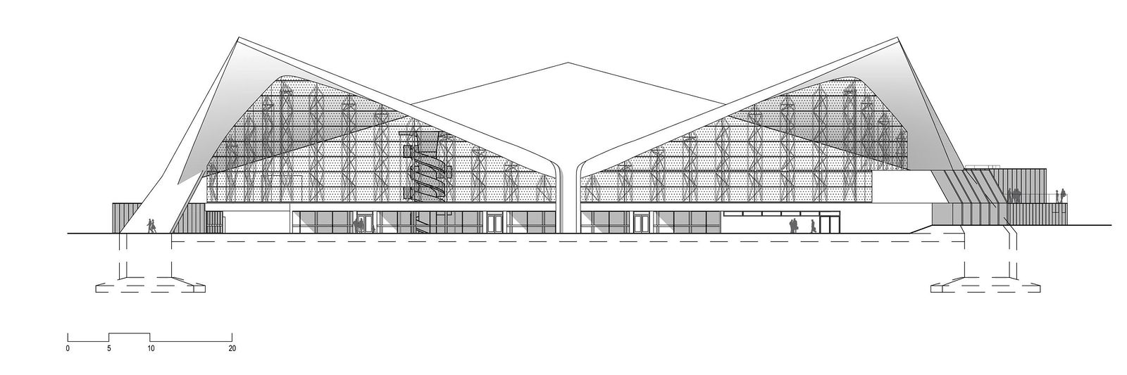 Both Rolf Störmer, Jan Störmer's father, and Meinhard von Gerkan and Volkwin Marg, who were students at the time, had submitted a design. Von Gerkan and Marg made the shortlist. The architects Horst Niessen and Rolf Störmer, who had won first and second place in the competition without designing a shell roof, were brought together as a team by the client and forming a joint venture with the shell construction expert Walter Neuhäusser. They worked out the design they now wanted together with the renowned engineers Fritz Leonhardt and Wolfhardt Andrä, in whose office the still young engineer Jörg Schlaich, later schlaich bergermann partner (sbp), was significantly involved in the development of the supporting structure.