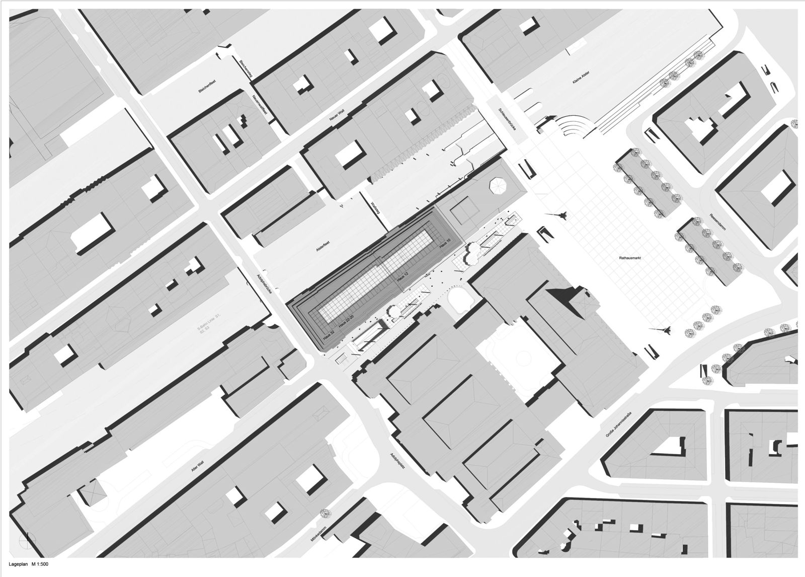 Located in the midst of Hamburg’s inner city, next to City Hall and the Hamburg Exchange, Alter Wall was a lively commercial street well into the 19th century, but in the 20th century, filled only by banks and offices, its appeal to the general public waned. With the new development behind the listed facades at Alter Wall 2–32, the street alongside Hamburg’s City Hall is now regaining its former liveliness.