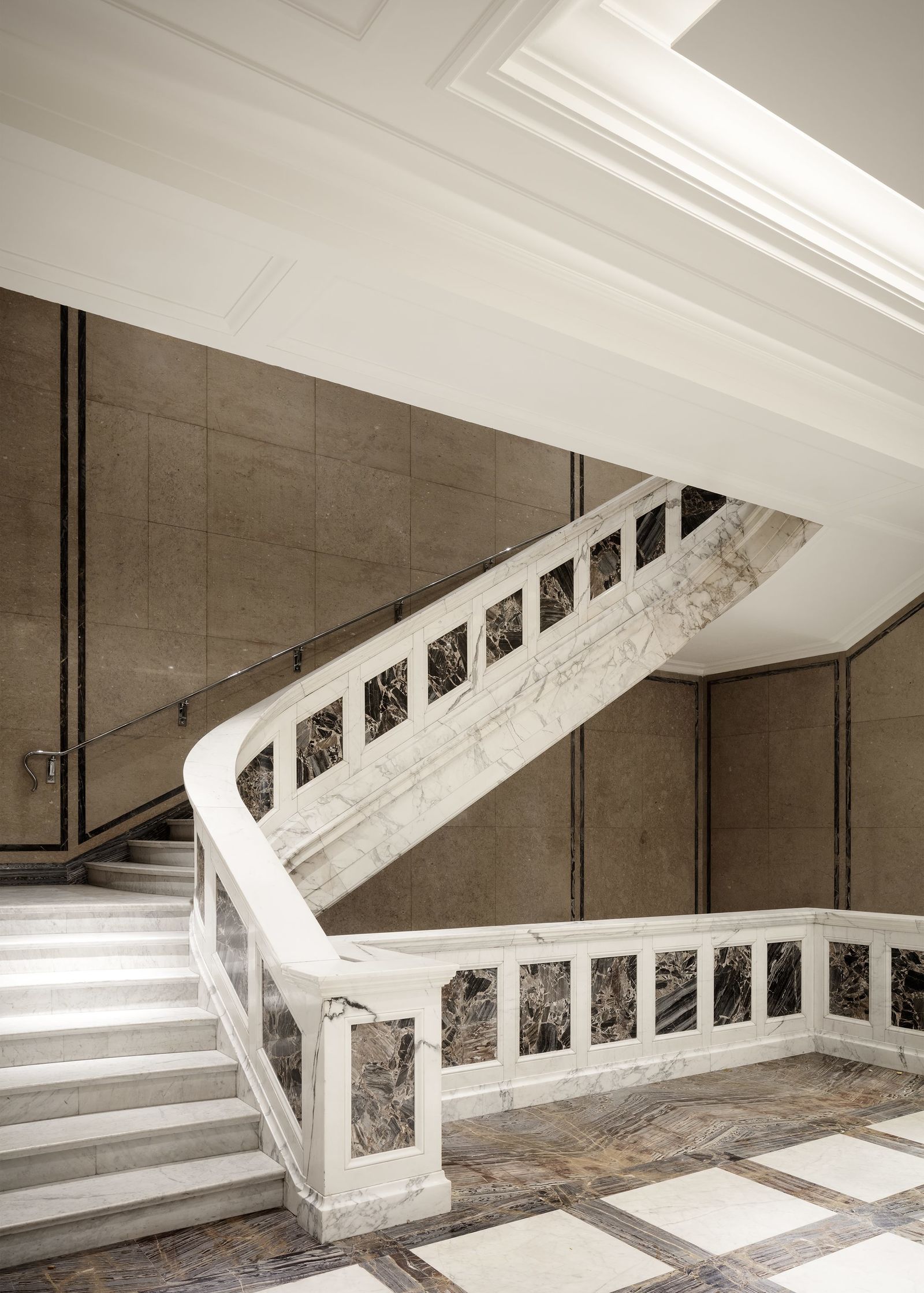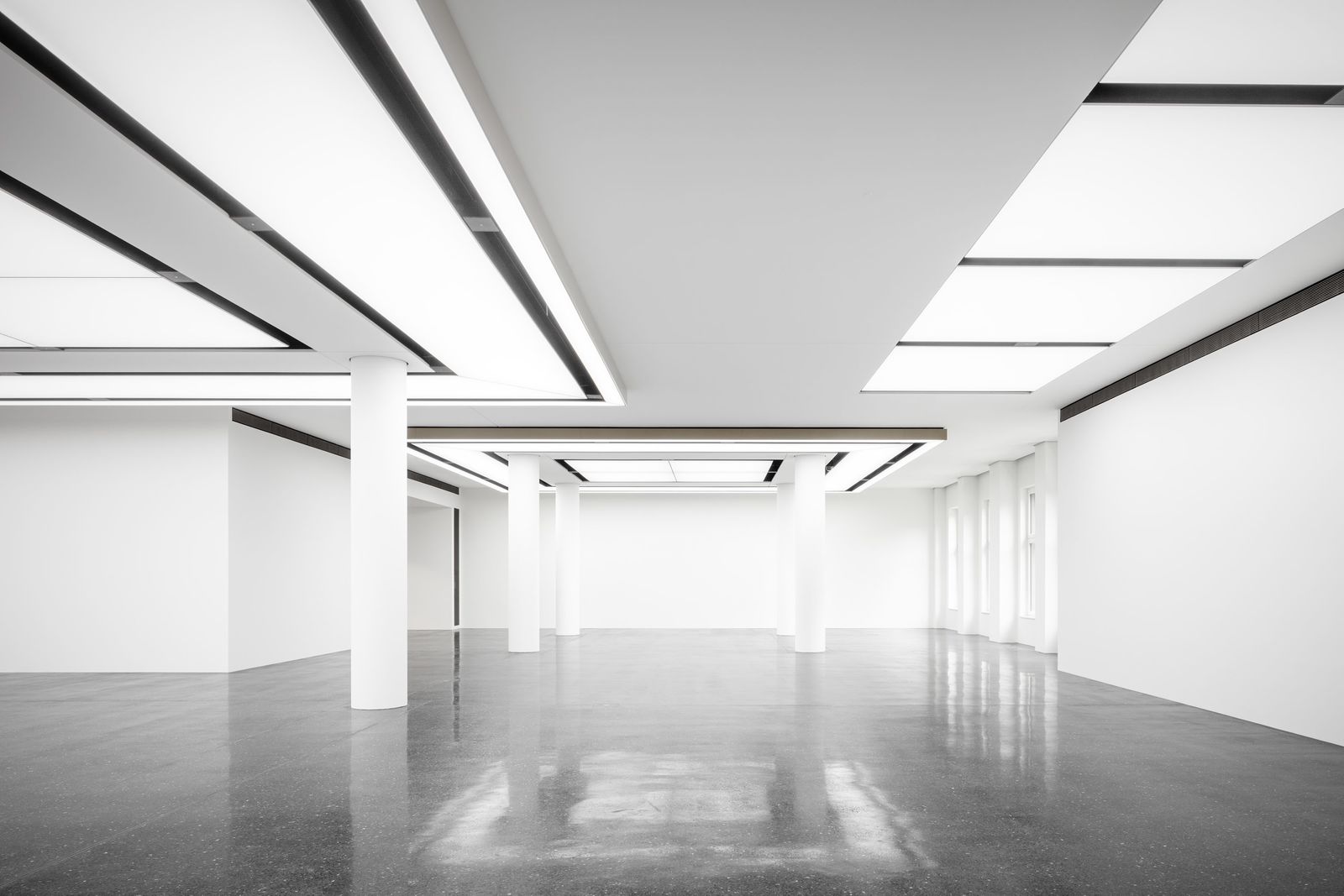The Bucerius Kunst Forum, which had previously been housed in the building that directly fronts onto Rathausmarkt, has now been moved within the ensemble to the building at Alter Wall 12. The new premises extend over four stories with a total of 3400 square meters. In addition to 850 square meters of exhibition space, the art museum also includes an auditorium with an atrium plus a studio and a shop. The lobby, with its ticket counter and the shop, is centrally oriented to the Bucerius Passage. The main stair, with its steps and sides made of dark walnut wood, is a warm counterpoint to the dark terrazzo floor and the otherwise white walls and built-in elements. The large exhibition hall on the first upper floor can be used in its entirety or divided into more intimate spaces, and expansive luminous ceiling panels ensure optimal lighting. An entire story is reserved for the auditorium and its atrium, where events such as readings and concerts will take place in the future.