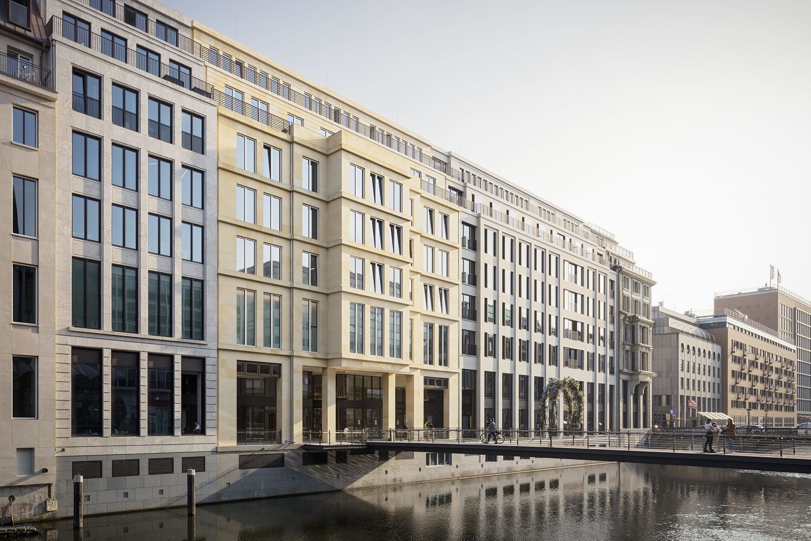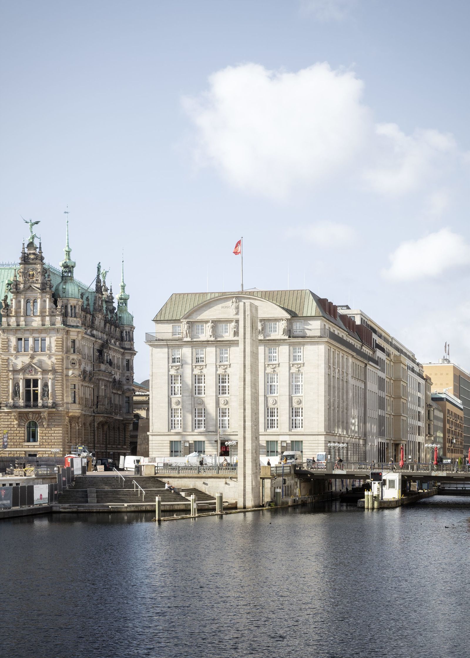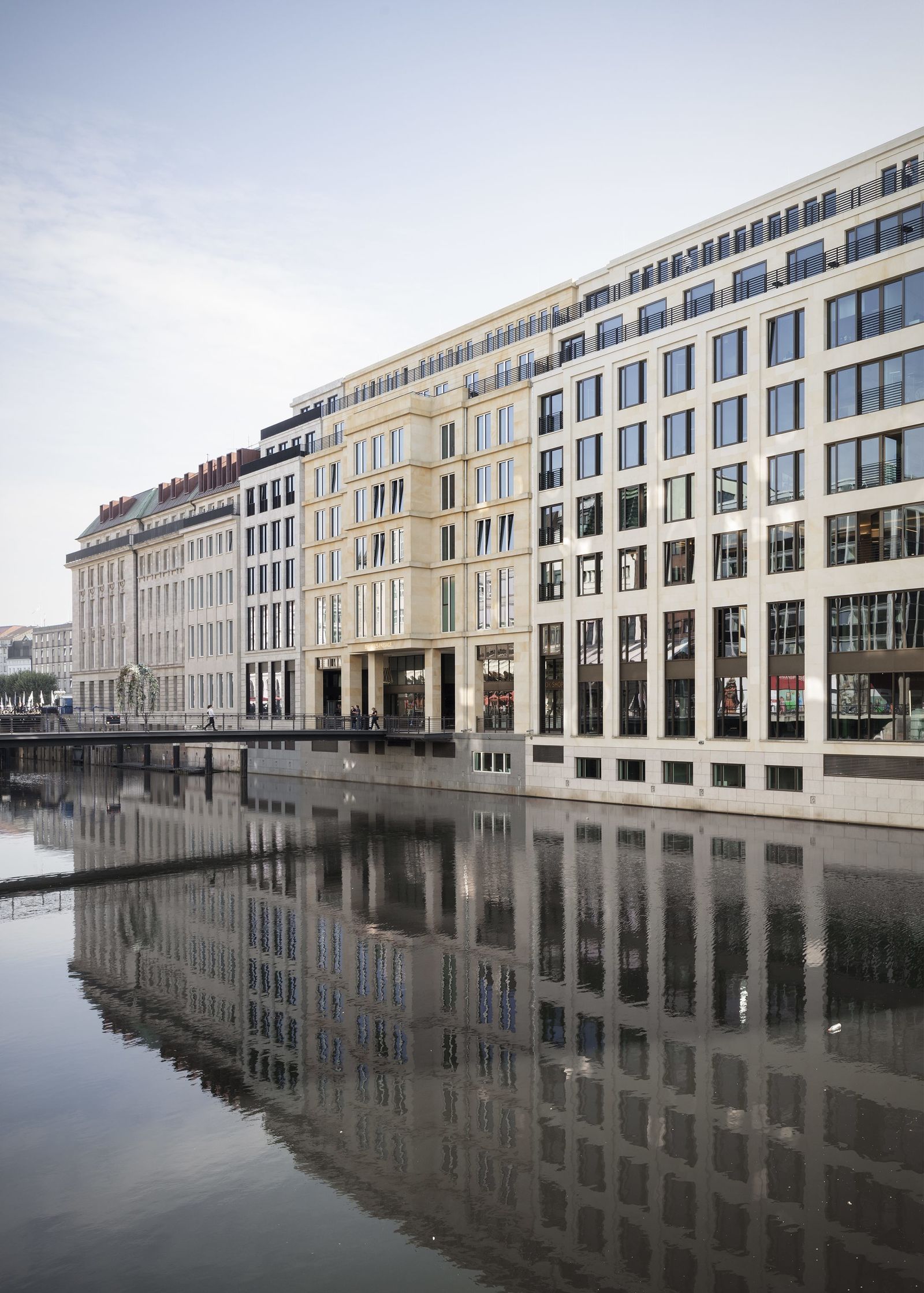 In the first phase of the construction, the building block was completely reorganized – stores, restaurants and cafés have been created on the ground floors along the street, replacing the previous offices and revitalizing the redesigned street that will soon be reserved exclusively for pedestrians. The new building has a total of thirteen levels: a four-story underground parking garage and nine stories above. On the upper six floors, an elongated central courtyard with a glass roof defines the central axis. In addition, a passage with a new pedestrian bridge over the Alsterfleet to the Alsterarkaden shopping arcades along Neuer Wall establishes an attractive route across Hamburg’s city center. The original facades along Alter Wall and Adolphsbrücke are being restored as historical monuments. Along the Alsterfleet, natural stone dominates the new facades that conform to the height and setbacks of the adjacent existing buildings.