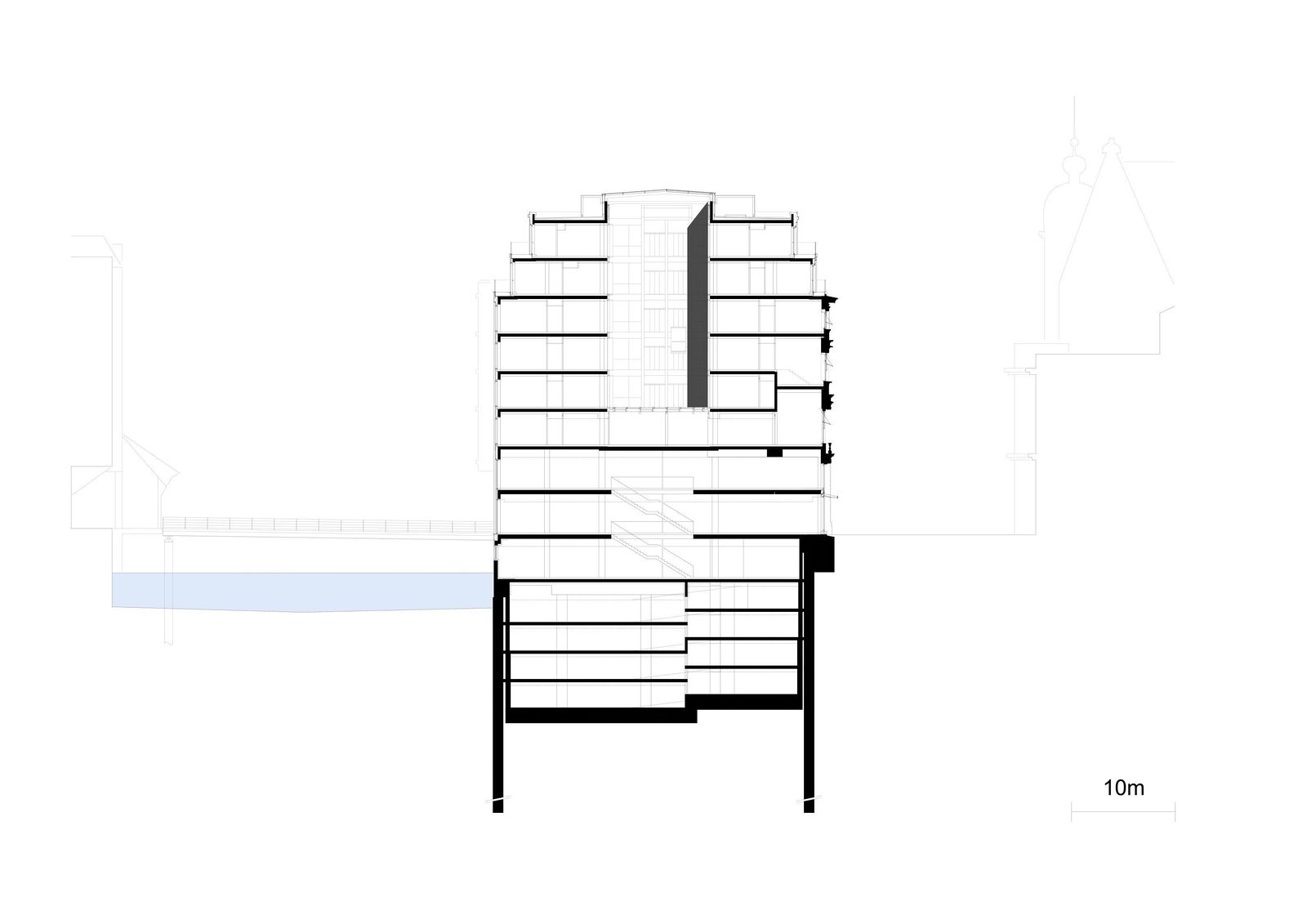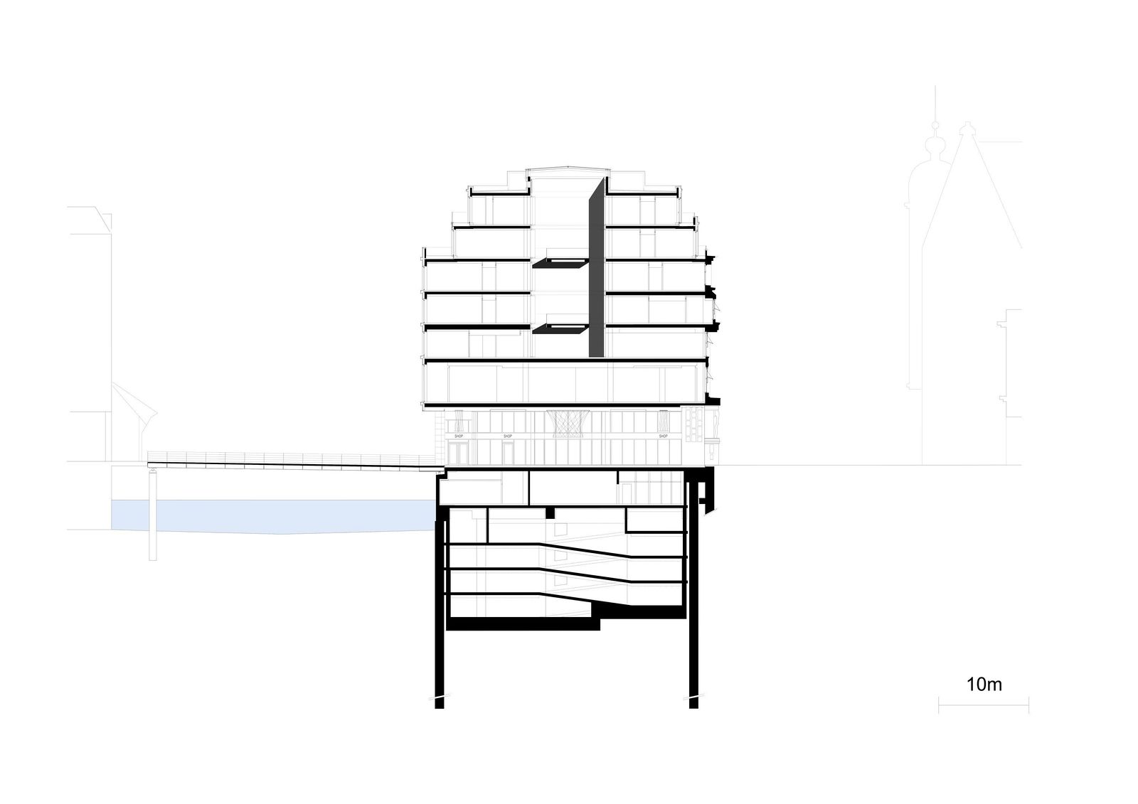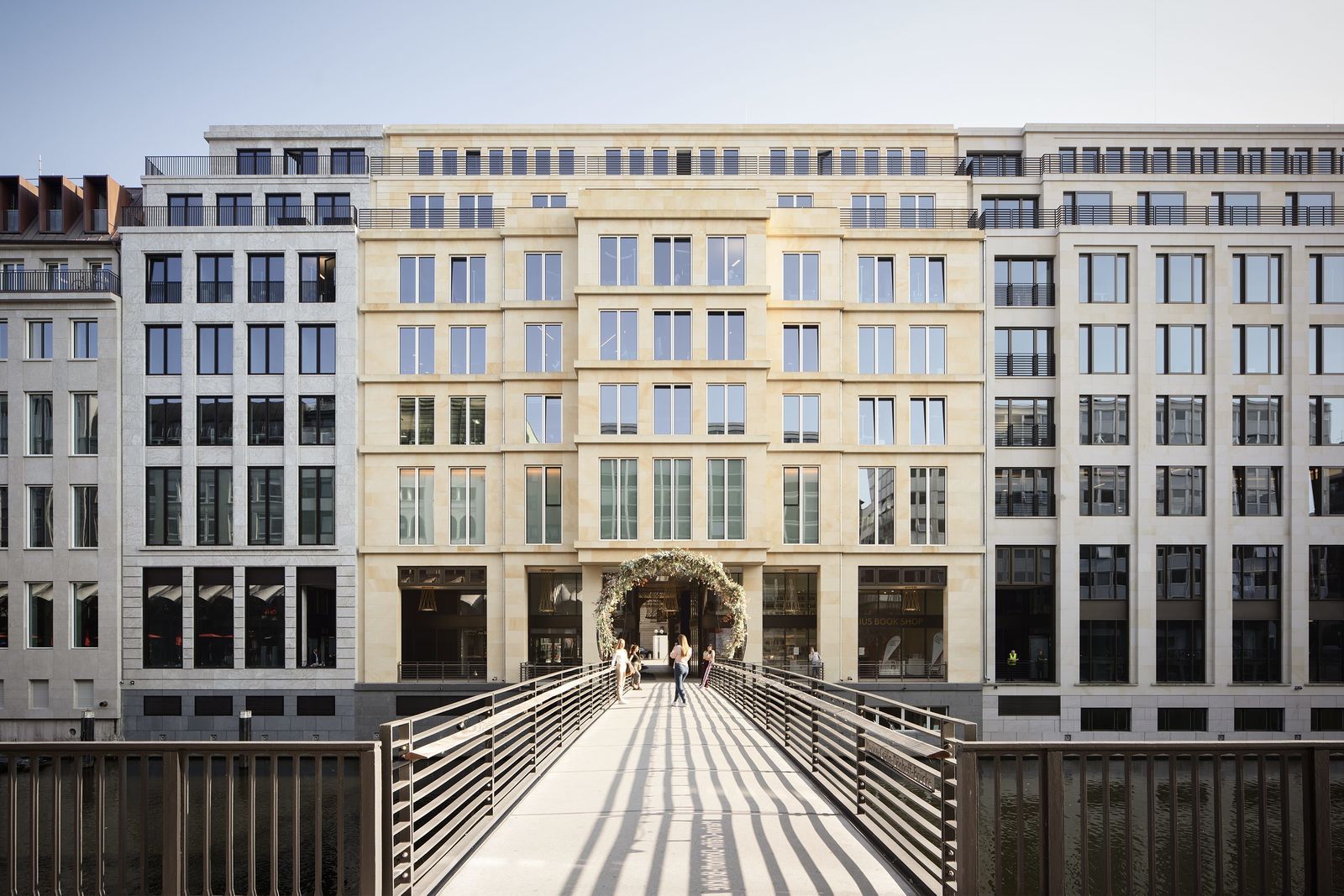 In the first phase of the construction, the building block was completely reorganized – stores, restaurants and cafés have been created on the ground floors along the street, replacing the previous offices and revitalizing the redesigned street that will soon be reserved exclusively for pedestrians. The new building has a total of thirteen levels: a four-story underground parking garage and nine stories above. On the upper six floors, an elongated central courtyard with a glass roof defines the central axis. In addition, a passage with a new pedestrian bridge over the Alsterfleet to the Alsterarkaden shopping arcades along Neuer Wall establishes an attractive route across Hamburg’s city center. The original facades along Alter Wall and Adolphsbrücke are being restored as historical monuments. Along the Alsterfleet, natural stone dominates the new facades that conform to the height and setbacks of the adjacent existing buildings.