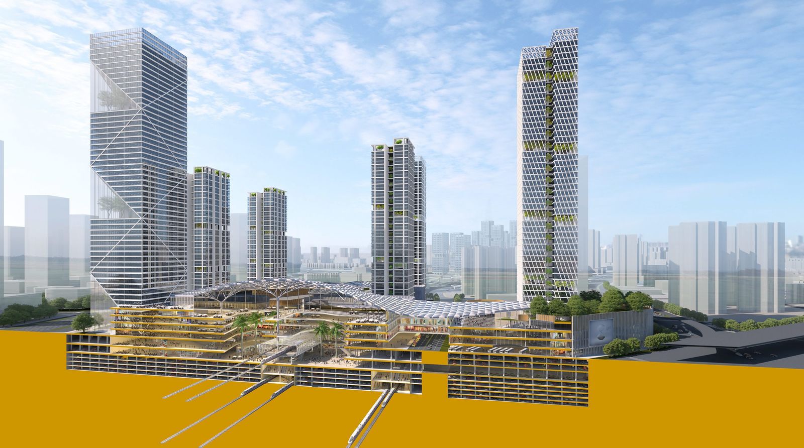 Als Höhepunkt des neuen Stadtteils lässt sich das von drei markanten Türmen räumlich gefasste Atrium über dem Umsteigebahnhof erleben. Die weitläufige, teilweise sechsgeschossige Halle öffnet sich nach unten bis auf das zweite Untergeschoss. Sie funktioniert als Scharnier zwischen den verschiedenen öffentlichen Räumen. Durch die große geschwungene Glaskonstruktion über dem Atrium gelangt natürliches Licht bis tief in die Untergeschosse. Sie eröffnet einen Blick in den Himmel und auf die umgebenden Hochhäuser. In einer als Netzstruktur konstruierten Glasröhre verläuft eine der Bahnstrecken durch das Atrium und wird als Attraktion in die kommerziellen Flächen integriert. Die Bewegung des Verkehrsflusses setzt sich auch in der Vertikalen fort. Es befinden sich hier zugleich die Eingänge und Lobbys der drei Türme. Deren bepflanzte Skygärten bieten zudem attraktive Grün- und Erholungsräume in der Höhe.