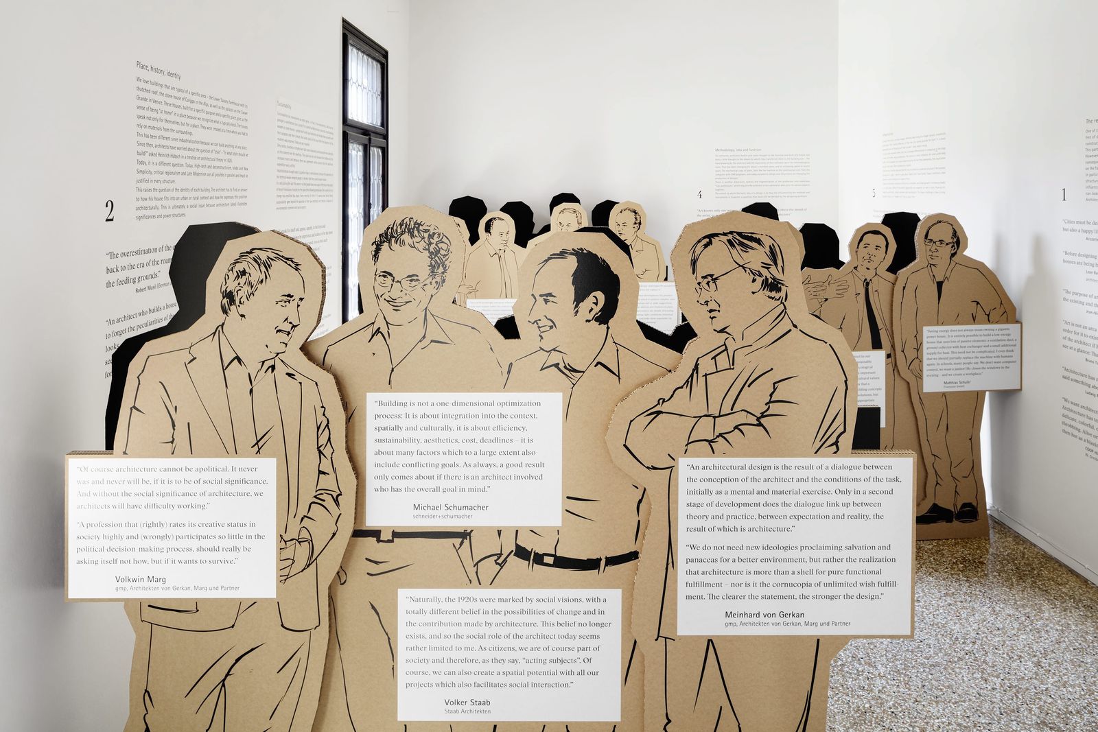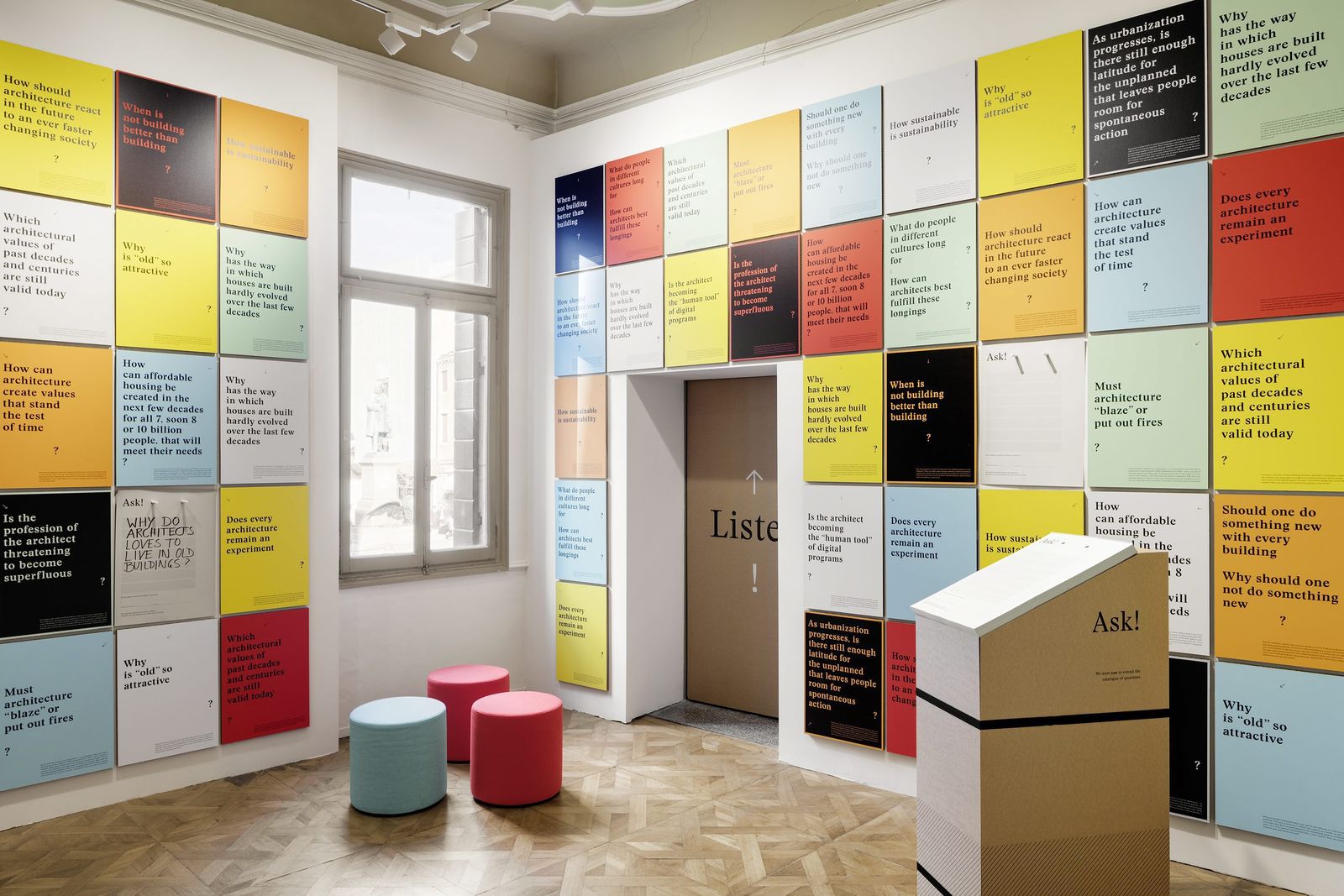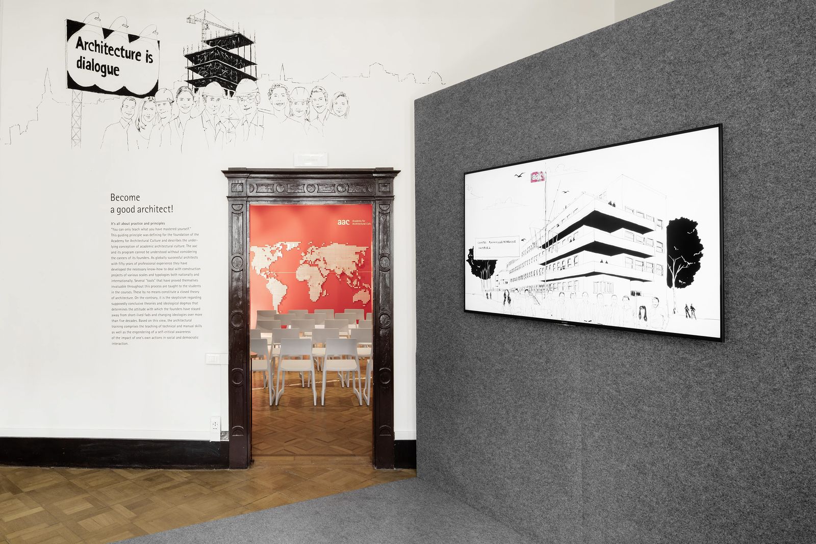 Wie sich dieser Ansatz in der Architekturlehre der aac konkret abbildet, veranschaulicht die Ausstellung im Palazzo Rossini in fünf Kapiteln. Aus der Perspektive der angehenden Architekten führt sie durch einen Parcours der Architekturlehre an der aac, der die Kompetenzen thematisiert, derer es bedarf, um die Aufgaben und Herausforderungen des Berufes verantwortungsvoll bewältigen zu können. Die Vorstellung der Akademie und ihres Lehrplans sowie der Intentionen ihrer Gründer folgen drei pointierte Imperative: