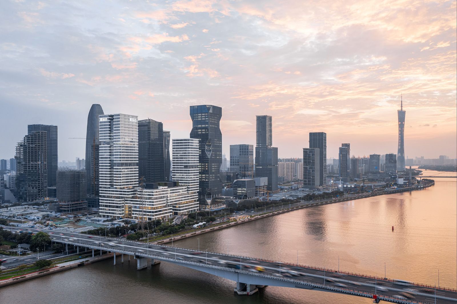 The different functional areas of the building are visually layered, separated by vertical incisions and floors with special functions appearing as joints. The first of these incisions at the fourth building level marks the interface between external and internal functions. It serves as a meeting space for guests and employees and includes a conference center, exhibition areas, and gastronomic facilities. Wide staircases from a public platform in front of the building, facing the Pearl River, connect it to the riverbank as well as to the park to the east. The two slender towers, measuring 135.5 meters and 172.5 meters in height, rise from the building plinth and house more offices as well as the administration and the management.