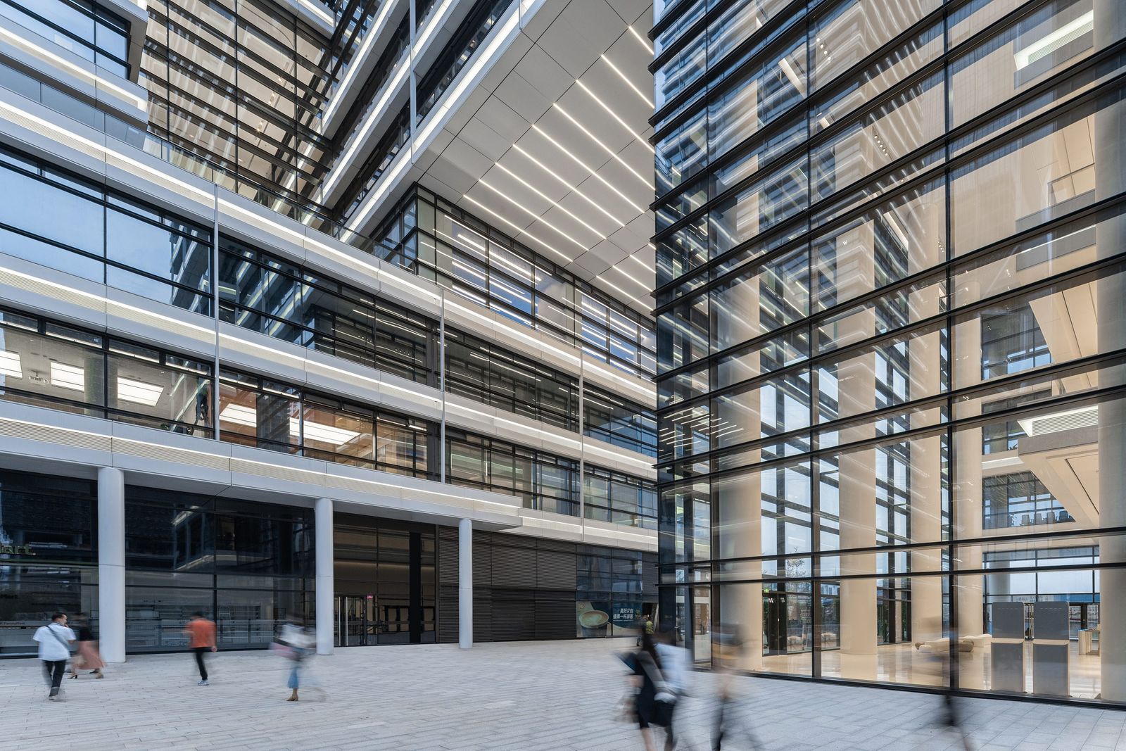 vip.com’s company culture is characterized by dynamism and flat hierarchies. In terms of architecture, this calls for large flexible areas that can be used in a variety of ways and modified very quickly, thus allowing for different forms of office organization. Contrary to the urban design brief, which called for separate high-rise buildings on the three plots separated by roads, the gmp concept for the company headquarters was for a horizontally layered office landscape. A ten-story plinth connects all three building plots of the angular site, straddling the respective roads. On this basis, the overall volume and the arrangement of the vertical circulation systems were developed with the aim of creating a maximum of office spaces with attractive views across the river and city.
