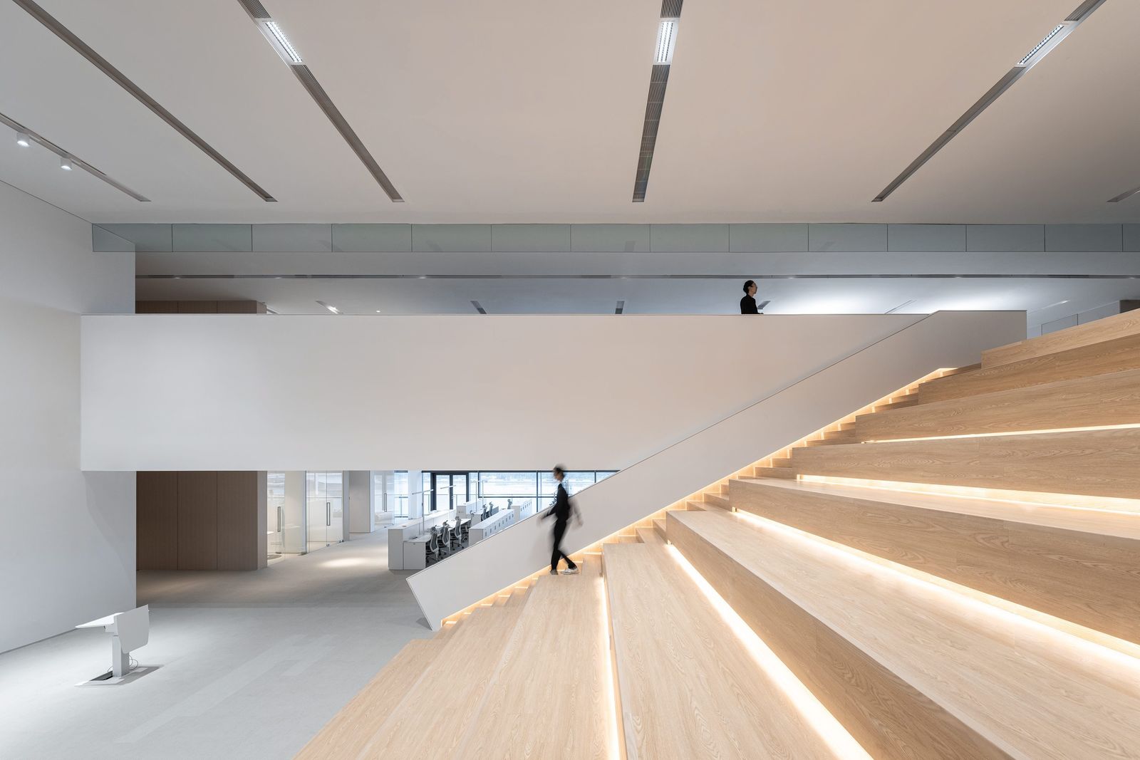 The office zones for the different company teams are accommodated in the horizontal plinth building, featuring spacious floor areas which can be flexibly adapted to changing requirements. Natural ventilation at the workplaces is made possible via openable windows. Multistory foyers and large stairwells between the floors create a vertical link between the office areas and can also be used for lectures and multi-team conventions. Each office floor is equipped with kitchenettes, sleeping pods, a library, and fitness facilities as places for informal employee get-togethers. In their breaks and after work, employees and guests of vip.com can enjoy a view across the Pearl River from the large roof terrace on the plinth, which features an infinity pool, a basketball court, and a barbecue area exclusively for members of staff and guests.