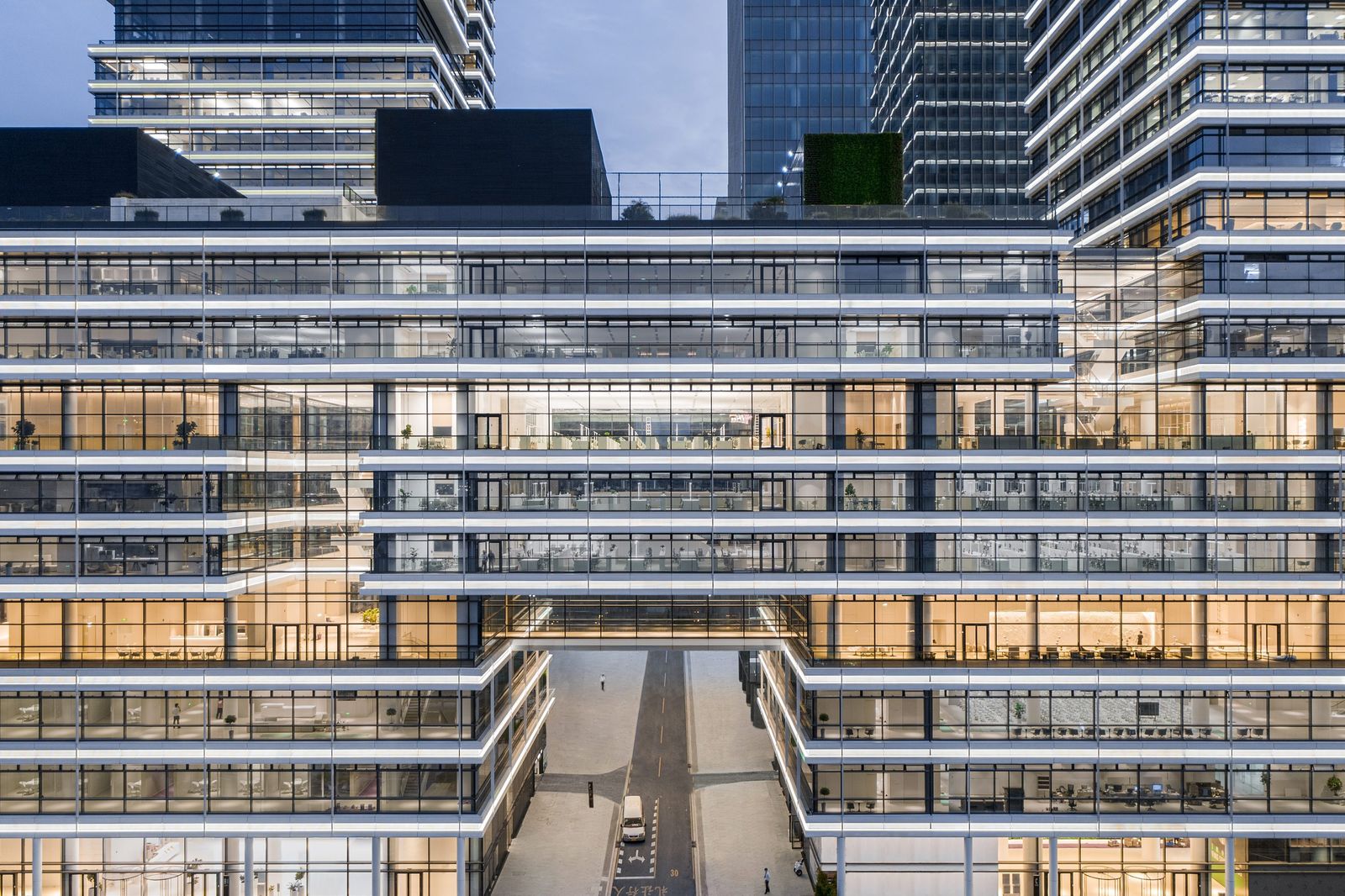 The deliberately plain, horizontally-structured facades with floor-to-ceiling glazing give the office complex a unified appearance, which means that the headquarters can be recognized from afar and identified as the new address of the vip.com online corporation. The horizontal layering is emphasized at night when lighting strips integrated in the facade profiles light up the building.
