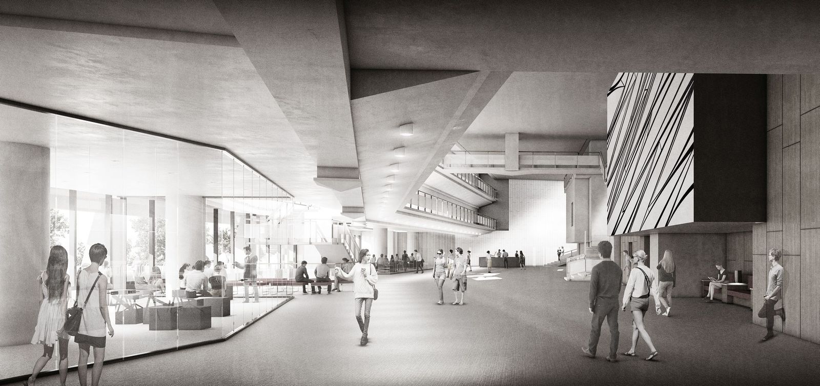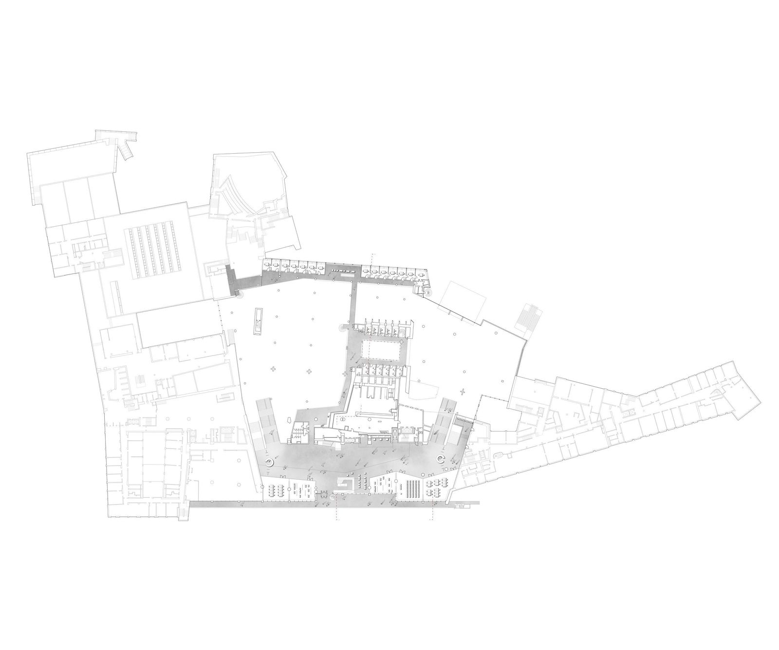 Further substantial expansion of the freely accessible areas is achieved by relocating the access control to the first floor, just in front of the reading room stairs. By doing so, the lobby space there is regained as public space and the southern entrance stair is given new life. Finally, the acoustic conditions are improved by moving noisy activities to separate rooms away from the lobby.