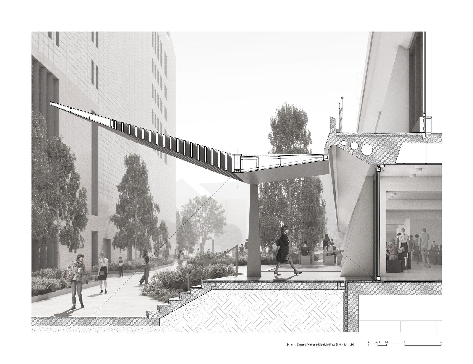 The redesigned building will be barrier-free. The lobby will be reorganized, and the former open-plan office in the eastern part of the building will be expanded into a publicly accessible area. Next to the new entrance at the northeast corner of the lobby, directly opposite Marlene-Dietrich-Platz, will be a cafeteria with 140 seats; south-facing reading terraces with views of an expanse of water located there establish fluid transitions between inside and outside. This opening out to the city is a response to the present-day urban conditions. The ground floor is also further enlivened by the placement of fixed and movable furniture that revives the building’s original spatial concept. The lobby will be expanded to include an exhibition from the collections. In addition to the conventional reading room and the rooms for group study, new event spaces, workshop areas, and informal work islands offer diversified spatial options.