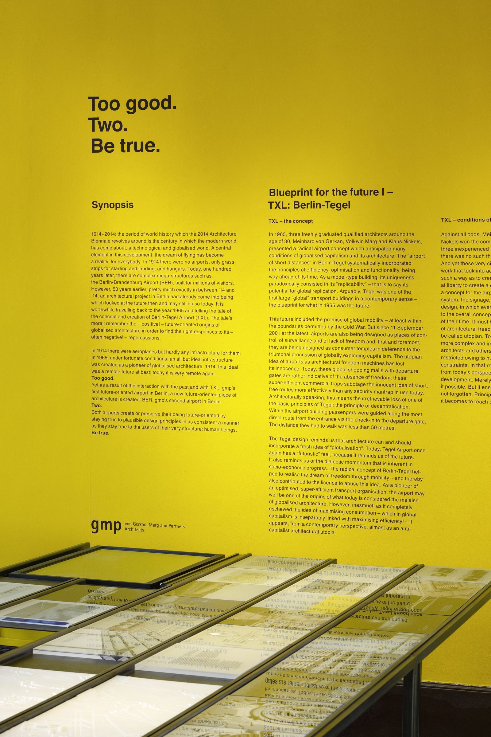 1914–2014: the period of world history which the 2014 Architecture Biennale revolves around is the century in which the modern world has come about, a technological and globalised world. A central element in this development: the dream of flying has become a reality, for everybody. In 1914 there were no airports, only grass strips for starting and landing, and hangars. Today, one hundred years later, there are complex mega-structures such as the Berlin-Brandenburg Airport (BER), built for millions of visitors.