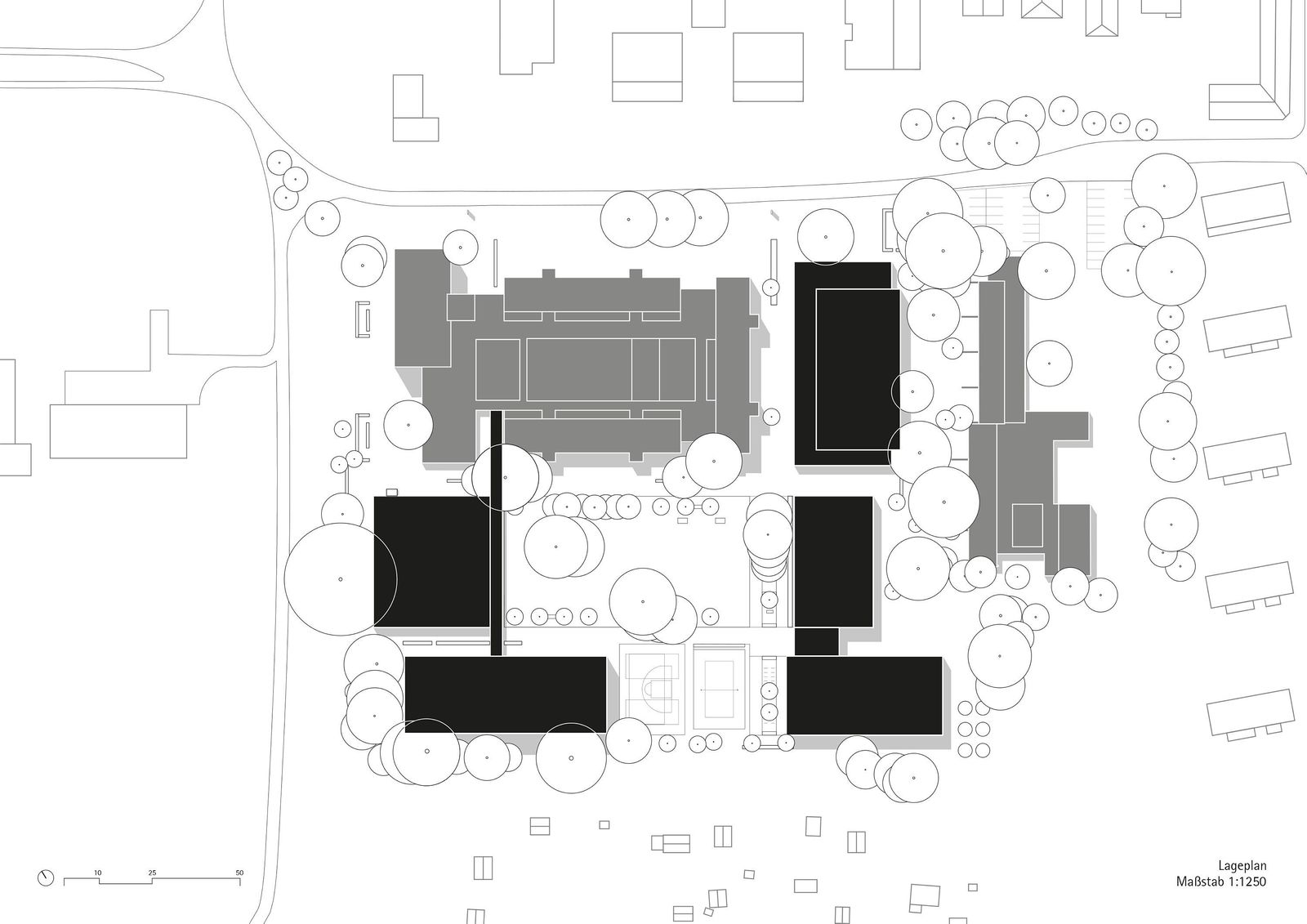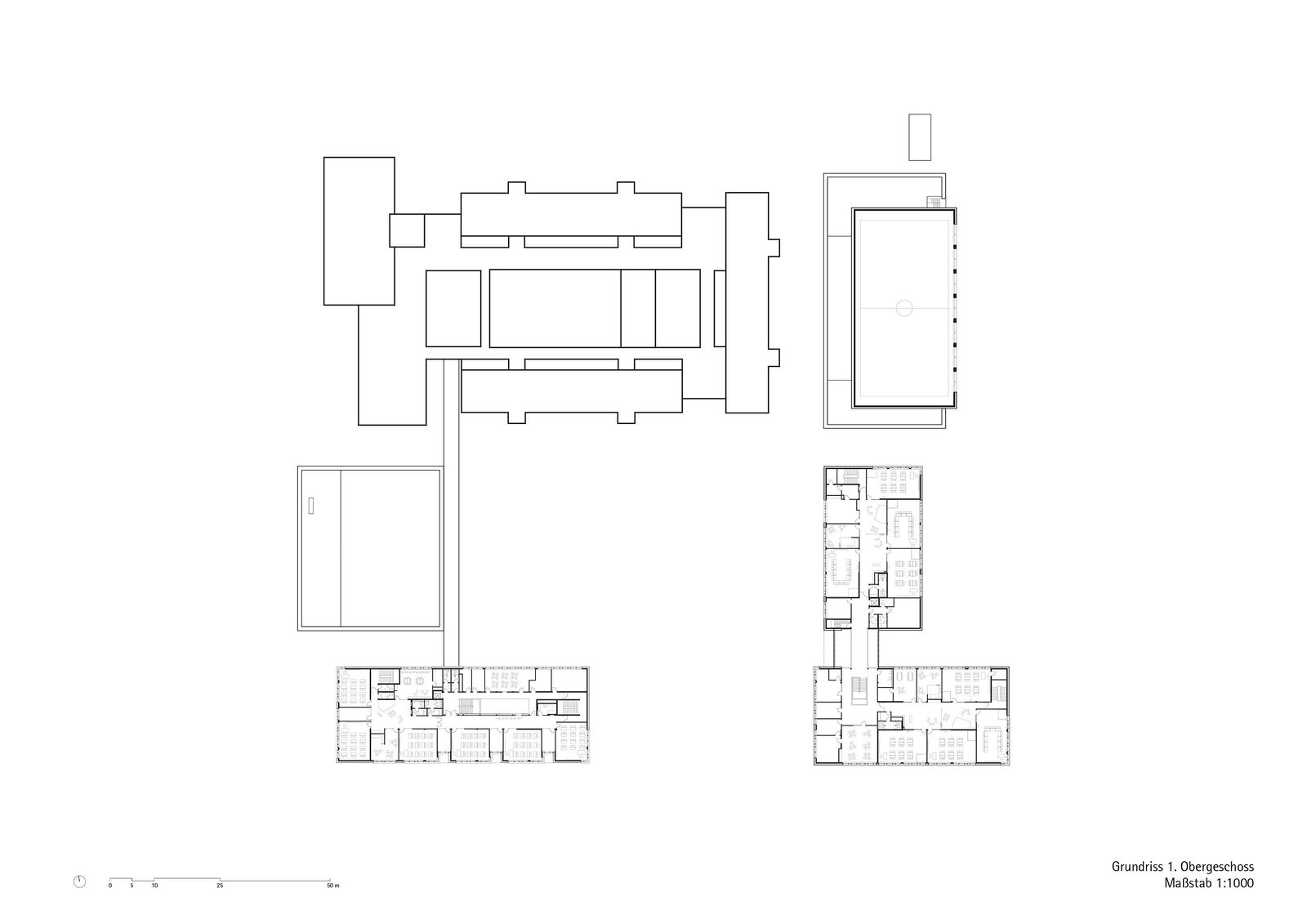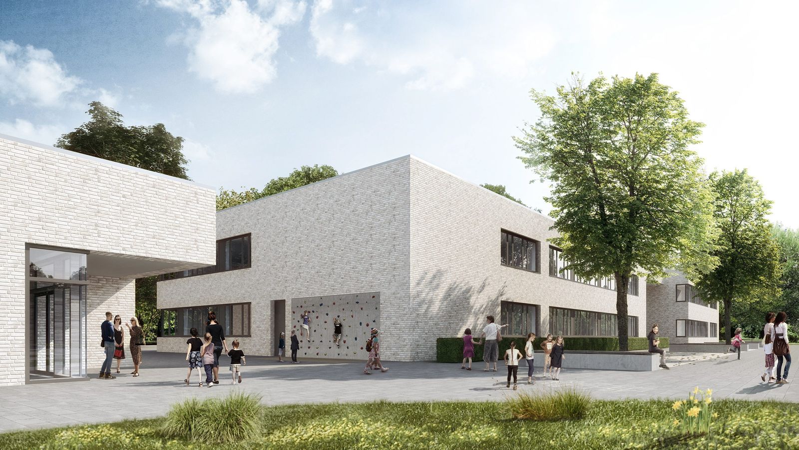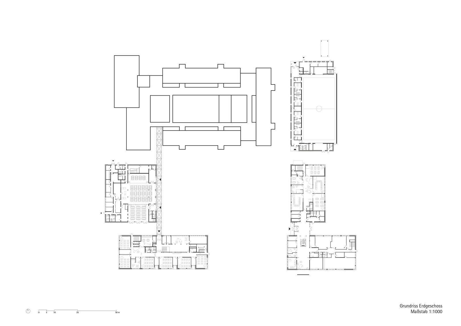 The new refectory with a square area of 1,200 square meters is the main extension building situated towards the north-west of the new open space. It not only occupies a prominent position on the campus, but is also intended to function as a venue for the entire neighborhood. The secondary school itself will be extended towards the south-west along a colonnade; there will be three classroom clusters each for six parallel classes, totaling a square area of 3,400 square meters. The existing dual purpose sports hall next to the existing building will be replaced by a new 1,200 square meter building. The plans include the new 1,200-square-meter Helene-Kaisen primary school towards the south-east, which will cater for four parallel classes.
