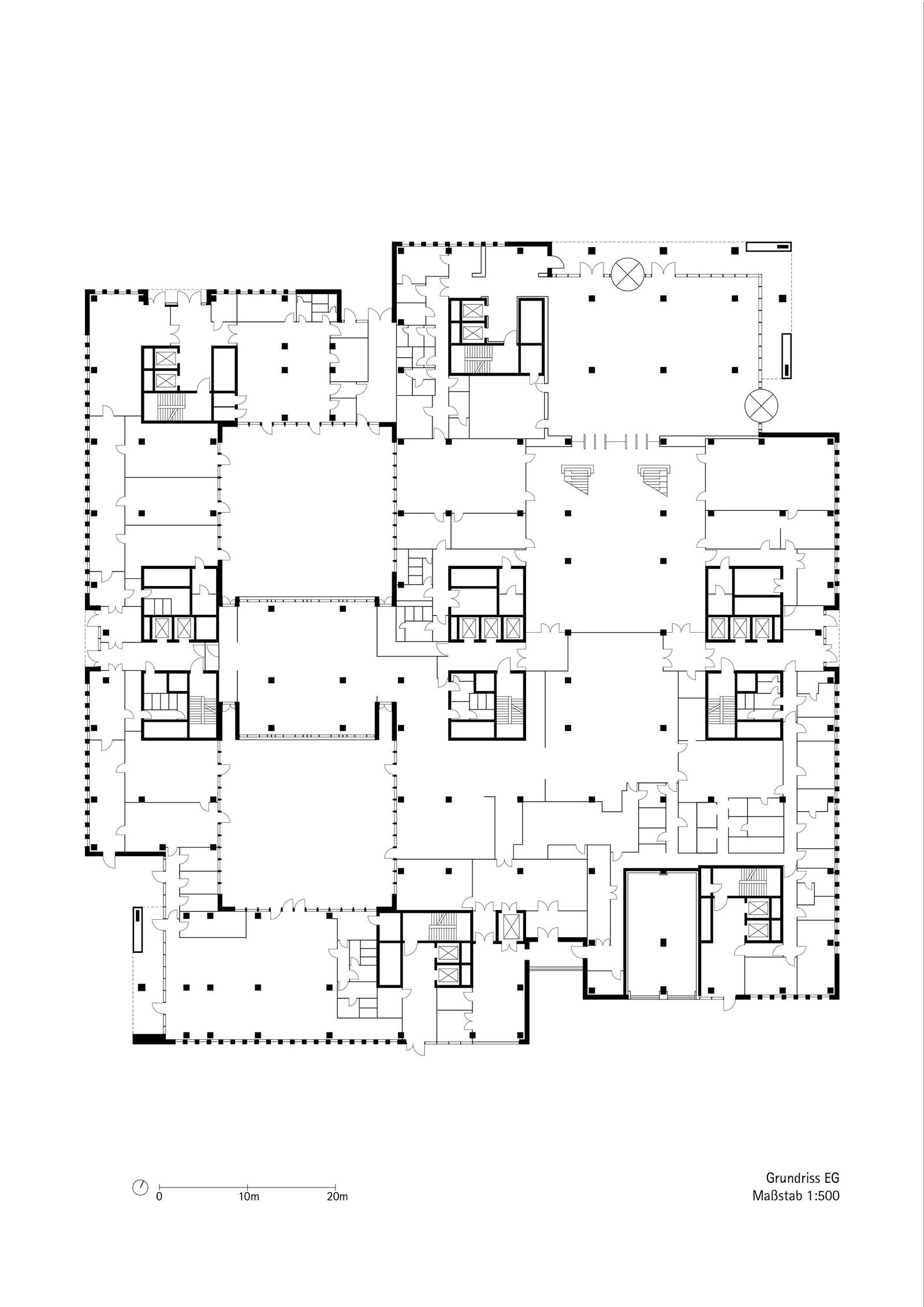 The main entrances of the headquarters at Wendenstrasse and Heidenkampsweg lead to a large foyer that—in the form of a roofed atrium—provides access to the campus. An open staircase leads to the training and conference center floor. The internal organization of the building complex is based on a total of seven circulation cores that are evenly distributed across the development. There are clearly defined areas for offices and multi-functional rooms with a depth of 14.50 meters, with natural daylight from two sides. The depth of the functional units lends itself to a triple-loaded layout with offices in the outer zones and a middle zone for special functions and think tank meeting rooms. The offices have allocated meeting areas and creative zones located in the six- and eight-story link buildings.