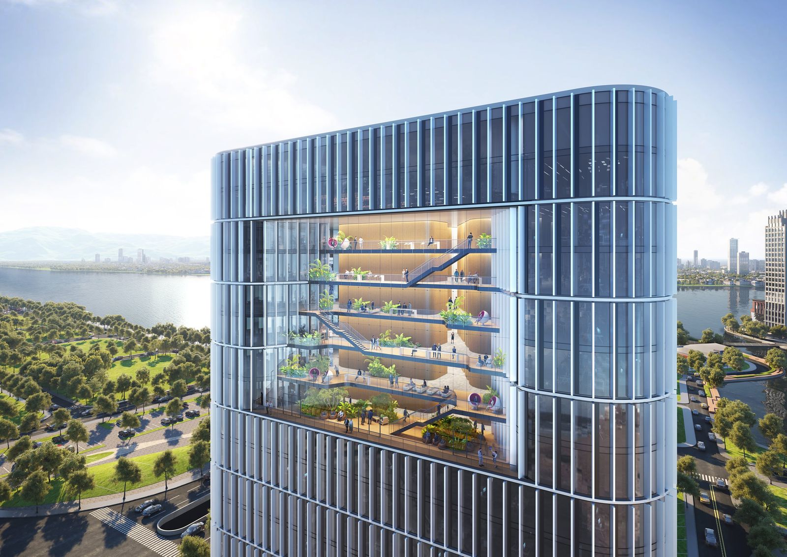 Da Nang, the coastal city in Vietnam’s central region, is an important commercial, political, and administrative center. The site for the project in the Hai Chau district lies between the airport and the historic city center at the intersection of two main transport arteries. The design by gmp provides V-shaped floor plans with central circulation cores for the two high-rise towers. The high-rises are placed offset from each other on the site, thus allowing an unobstructed view from all stories in all directions across the city landscape and the Hàn River. The multistory “sky windows” in the facade are the prominent features of the high-rises’ succinct elevations: the windows extend over several stories and are recessed inwards with large reveals angled at 60 degrees. The openings in the V-shapes create large, loggia-like recesses in the facades that can be seen from afar; they provide space for planting and are used as communication zones. The plans provide for a highly insulated facade with natural ventilation for a good room climate. The western elevations of the buildings are to have double-skin facades with integrated solar screening that would help prevent overheating of the interior when the sun is low. Furthermore, the ground piles are activated in order to use ground heat as a source of renewable energy.