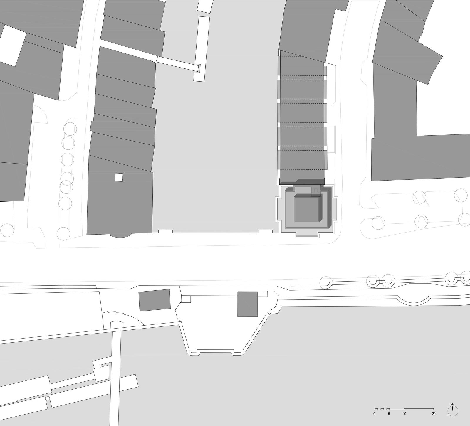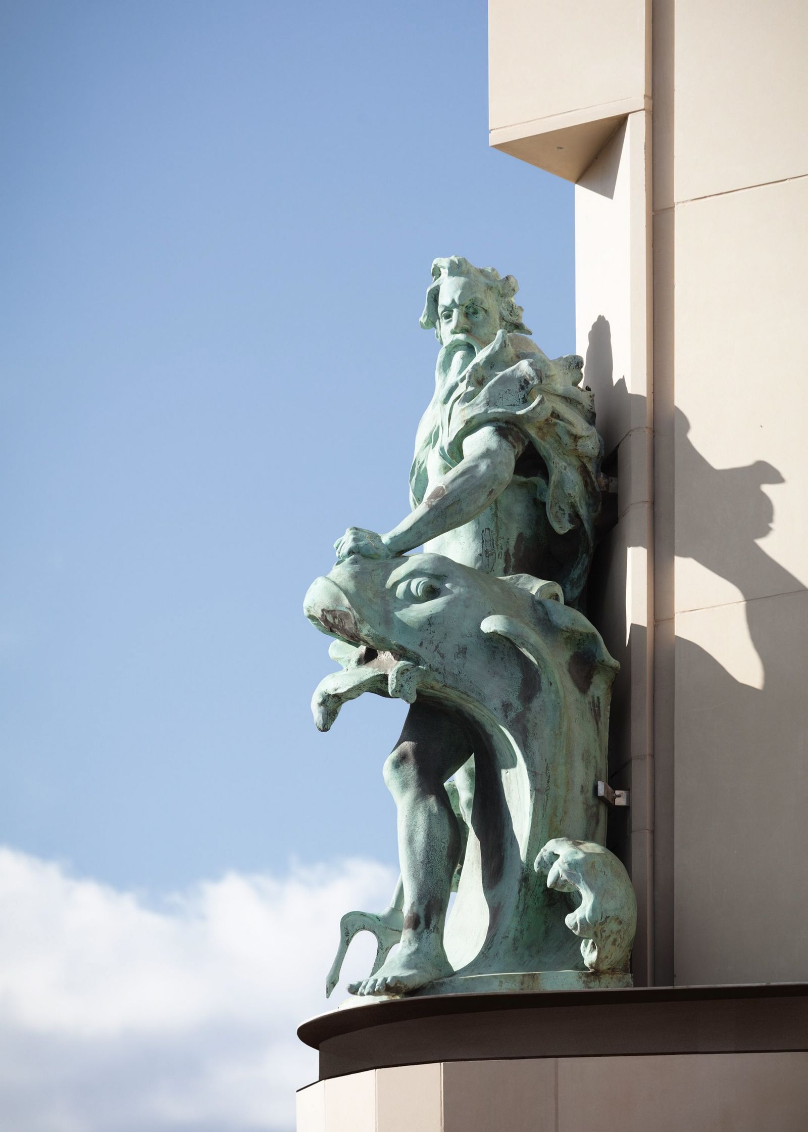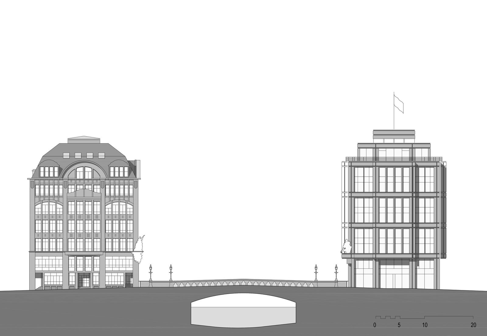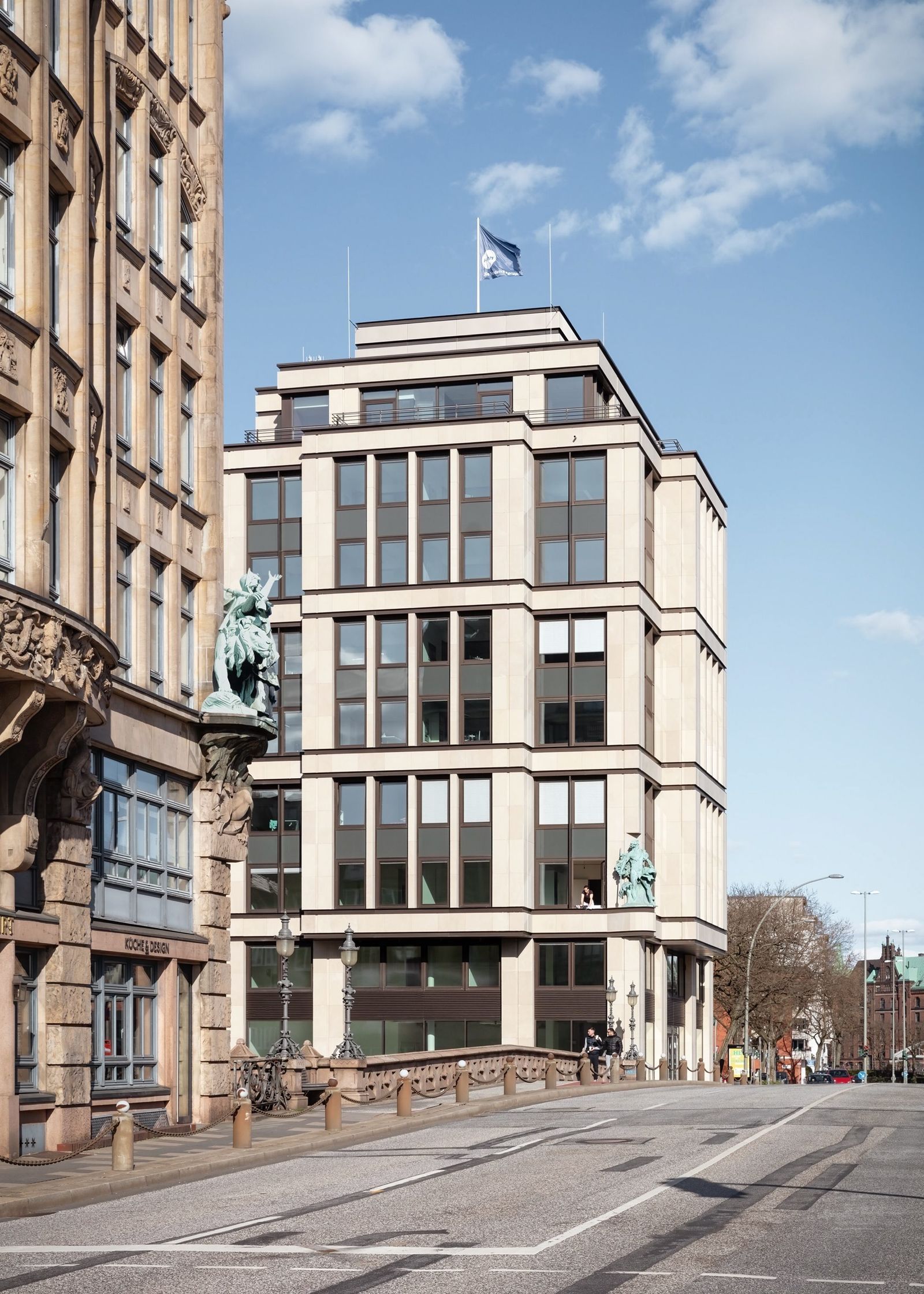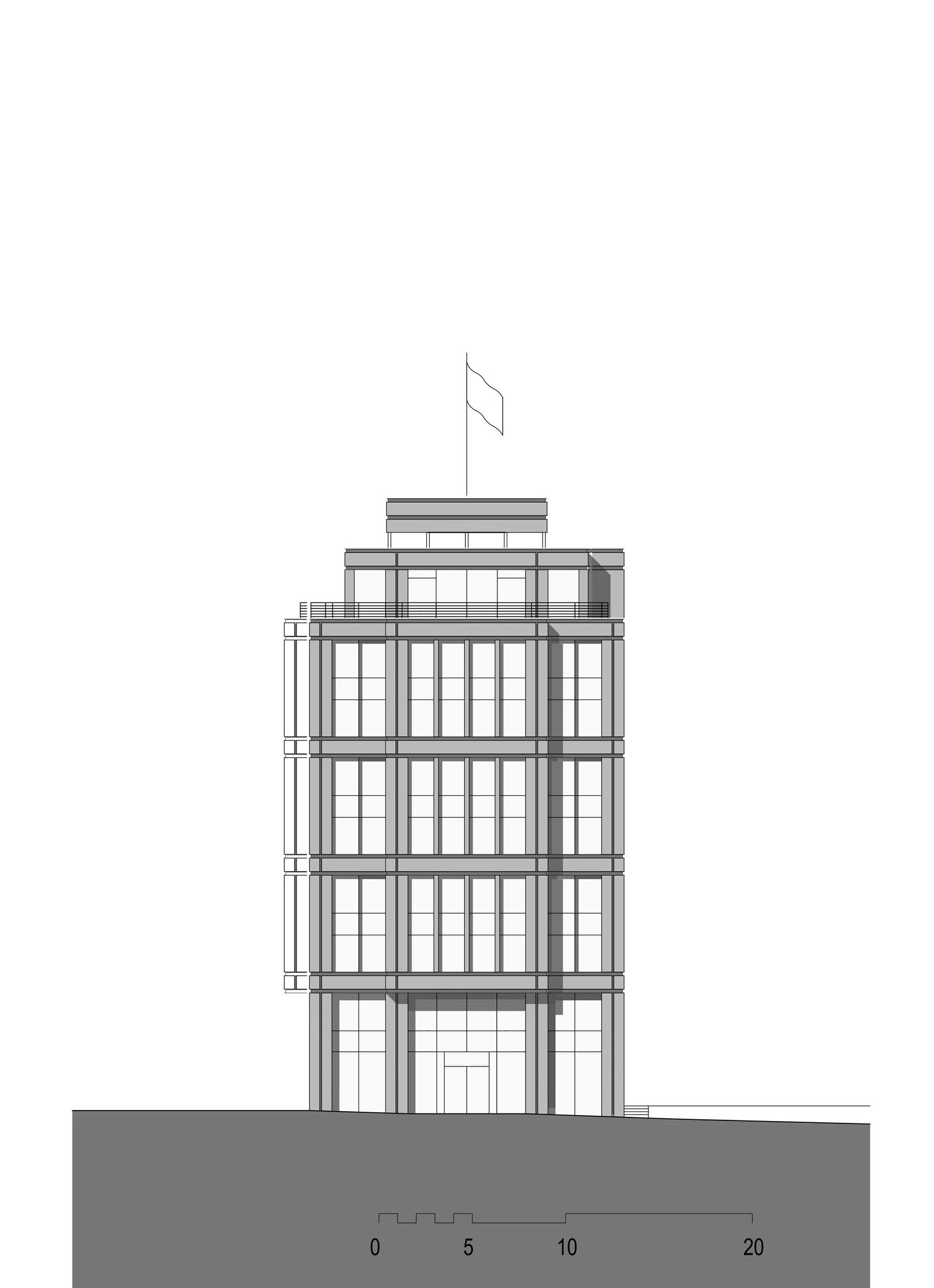 距离汉堡内湖不远的尼古莱内河畔堤岸大街坐落着汉堡仅存的一组仓库历史建筑。奠定尼古莱内河街区 面貌的大量办公建筑则多数建于20世纪初叶。堤岸大街一侧高桥畔的“航海之家”守卫着内河的入口,其对岸的 克雷蒙大街入口地块自1960年代空置至今。 为了恢复尼古莱内河入口处原有的城门式城市结构,gmp·冯·格康,玛格及合伙人建筑师事务所与 Quest投资有限公司于2016年合作进行了可事实性方案研究,并向汉堡城市建议,在“航海之家”对面空置地块 兴建一座办公和住宅建筑,弥合街区缺口。 克雷蒙1号建筑以砂岩石材立面、转角的退进比例以及修长的竖向柱角线回应了对面“航海之家”。此外新 建筑立面造型和楼层分割肌理均与相邻建于20世纪70年代的克雷蒙3号办公楼保持一致,并构成了楼群的端头 建筑。为了与“航海之家”转角汉堡守护女神哈蒙尼娅铜像相呼应,新建筑西南侧转角将装饰遗存的海神尼普顿 铜像。未来高桥所在的尼古莱内河入口处“航海之家”与新建的“尼普顿海神之家”遥相呼应,一对铜像“哈蒙尼娅 与尼普顿”寓意着古老的汉萨自由市汉堡与世界的连接。 建筑主体结构施工将于2019年12月完成,预计2020年夏天将全面竣工。