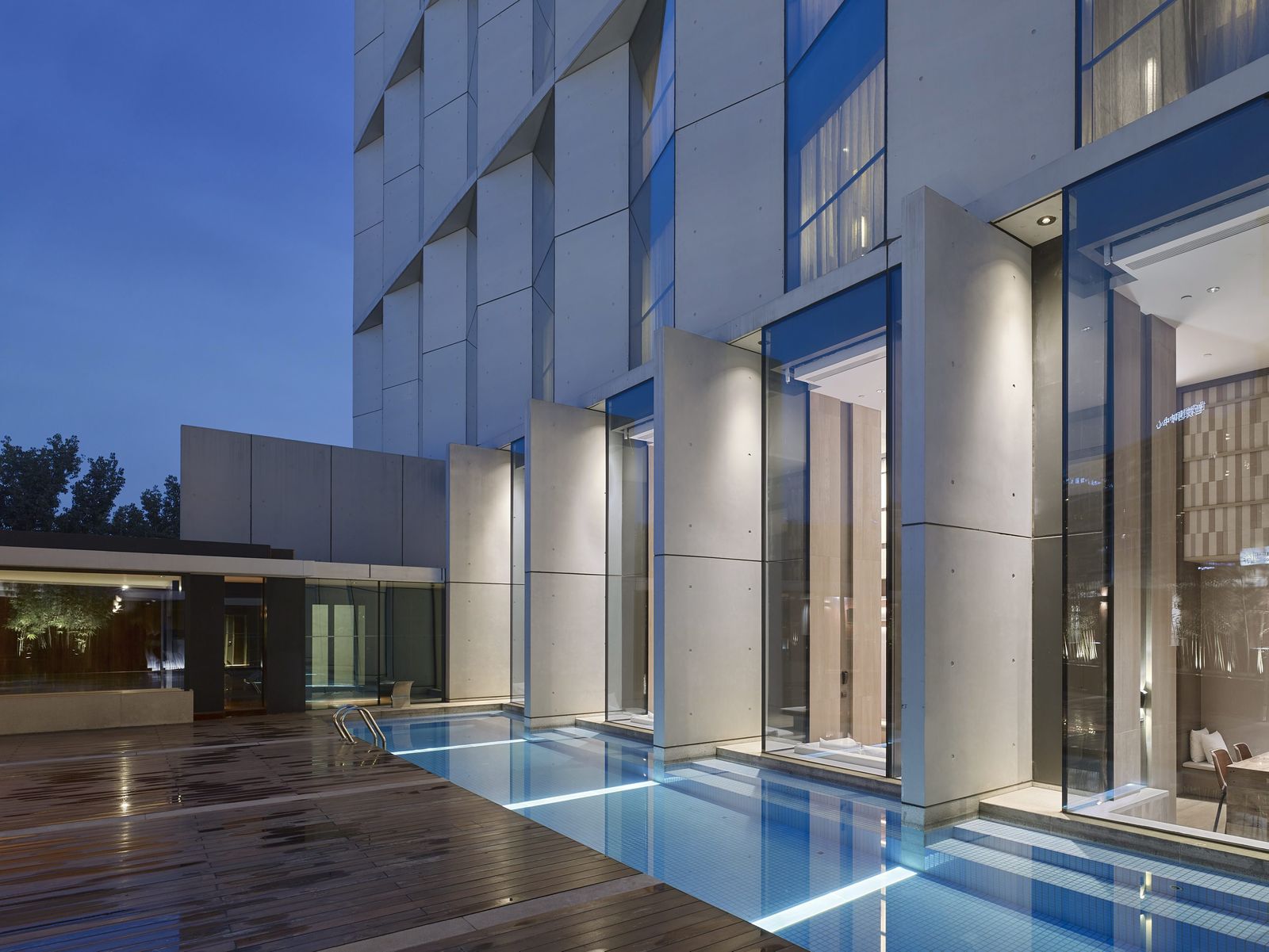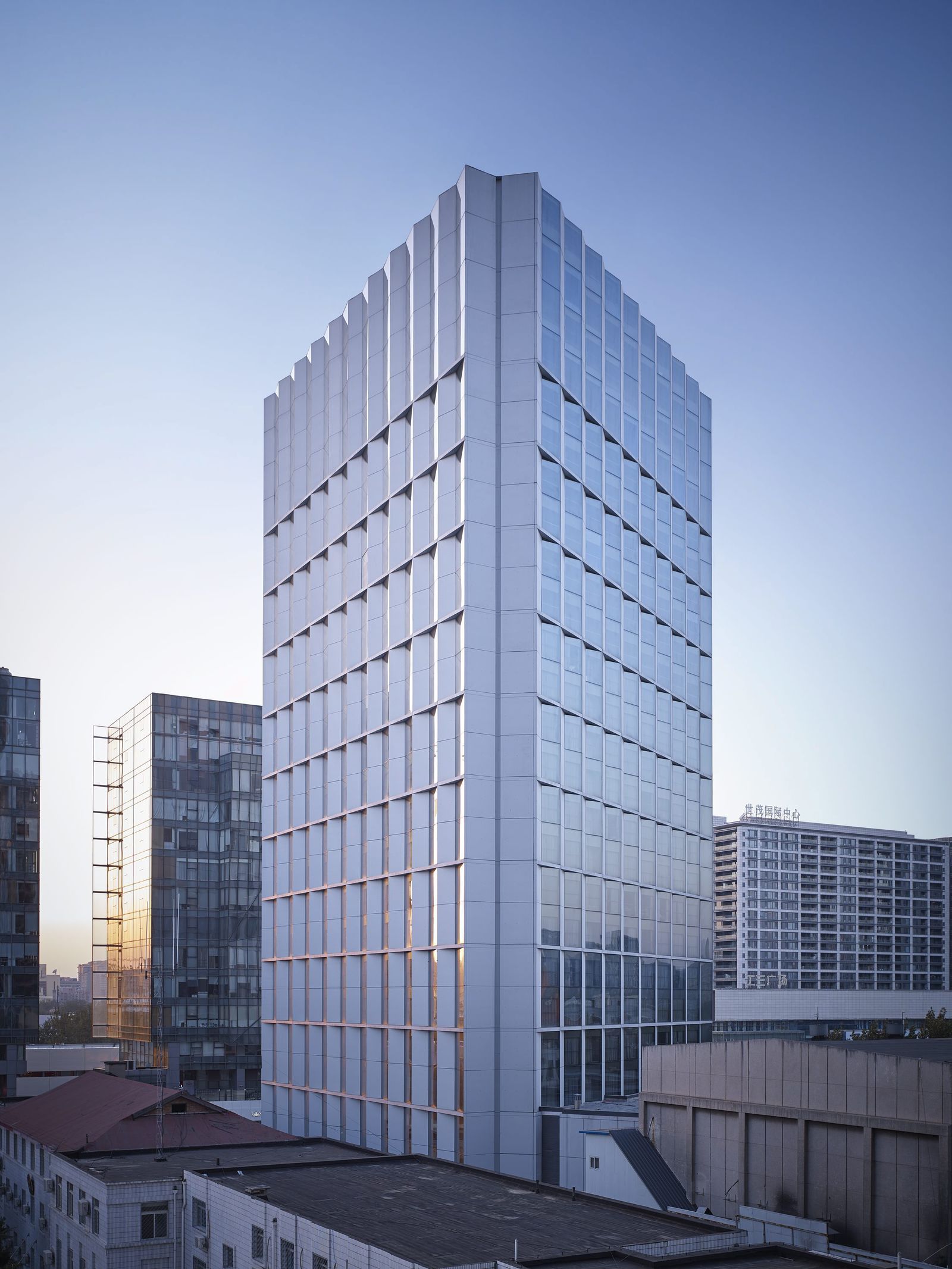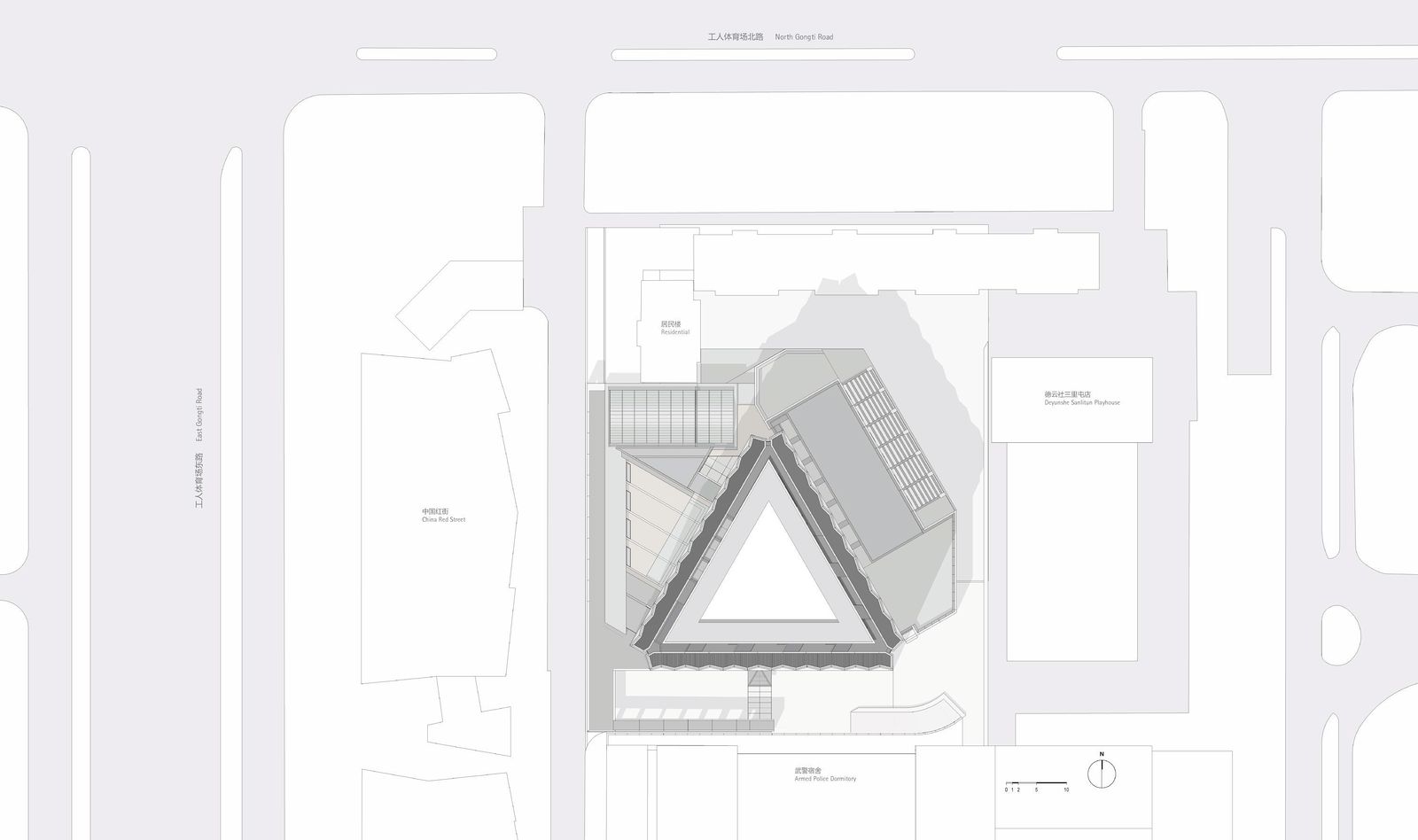 北京三里屯CHAO巢酒店由gmp·冯·格康,玛格及合伙人建筑师事务所进行了现代化改造,改造后的酒店塔楼 轻盈优雅,具有雕塑感,令人印象深刻。立面玻璃幕墙与混凝土构成的竖向折叠肌理虚实交替,产生特殊的 光影效果,每两层为一单元的横向分隔,比例均衡。除外立面改造,同为gmp设计的多功能“日光礼堂”更为酒 店增添了一个极具氛围感的活动空间。 CHAO巢酒店前身是上世纪九十年代建成的“北京城市饭店”,它的外形与城市环境异质冲突是北京快速城 市化进程的历史见证。gmp的立面设计旨在塑造一个具有现代性和可持续性的酒店建筑,同时重新定义塔楼在 城市景观中的地位。这座80米高的酒店自2016年改造完成重新开业以来,几乎成为北京三里屯商圈最热门的 目的地之一。 极富识别度的折叠状幕墙包裹着26层高的塔楼,塔楼平面呈三角形。浅灰色玻璃纤维混凝土与灰色玻璃 被交替悬挂布置,使得建筑的三个立面从不同角度望去都有由虚到实的变幻效果。每两层为一个单元设置纤 细的横向玻璃纤维混凝土分隔,营造了和谐的立面肌理。折叠幕墙及通高的落地大窗保证客房私密性的同时 在一定程度上面向城市空间开放,实现了独一无二的空间质感。 塔楼立面的材料和结构逻辑也延续到了酒店扩建出的入口区域。与幕墙相同的玻璃纤维混凝土饰面板构 成10米高柱廊在建筑的西侧和南侧限定出入口空间,同时在南侧围合出半开放庭院。原本酒店的入口较为隐 蔽,垂直饰面板以不同的角度扭转,直观地将酒店客人由繁忙的工人体育场北路引导至酒店入口。 同样由gmp改造设计的日光礼堂也沿用了立面设计的清晰逻辑。拱形结构支撑起一座双层屋顶,外层为 玻璃顶盖,日光通过内层格栅衍射进入大厅,空间由此得名“日光礼堂”。格栅具有防晒、削弱直射光线以及吸 收噪音等功能。混凝土拱顶与木质格栅的组合呈现出富有戏剧性的光影效果,强调了空间结构沉静的力量感 和庄严的氛围。