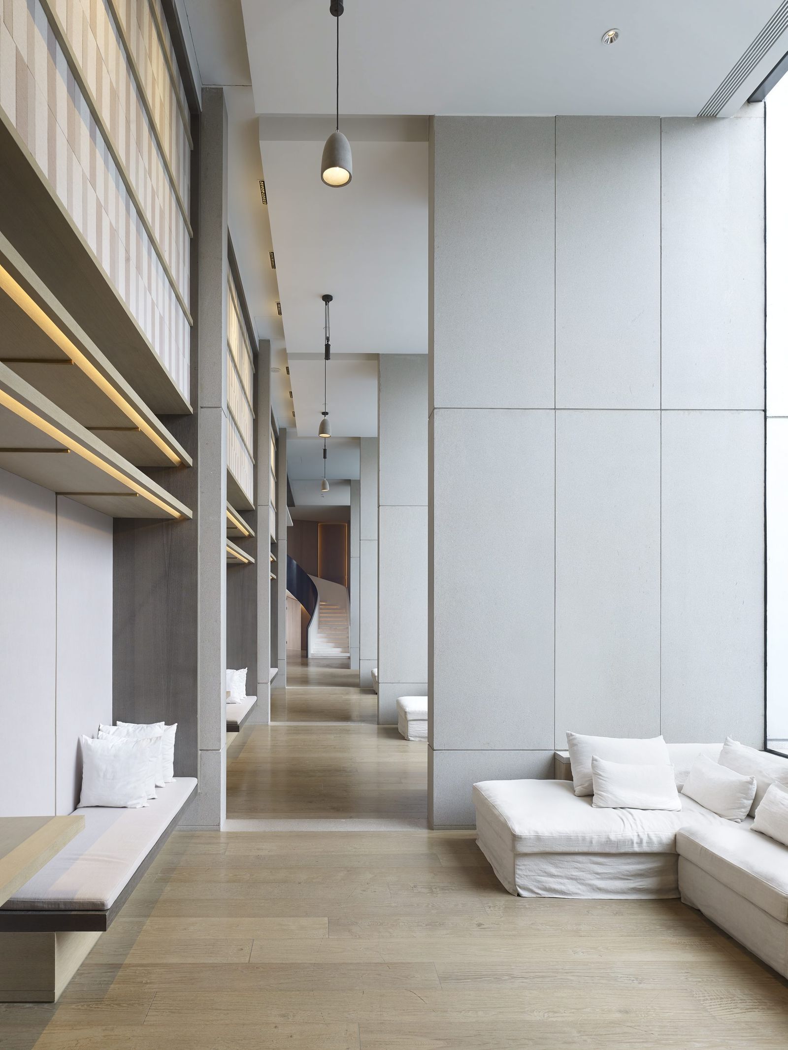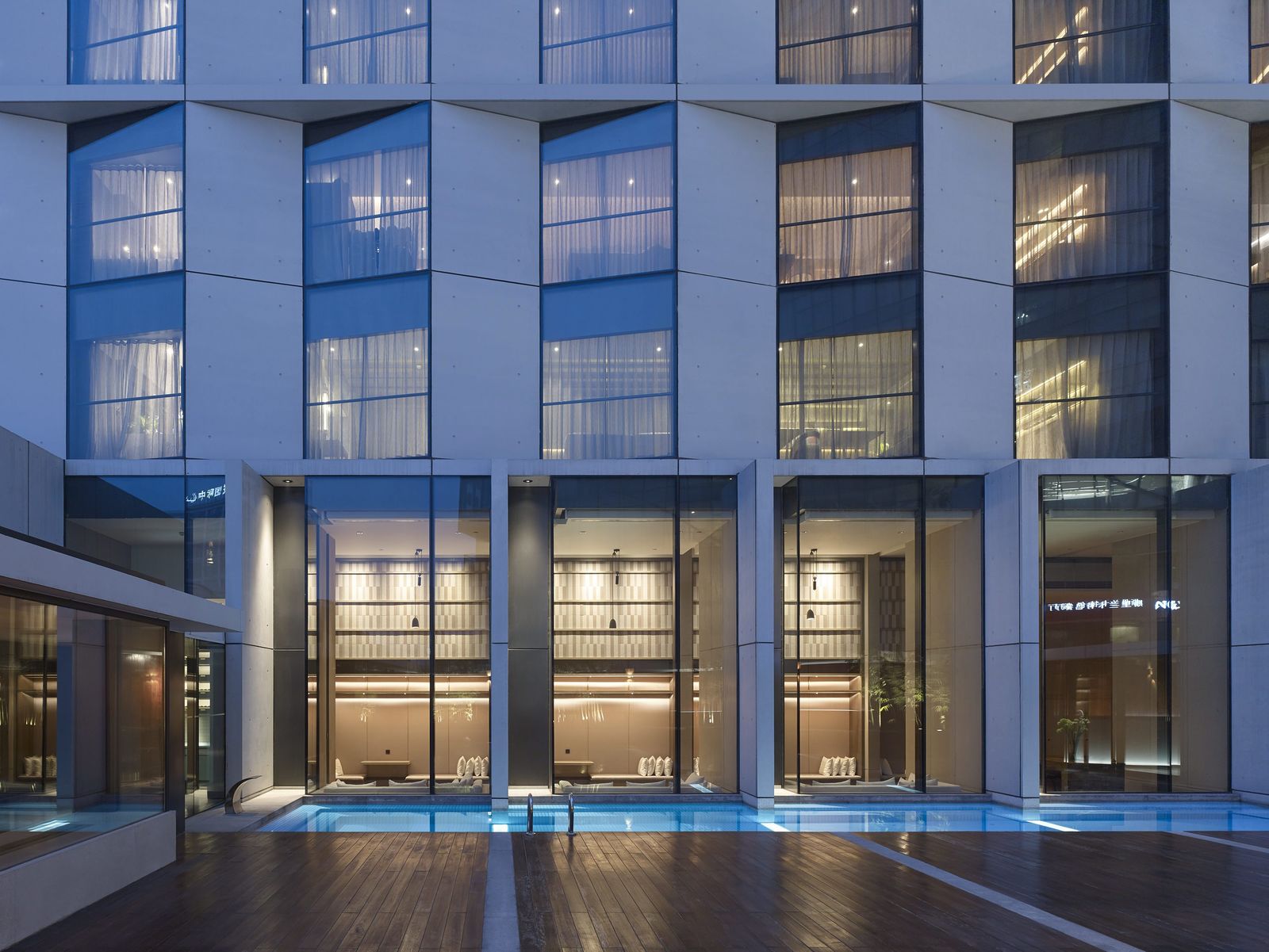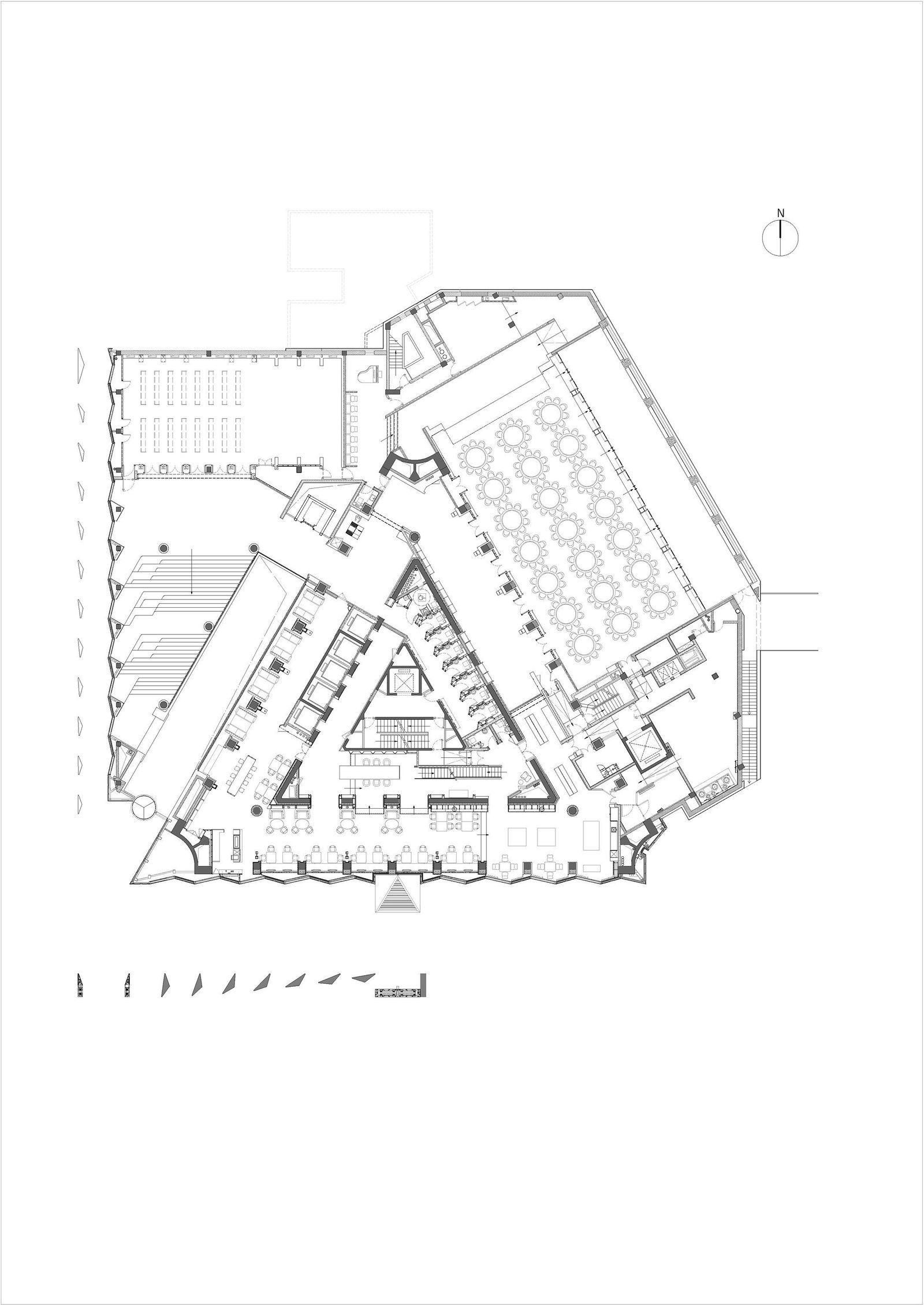 北京三里屯CHAO巢酒店由gmp·冯·格康,玛格及合伙人建筑师事务所进行了现代化改造,改造后的酒店塔楼 轻盈优雅,具有雕塑感,令人印象深刻。立面玻璃幕墙与混凝土构成的竖向折叠肌理虚实交替,产生特殊的 光影效果,每两层为一单元的横向分隔,比例均衡。除外立面改造,同为gmp设计的多功能“日光礼堂”更为酒 店增添了一个极具氛围感的活动空间。 CHAO巢酒店前身是上世纪九十年代建成的“北京城市饭店”,它的外形与城市环境异质冲突是北京快速城 市化进程的历史见证。gmp的立面设计旨在塑造一个具有现代性和可持续性的酒店建筑,同时重新定义塔楼在 城市景观中的地位。这座80米高的酒店自2016年改造完成重新开业以来,几乎成为北京三里屯商圈最热门的 目的地之一。 极富识别度的折叠状幕墙包裹着26层高的塔楼,塔楼平面呈三角形。浅灰色玻璃纤维混凝土与灰色玻璃 被交替悬挂布置,使得建筑的三个立面从不同角度望去都有由虚到实的变幻效果。每两层为一个单元设置纤 细的横向玻璃纤维混凝土分隔,营造了和谐的立面肌理。折叠幕墙及通高的落地大窗保证客房私密性的同时 在一定程度上面向城市空间开放,实现了独一无二的空间质感。 塔楼立面的材料和结构逻辑也延续到了酒店扩建出的入口区域。与幕墙相同的玻璃纤维混凝土饰面板构 成10米高柱廊在建筑的西侧和南侧限定出入口空间,同时在南侧围合出半开放庭院。原本酒店的入口较为隐 蔽,垂直饰面板以不同的角度扭转,直观地将酒店客人由繁忙的工人体育场北路引导至酒店入口。 同样由gmp改造设计的日光礼堂也沿用了立面设计的清晰逻辑。拱形结构支撑起一座双层屋顶,外层为 玻璃顶盖,日光通过内层格栅衍射进入大厅,空间由此得名“日光礼堂”。格栅具有防晒、削弱直射光线以及吸 收噪音等功能。混凝土拱顶与木质格栅的组合呈现出富有戏剧性的光影效果,强调了空间结构沉静的力量感 和庄严的氛围。