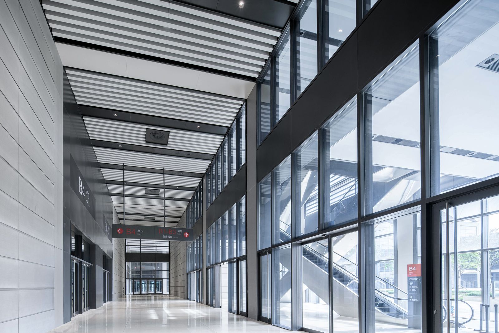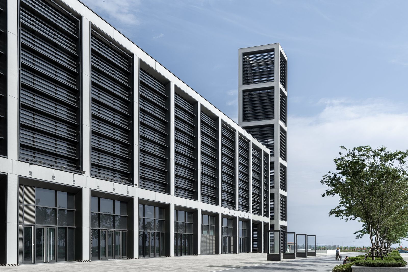 浅色波浪状膜结构屋面结合全玻璃幕墙立面打造入口大厅主体形象,在视觉和空间上强调了繁华城市景观和海岸自然风光之间的联系。夜幕降临,气势非凡的膜结构屋面被灯光点亮,在远处便具有很高的辨识度。主大厅内部墙面采用了浅色横向玻璃纤维水泥面板,相同的材质语汇在展览大厅混凝土复合面板幕墙设计中得以延续。外立面采用的混凝土框架结构如同一条简明宽大的环带将会展建筑与两座塔楼连为一体。水平方向的铝合金百叶幕墙构件巧妙地遮蔽了物流通道,这一幕墙设计同时还可用于展会的多媒体展示与广告布置。