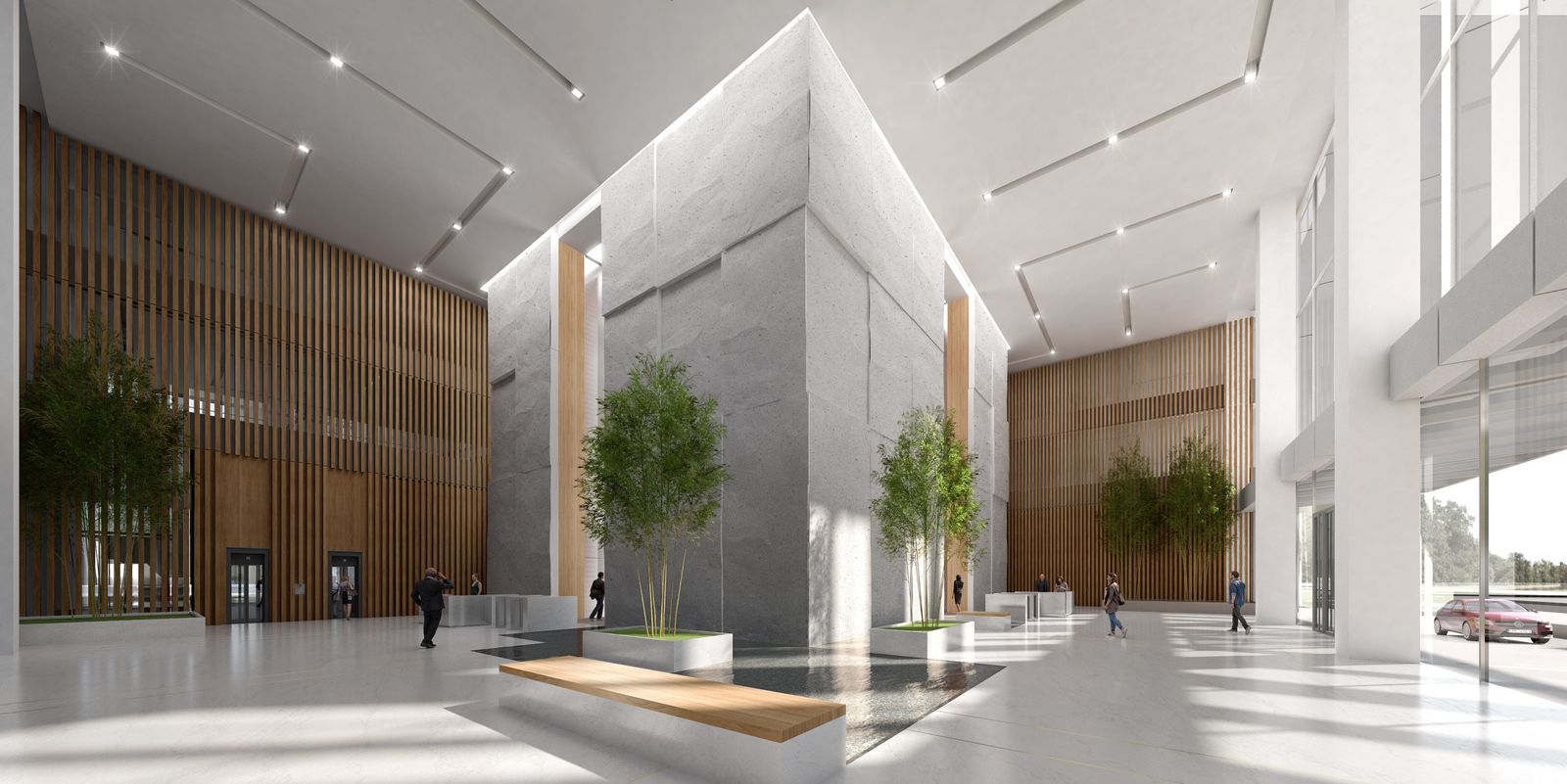 广州市中心以密集的高层建筑发展为特点。即使如此,从奇安信总部大厦未来的位置看,望向西北方向的视野并未受阻挡,从上可以饱览广州中央天际线的全景,俯瞰珠江。设计方案以“垂直城市”的概念为出发,灵感源自华山之巅的“天空之境”。通过打造高度联通的平台式立体城市景观,将宽敞的中庭纳入紧凑的塔楼结构,为员工提供休息和放松的空间。