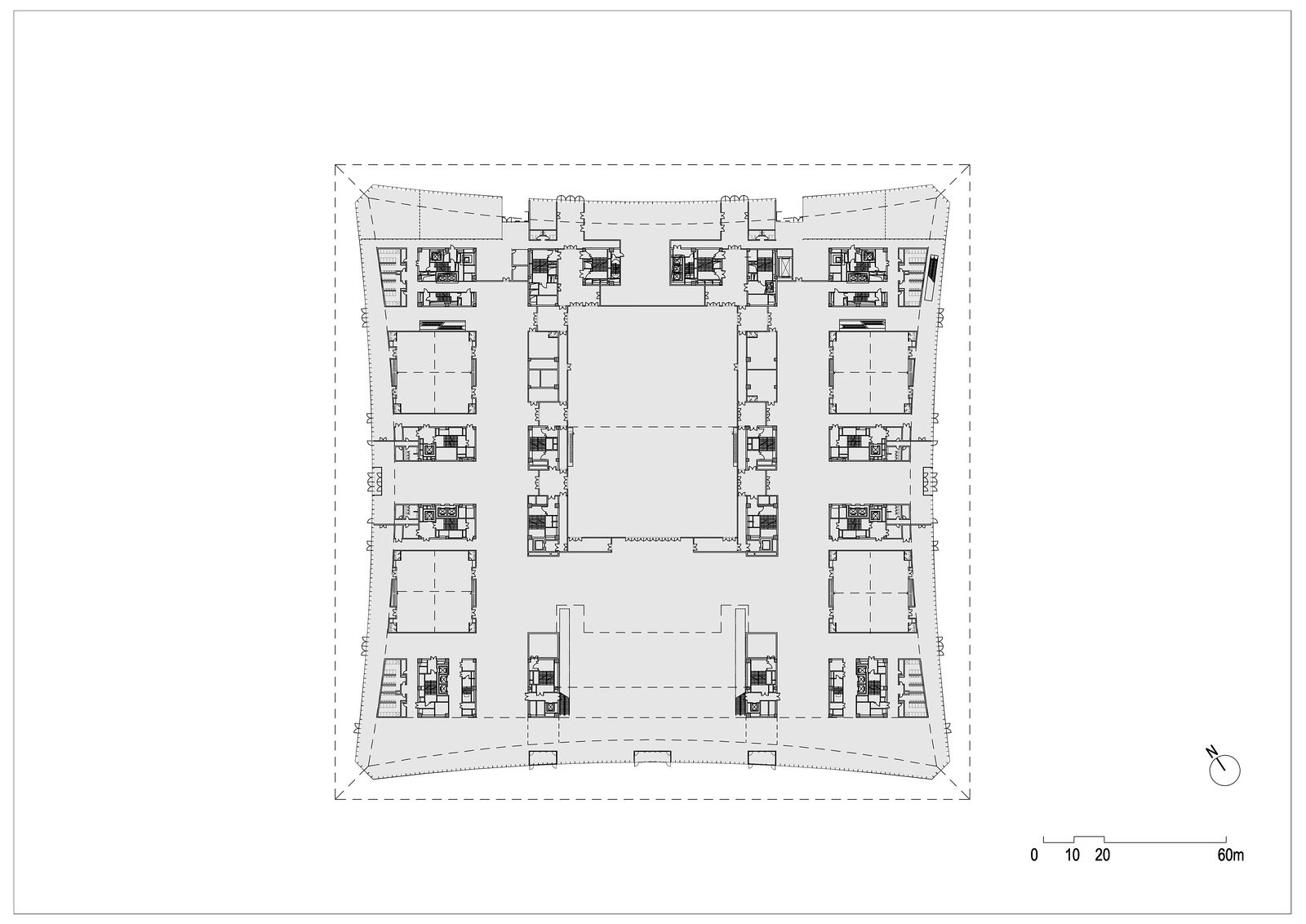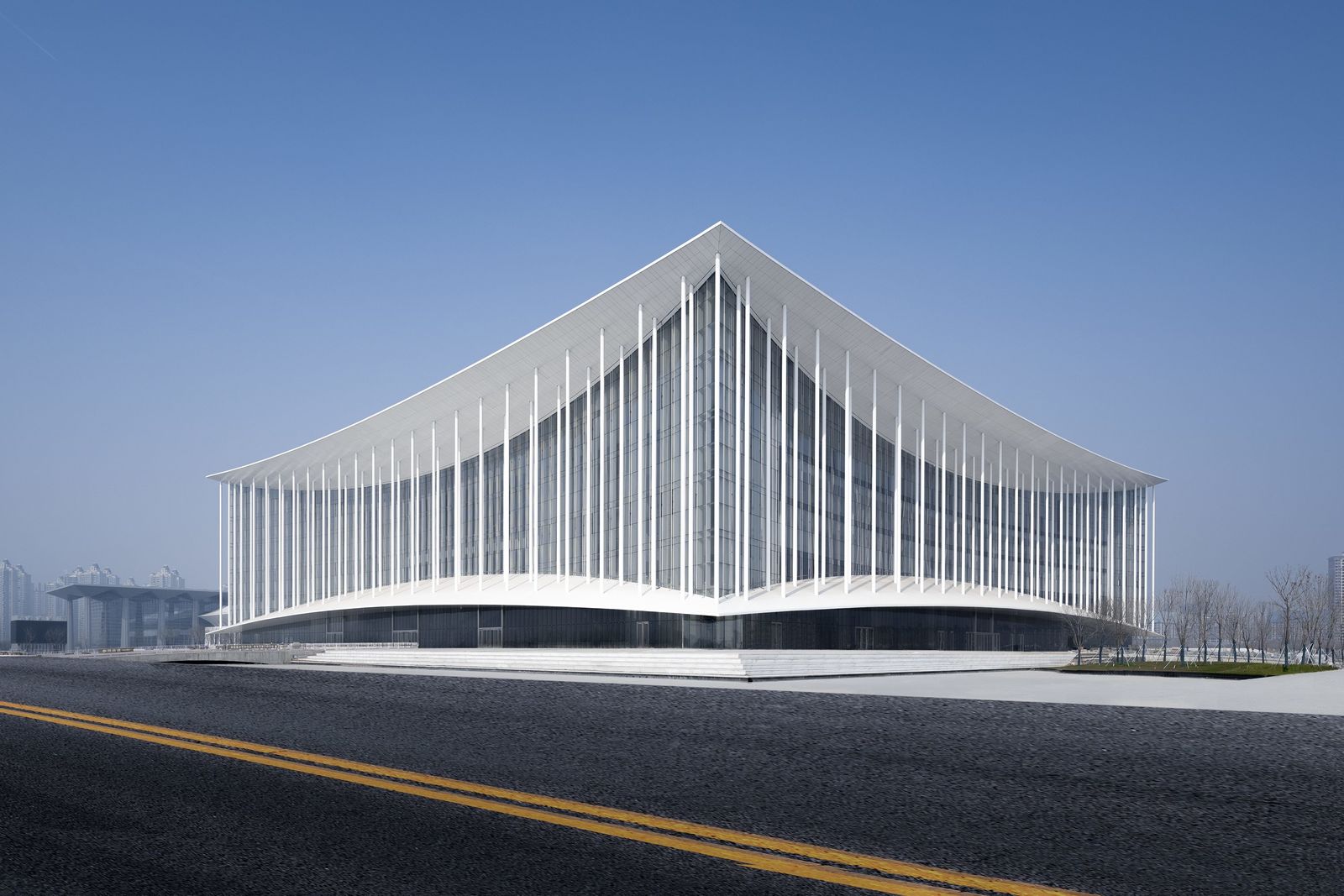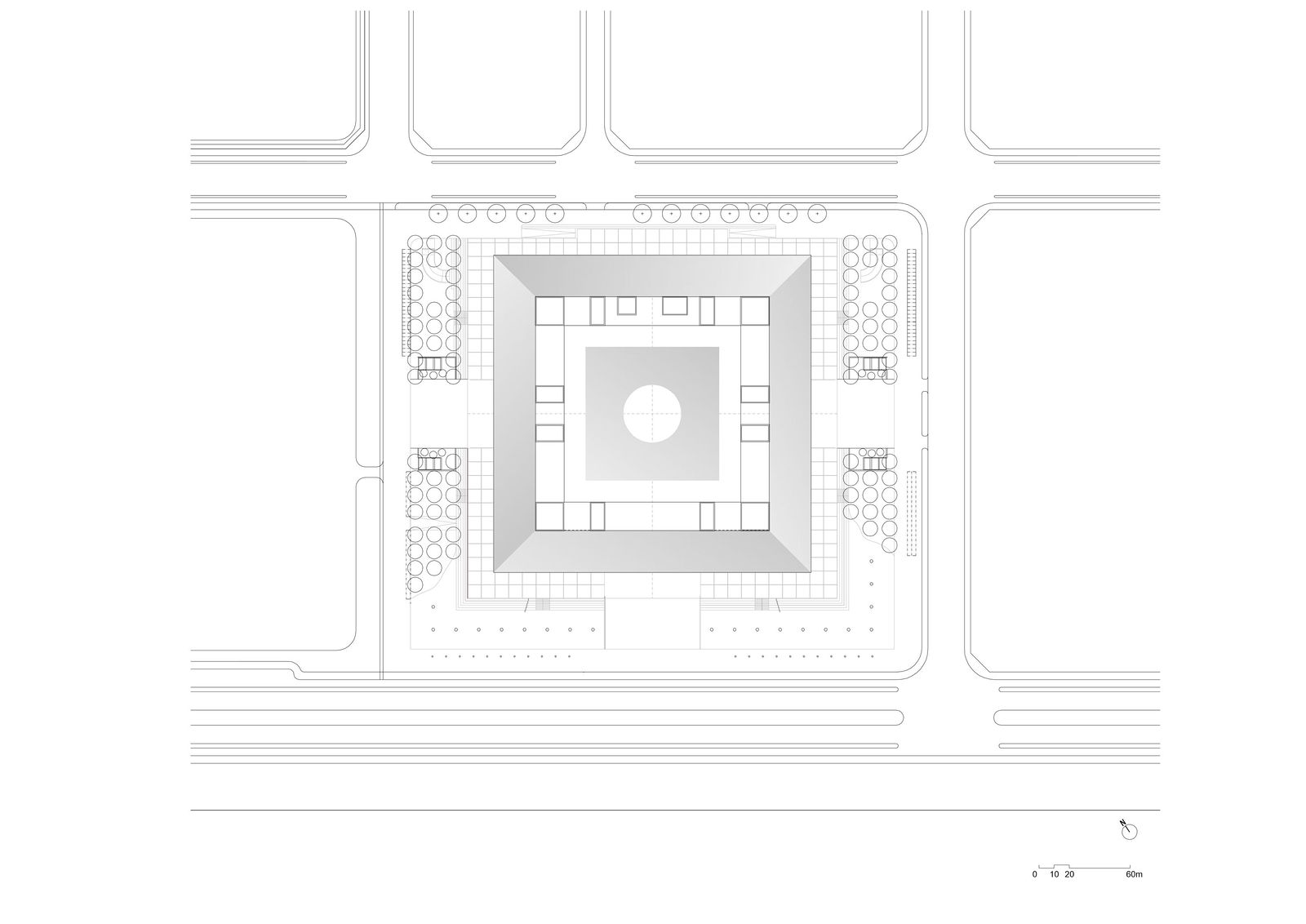 方正对称的屋面、均衡的水平向立面比例、理性规整的柱式是对中国古典建筑特征进行转译和传承。会议中心建筑以200米见方的正方形平面,与向内凹进的弧线立面形成均衡大气的建筑体量。