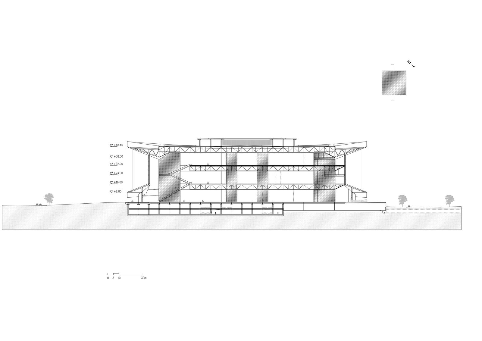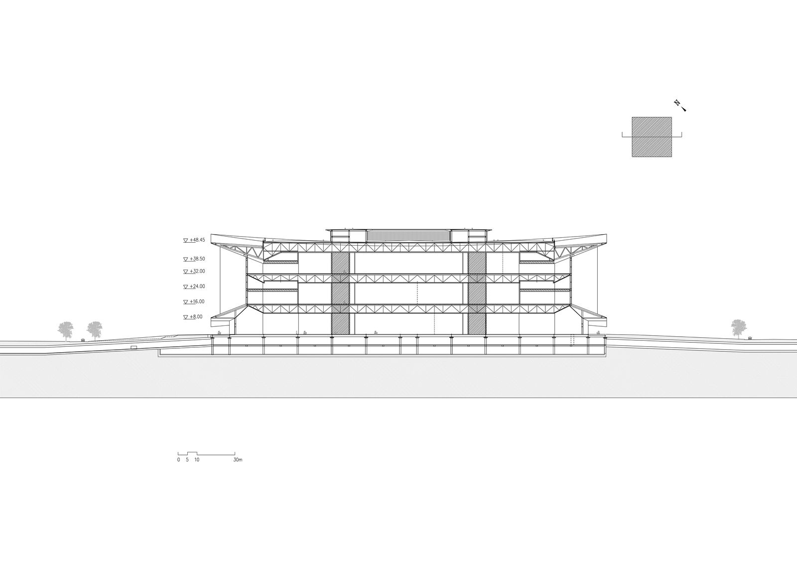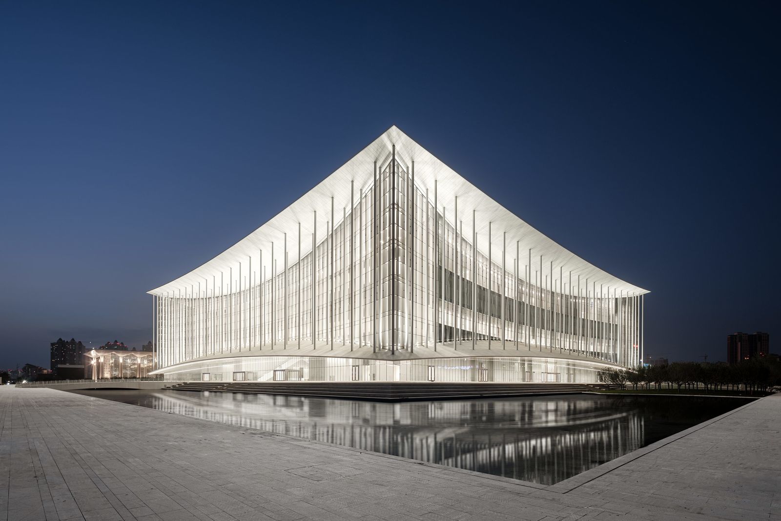 全玻璃幕墙环绕的通透的首层空间,可通过水面之上的连桥到达,建筑整体呈现悬浮的景象。这种轻盈的状态是通过独特的悬挂结构体系实现的:会议中心选用了核心筒+桁架的悬挂结构体系,满足会议功能要求的无柱空间,同时桁架向外挑出形成宽大弯曲屋面。下月牙悬挂的内凹幕墙,形成宽敞友好的入口空间。在外立面,通过屋顶桁架悬挂的180 根超纤细钢柱实现,它们的柱高在30-40米之间,直径仅为0.6米。当月牙形被照亮,会议中心成为了西安滨河的标志景观。