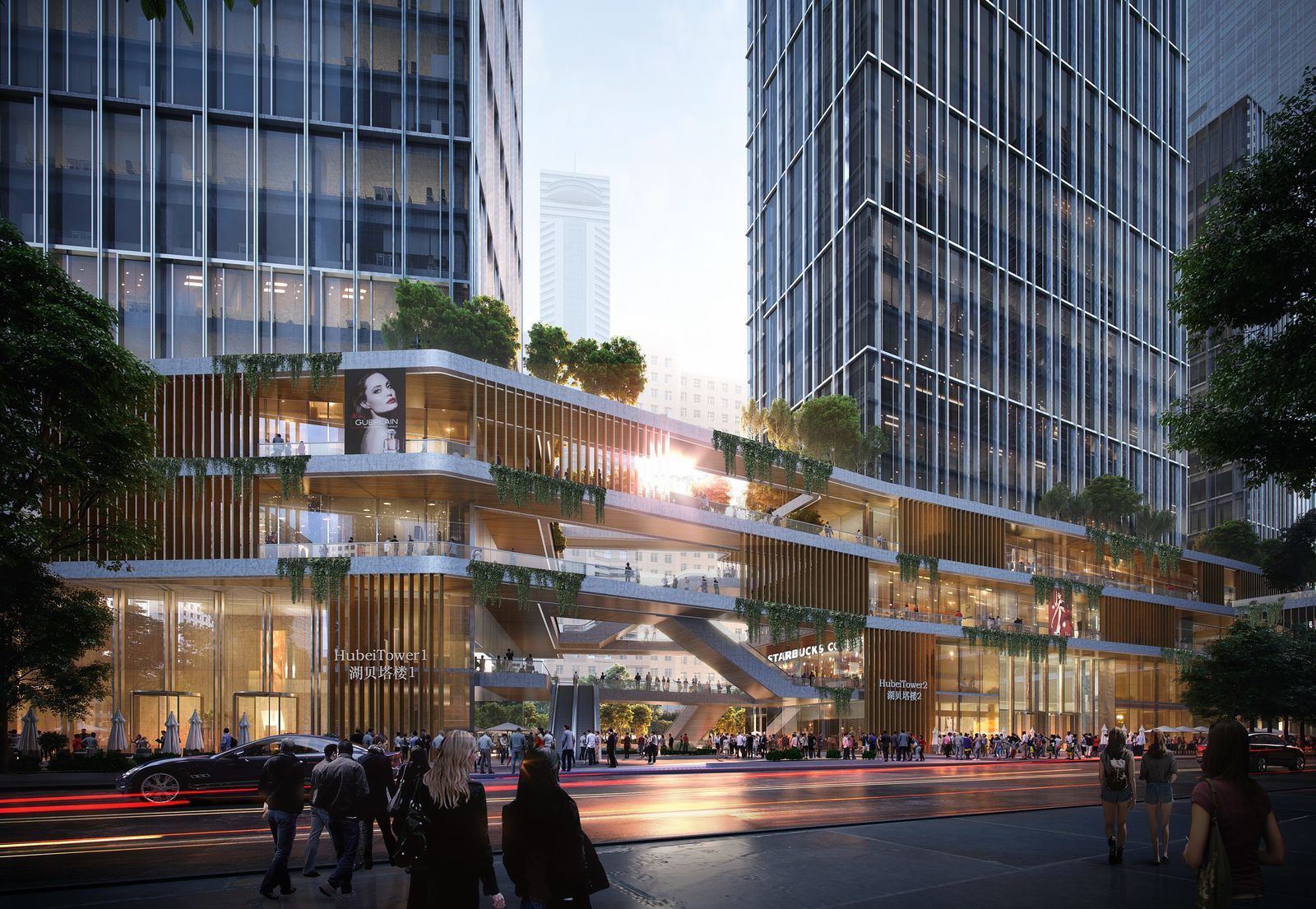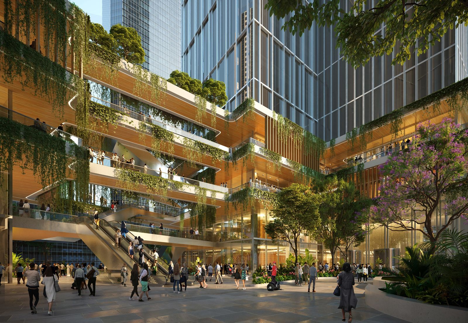 成排的办公楼之间的绿色空间是gmp设计的出发点。 塔楼间的道路使用频繁,连接园区与深南东路及罗湖站。这些绿色的“生长线”适合行人尺度,同时在垂直方向上作为绿色空间继续延续,高层立面上的后退形成宽敞的空中大厅和郁郁葱葱的空中花园。