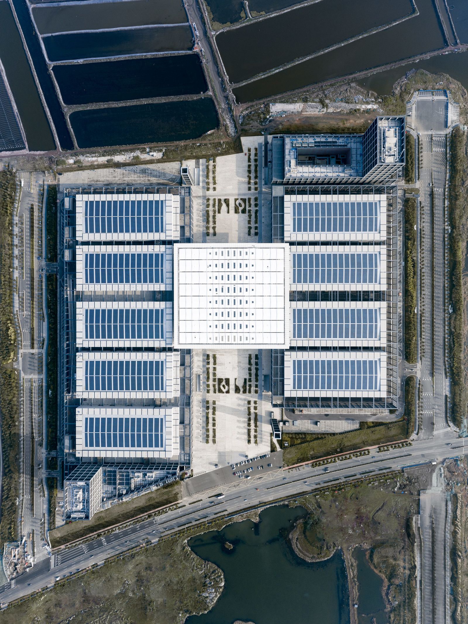 红岛国际会议展览中心拥有14座展览大厅,其中西翼四座单层展厅,东翼十座双层展厅,单个展览大厅面积约为1万平方米。西翼大厅拥有净高18米的无柱空间,为大型展品创造了极佳的展出条件。展会建筑功能齐备,营造了典雅庄重的场所感,来访者可以通过连接入口大厅的连廊直接进入展览厅,为造访会议提供了便利。会展中心的道路交通布局明确地隔离来访人流和货运流线,保证了同时举行或平行布置若干展会活动的需求。货运区域环绕会展中心按照顺时针方向布置,西北和东南方位设有中央安全闸门。非访客可见的通道连接着不同展厅,可实现建筑纵深一侧的货运装卸。载重货车可以通过位于东侧的坡道到达位于二层之上的展厅。