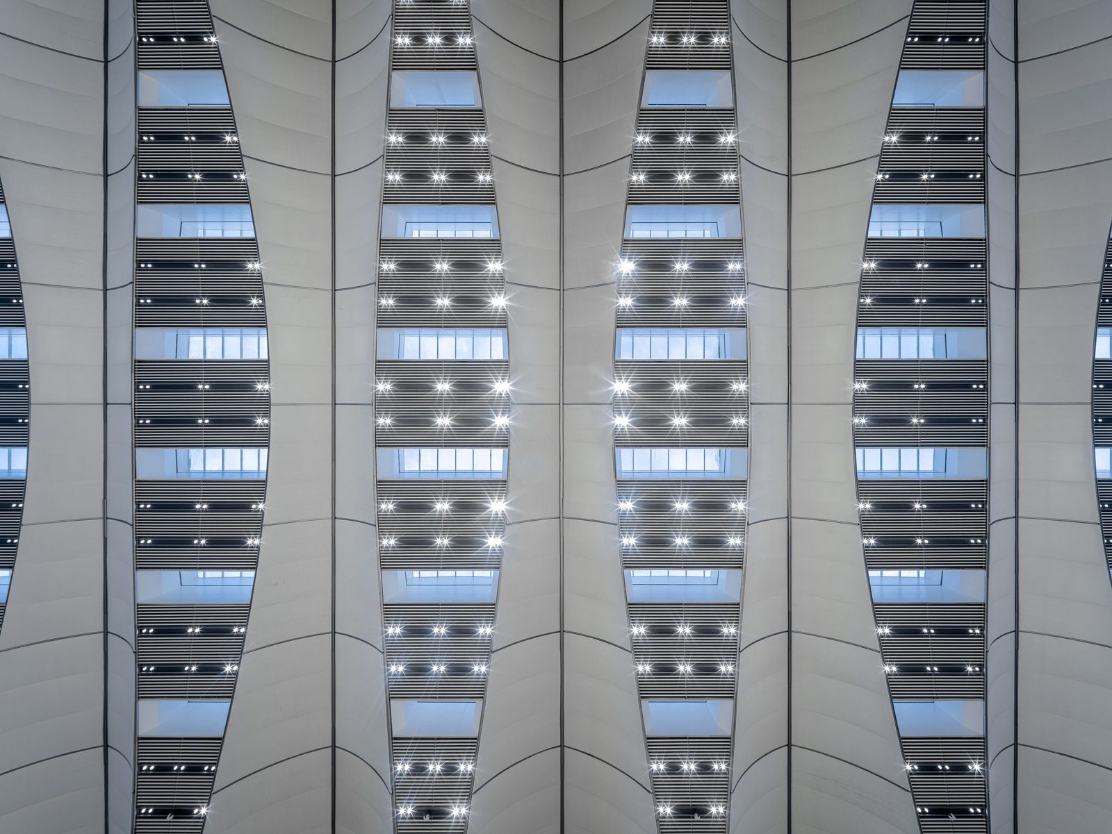 浅色波浪状膜结构屋面结合全玻璃幕墙立面打造入口大厅主体形象,在视觉和空间上强调了繁华城市景观和海岸自然风光之间的联系。夜幕降临,气势非凡的膜结构屋面被灯光点亮,在远处便具有很高的辨识度。主大厅内部墙面采用了浅色横向玻璃纤维水泥面板,相同的材质语汇在展览大厅混凝土复合面板幕墙设计中得以延续。外立面采用的混凝土框架结构如同一条简明宽大的环带将会展建筑与两座塔楼连为一体。水平方向的铝合金百叶幕墙构件巧妙地遮蔽了物流通道,这一幕墙设计同时还可用于展会的多媒体展示与广告布置。