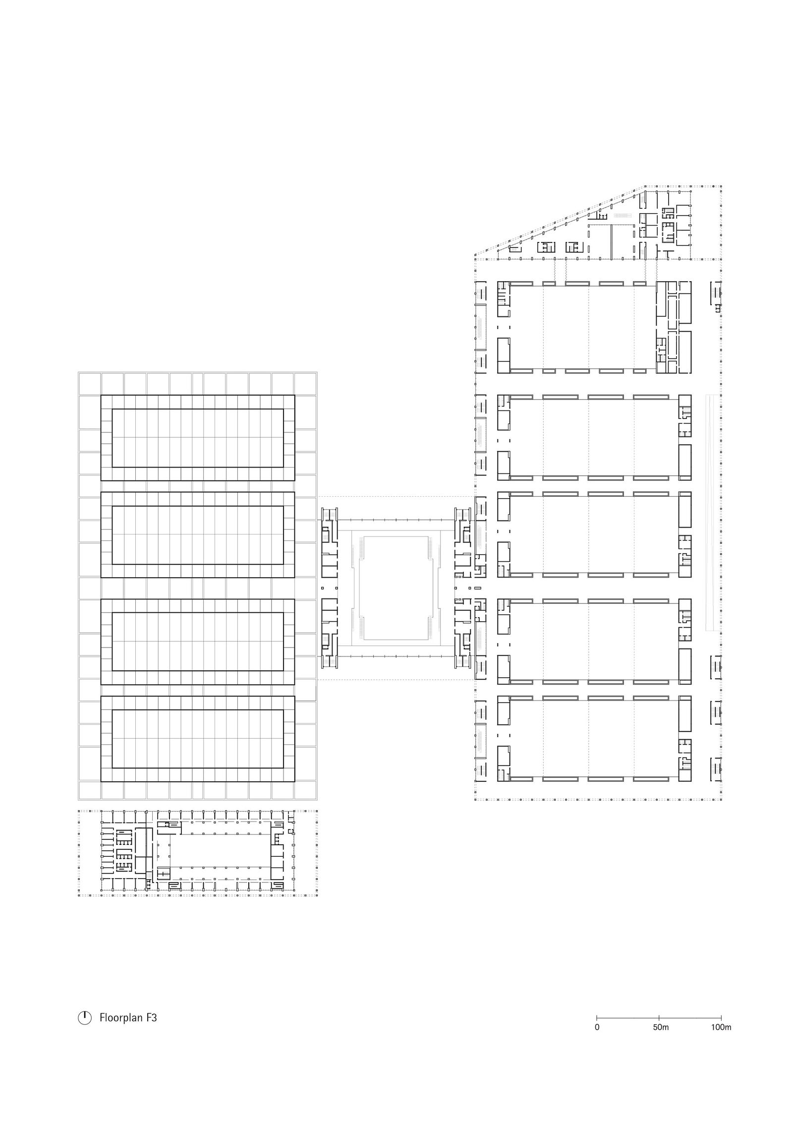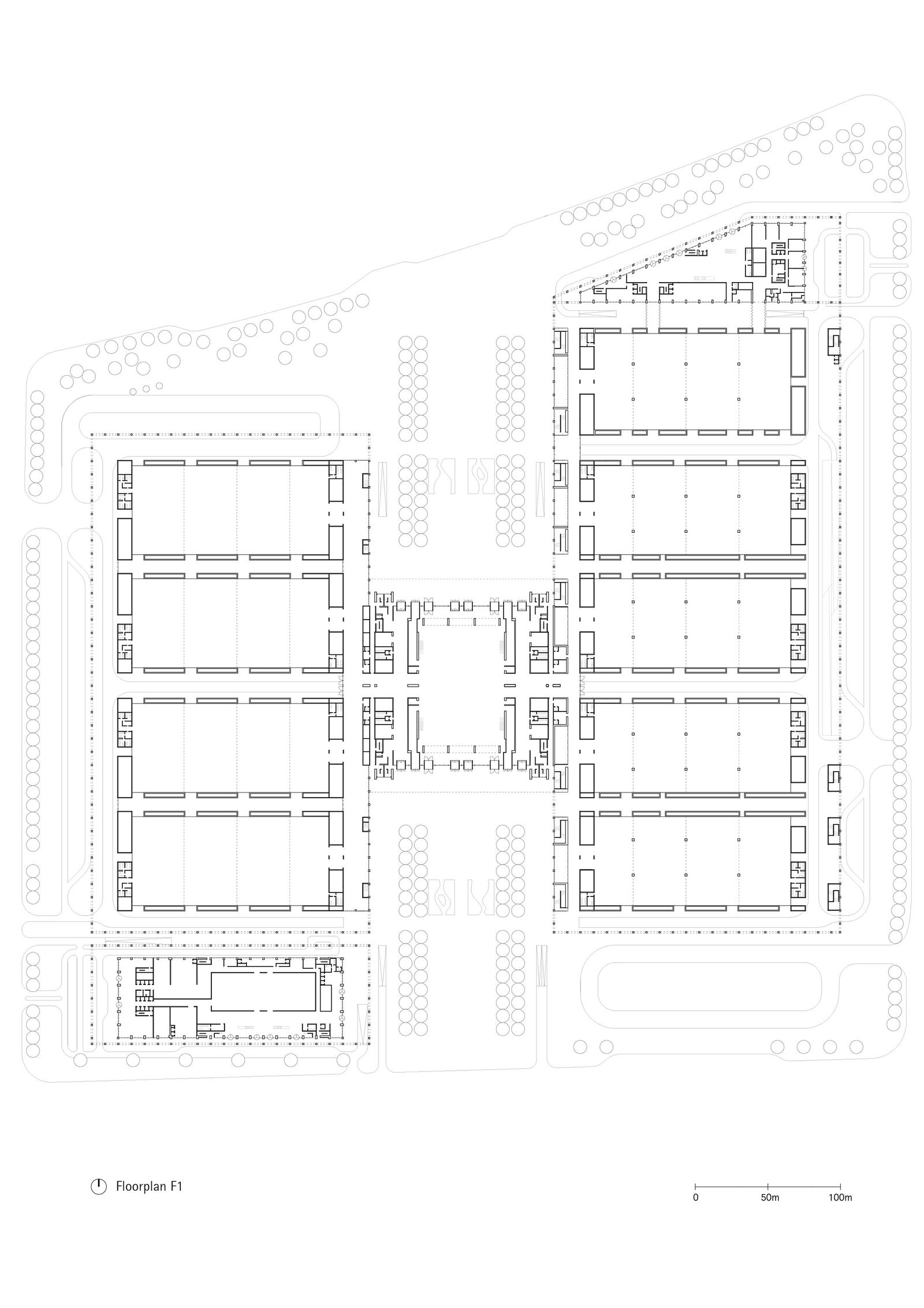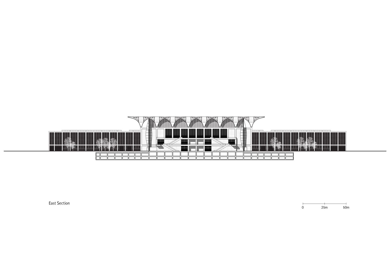 入口大厅和展览大厅紧凑布局于基地南侧和北侧,让出较大的开放场地,也可作露天展览空间使用。由园林小景构成的林荫大道随着总体轴线延伸,为访客提供一片休憩放松的绿洲,与气势恢宏的会展大厅形成鲜明对比。