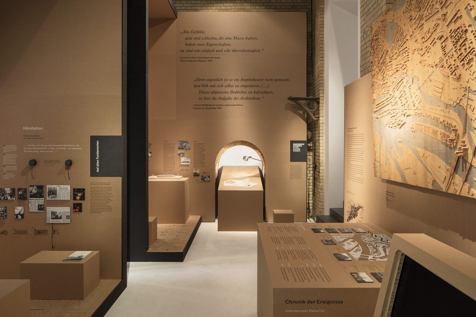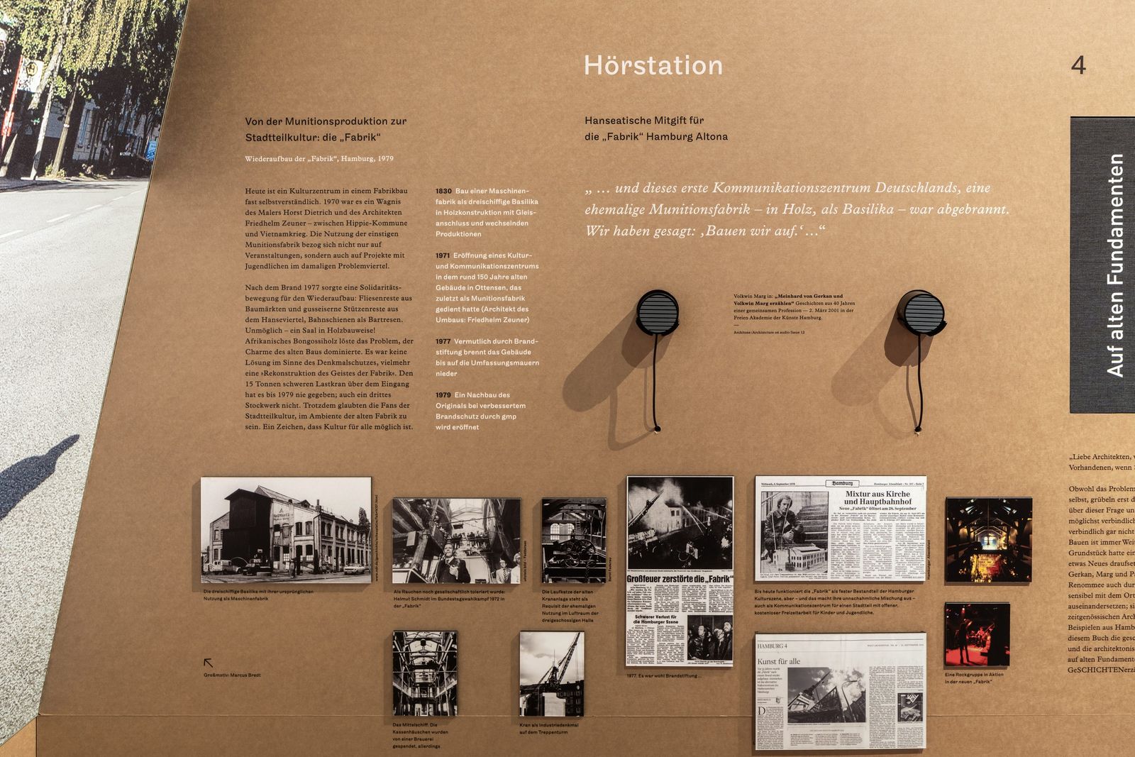The fundamental narrative of the exhibition focuses on a multi-faceted exploration of Volkwin Marg’s oeuvre. Marg’s own writing is represented not only in excerpts from his latest collection of interviews, “The mind so quick, the soul so slow”, which was published 80th the 15th of October, but also by six other book publications, which serve to paint the rich background of the protagonist’s personality: “Architecture is of course not apolitical”, “Choreography of the Masses” and “On Old Foundations”, as well as the new publication “HafenCity – Secret Project”, and the documentation “Activ – The story of a three-mast topgallant sail schooner”.