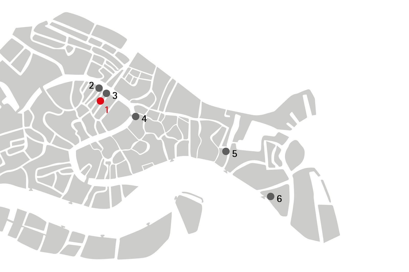 1 Salone Verde 2 Ca’ Pesaro 3 Fondazione Prada 4 Rialto Brücke 5 Arsenale 6 Giardini