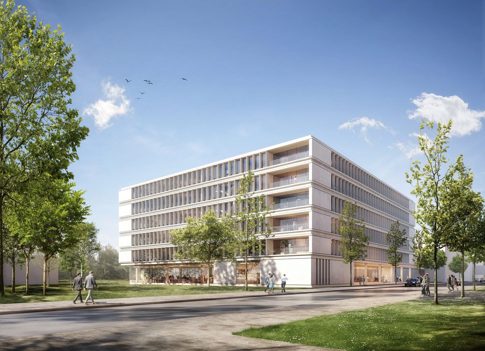 Die Fassadengestaltung orientiert sich an der vorherrschenden horizontalen Gliederung der Umgebung. Um die sechs Geschosse zu strukturieren, werden die oberen fünf Stockwerke durch umlaufende Fassadenbänder voneinander getrennt. Mit einer raumhohen Verglasung setzt sich das Erdgeschoss optisch von den höherliegenden Etagen mit hellen Fassadenelementen ab. Die Eingangsfassade ist nach innen versetzt angeordnet und wird so zum wettergeschützten Entrée. Durch dieses gelangt man in ein langgestrecktes Foyer, das beide vertikalen Erschließungskerne miteinander verbindet. Die nach Süden orientierten großen Besprechungsräume können durch mobile Trennwände entweder in ihrer Größe variiert werden oder das Foyer großzügig erweitern. Von hier ist der direkte Zugang zu einer Außenterrasse geplant.