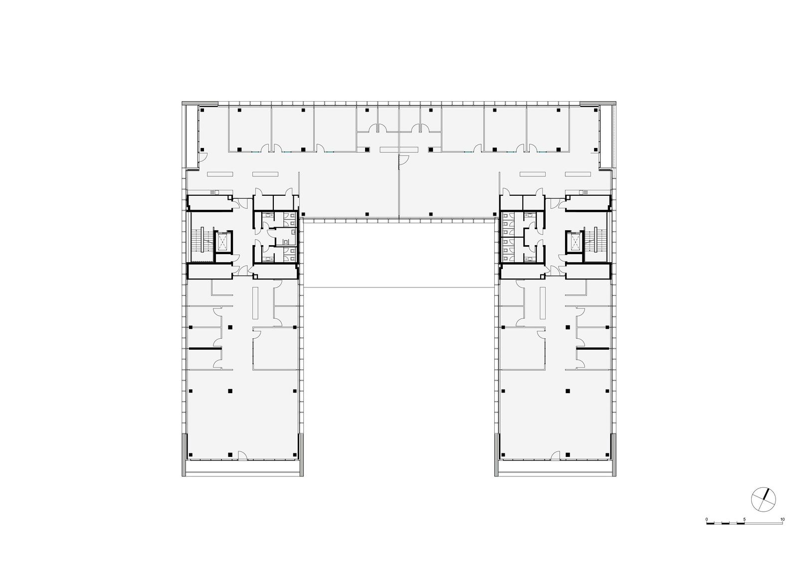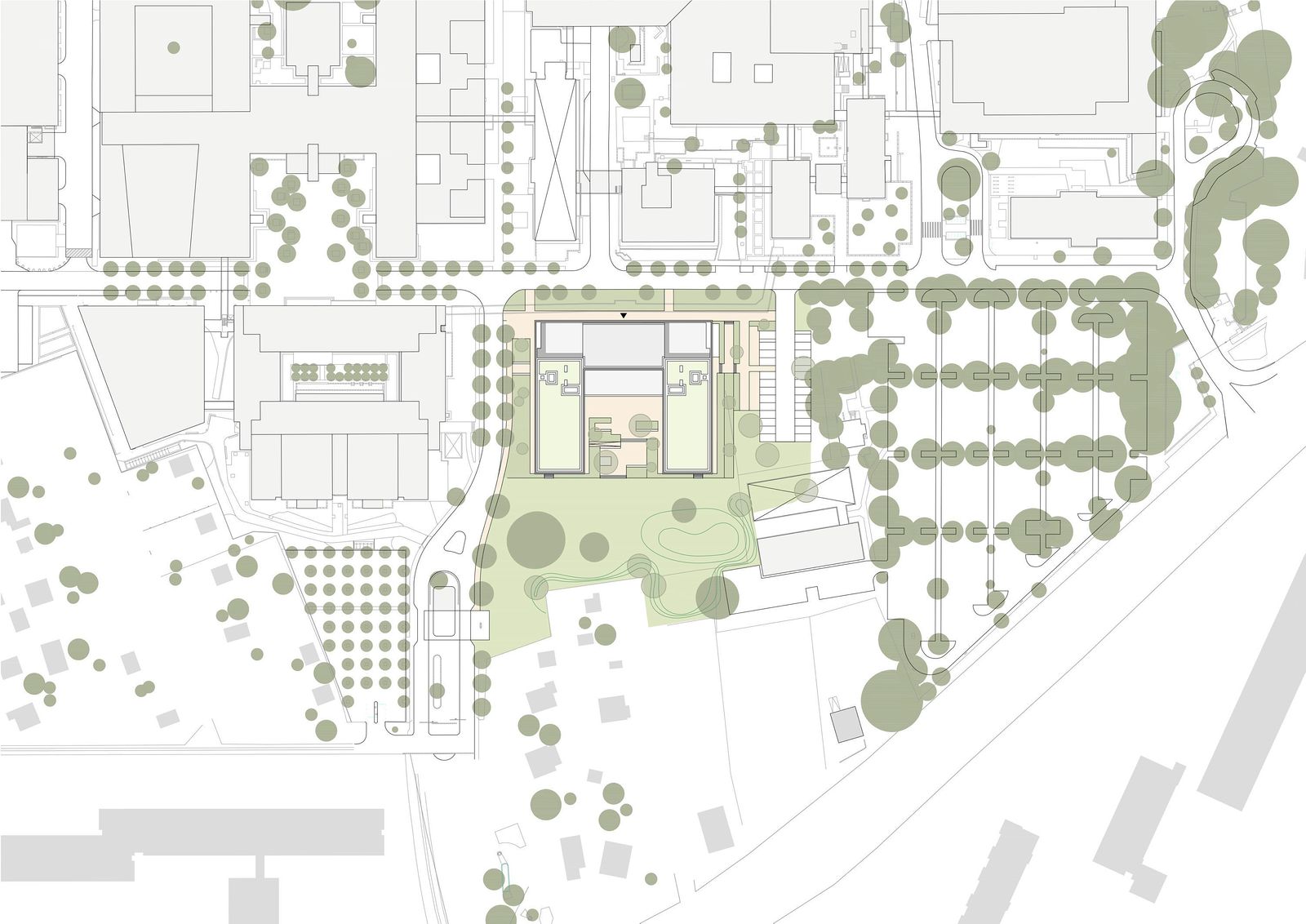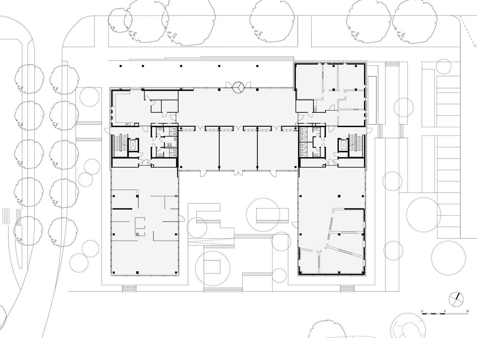 Mit einer Willkommensgeste öffnet sich das U-förmige Gebäude nach Süden und verzahnt so die Architektur mit der parkähnlichen Umgebung. Der Haupteingang zum Neubau liegt auf der Nordseite am ost-westlich verlaufenden „Boulevard“.