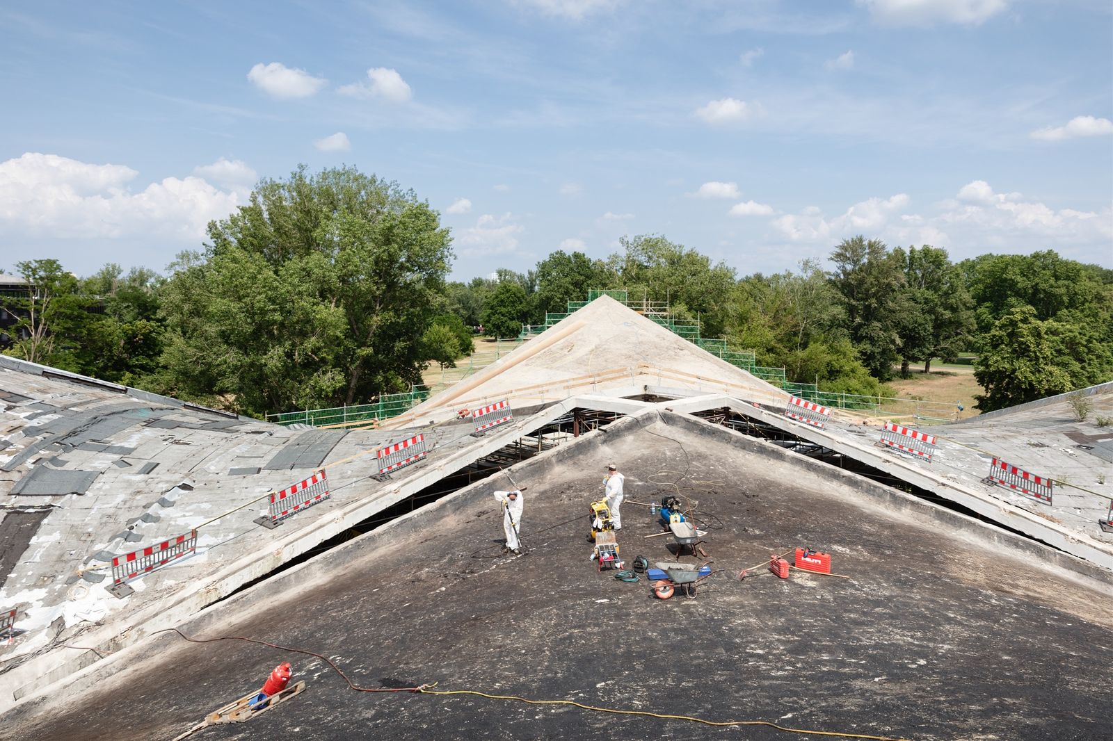 Die Sanierung der denkmalgeschützten Hyparschale von Ulrich Müther nach dem Entwurf der Architekten von Gerkan, Marg und Partner (gmp) schreitet voran. Mit dem Beginn der Instandsetzung des Betonschalendaches mit einer einzigartigen Carbonbeton-Technologie erreichen die Arbeiten jetzt einen ersten Meilenstein: Das bestehende, durch Korrosion gefährdete Schalendach wird mit zwei jeweils nur zehn Millimeter dicken Schichten des leichten und besonders flexiblen Verbundwerkstoffs aus spezifischen Carbonfasern und Feinbeton an der Innen- und Außenseite verstärkt und seine Tragfähigkeit sogar erhöht. Durch das speziell für die Hyparschale Magdeburg zugelassene Verfahren wird die stützenfrei konstruierte Halle mit der innenräumlichen Wirkung des Schalendachs wieder originalgetreu erlebbar sein. Es vervollständigt das Entwurfs- und Sanierungskonzept, durch das der Bau in seiner Leichtigkeit und geschwungenen Form erhalten bleibt und zugleich wegweisend sein kann für den Erhalt weiterer Müther-Bauten.