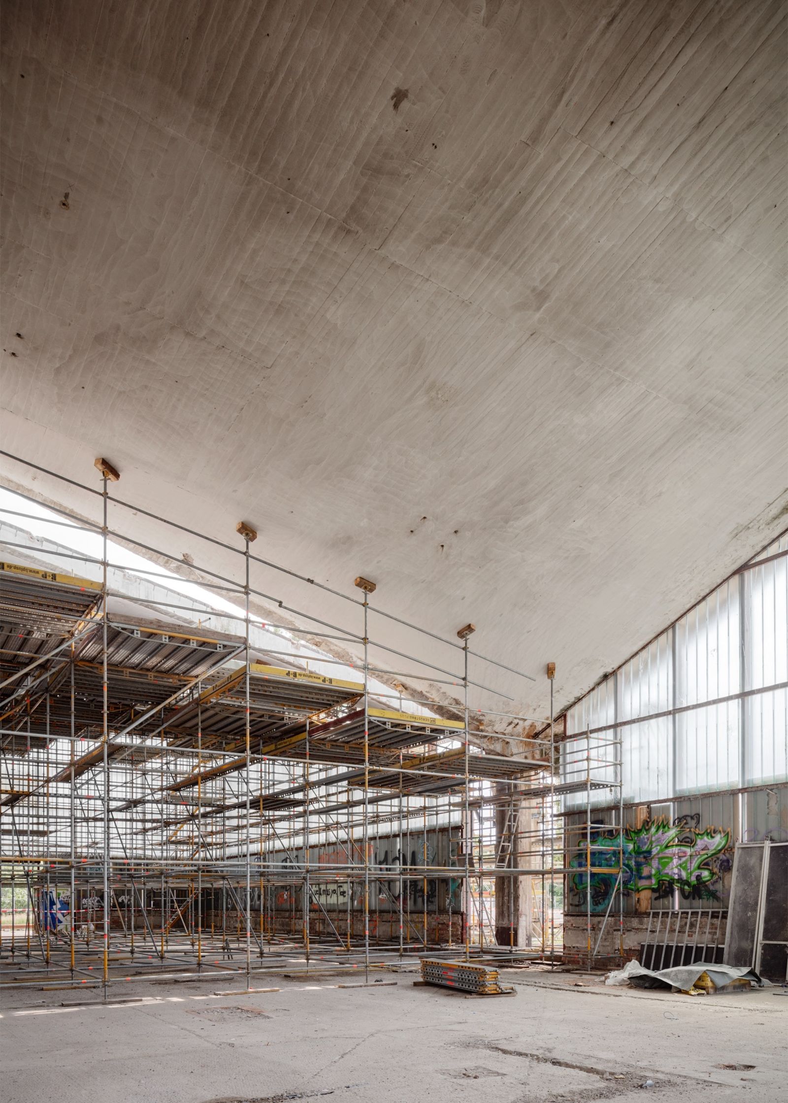 Darüber hinaus sieht der Entwurf, wie bereits sichtbar, die Öffnung der über Kreuz zwischen den Schalen verlaufenden Oberlichter vor. Die Lichtbänder betonen die Schalenform und bieten eine optimale Belichtung für das Zentrum der Halle: Neu eingefügte Galerieebenen und begehbare Brücken machen den offenen Raum mit seinem geschwungenen Dach vielfältig nutz- und erlebbar. Stahlkonstruktionen und Fassaden im Innenraum knüpfen konstruktiv und gestalterisch an die ursprünglich industriell geprägte, vertikal betonte Außenfassade aus Stahl und Glas an. Hier ersetzt eine transparente Glasfassade die bisherige transluzente Industrieverglasung, wobei die originale Fassadenkonstruktion