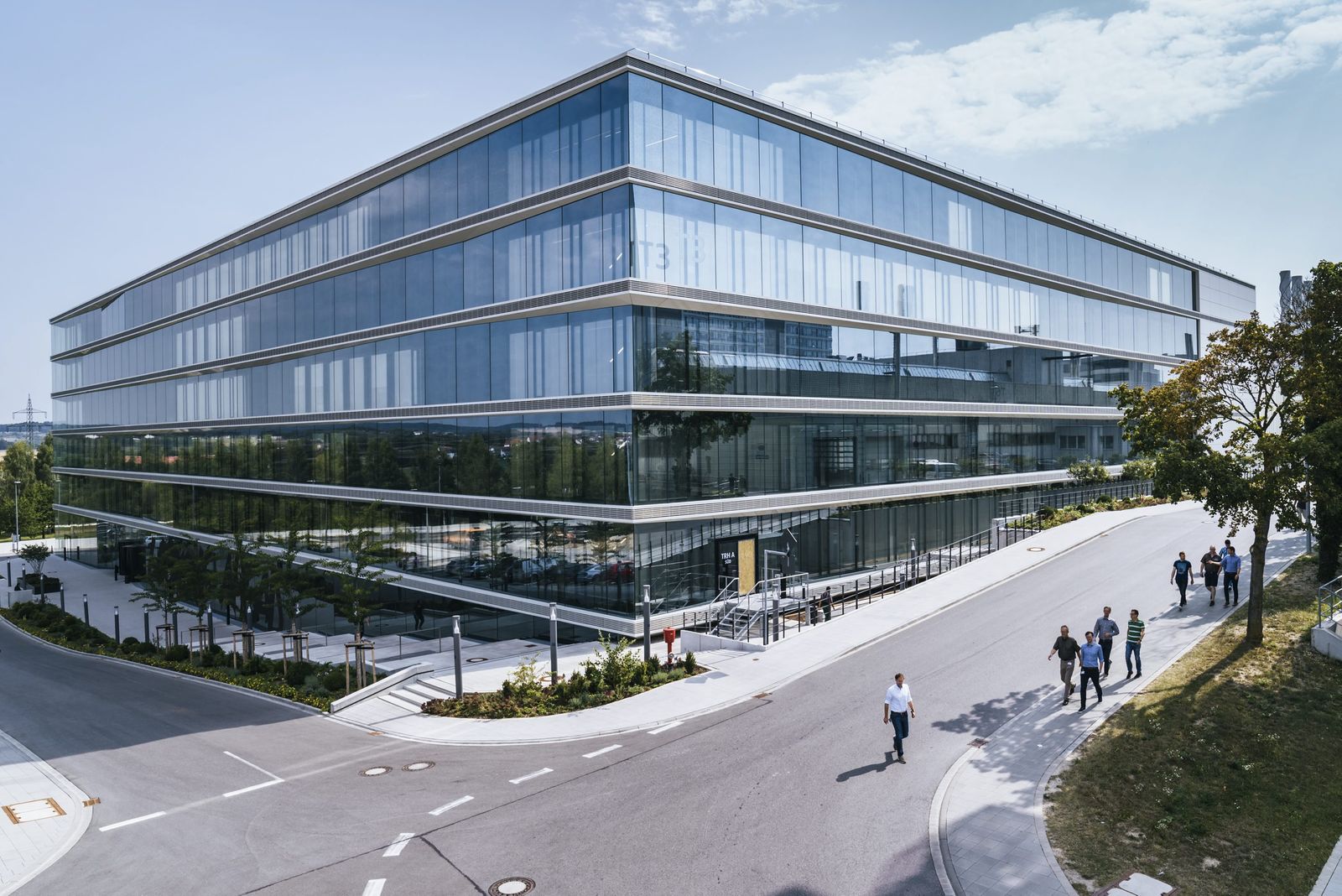 Mit der horizontal gegliederten Glasfassade hebt sich der Baukörper dezent und deutlich von seiner Nachbarschaft aus Industriebauten ab. Die mehrfach gefaltete und verspiegelte vorgehängte Außenfassade mit kristallin anmutendem Charakter lässt keine Einblicke auf die streng gehüteten Geheimnisse im Inneren zu. Neue Automodelle werden hier entworfen, entwickelt und in maßstäblichen Modellen zum Leben erweckt. Die Architekten waren ihrerseits gefordert, Arbeitswelten der Zukunft zu entwickeln, Orte des Rückzugs, des Austauschs und für die Arbeit an Modellen im Realmaßstab.