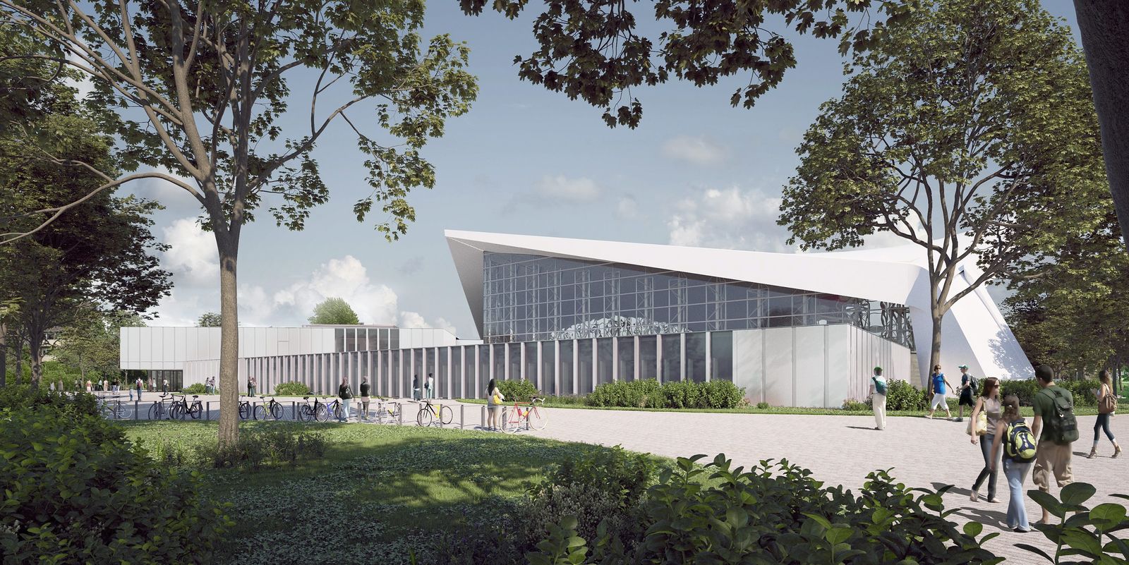 Der Entwurf von gmp sieht vor, die markante Dachschale und die darunterliegenden Schwimmbadbereiche zu erhalten, das bestehende 50-Meter-Becken und das Lehrbecken werden vollumfänglich saniert. Durch den Rückbau der Tribüne ist künftig unter dem Dach der Schwimmhalle Platz für ein separates Sprungbecken mit einer 1-, 3- und 5-Meter Sprunganlage.