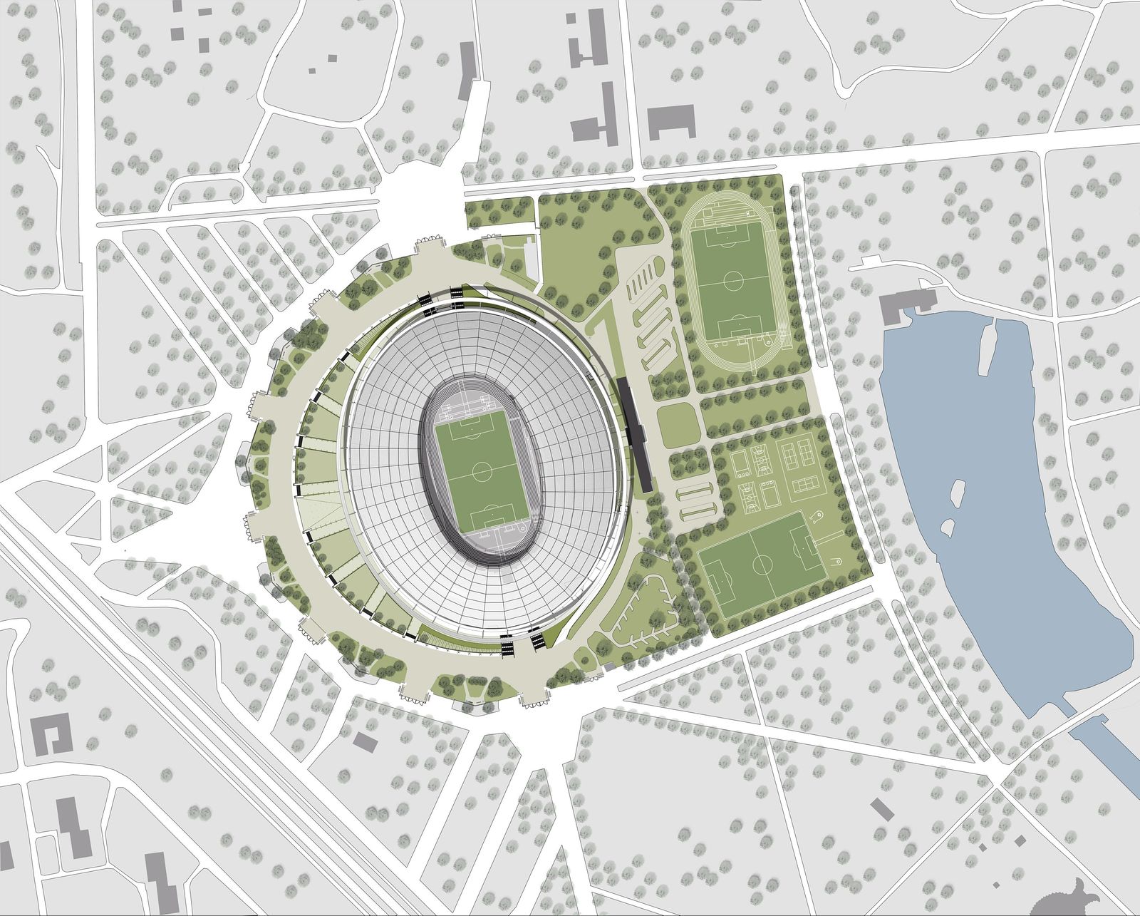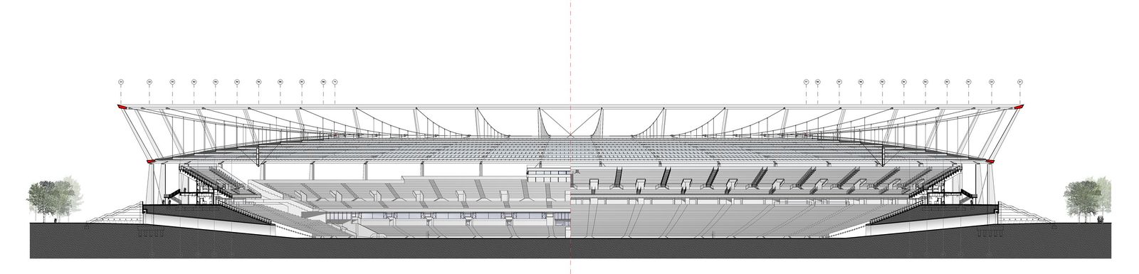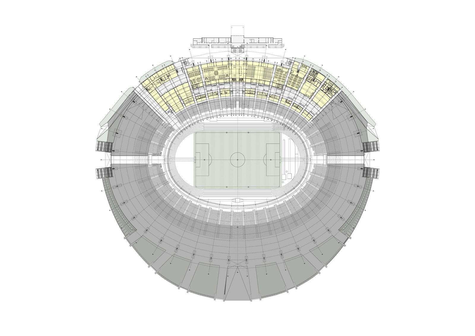 An elegant tensile structure has been installed independent of the existing grandstands and ensures that the bright, open-air character of the stadium is largely retained. The tensile structure was erected with 40 restrained reinforced concrete columns at the required height of 37 meters above the pitch; its structural system is based on the principle of a bicycle wheel rim, with an upper and a lower external compression ring and several spokes in the form of tensile cables attached to the inner rim of the roof. The heterogeneous appearance of the structure with its existing and added grandstands with their different basic geometries has been unified by the oval roof construction, resulting in a homogeneous overall structure.