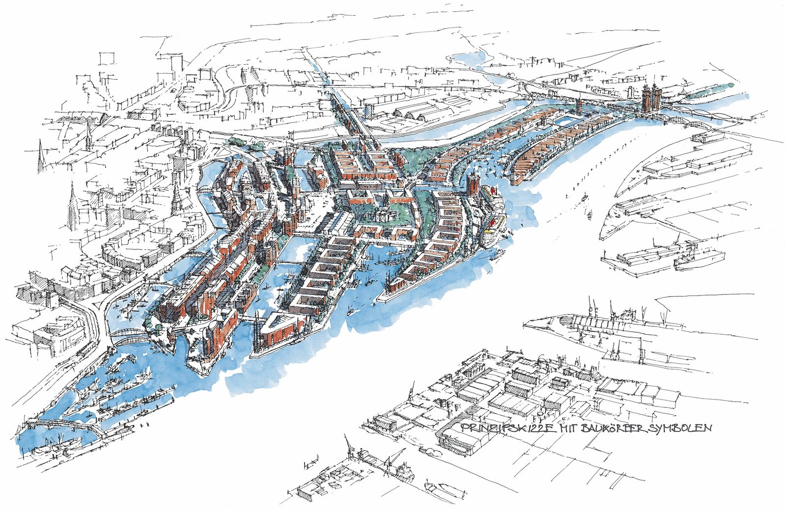 In the 1980s and 1990s, Marg produced several expert reports in order to prevent the infilling of port basins and Fleet canals in the Speicherstadt, an issue that had become a controversy between Town Planning and the Port Authority. The Chairman of the HHLA Board, Peter Dietrich, who also valued a more harmonious port and urban landscape, met with Mayor Henning Voscherau for a confidential conversation with the aim of balancing the interests of both port and city. At great personal risk, they both laid the foundations for the intended HafenCity urban development. (Henning Voscherau received the Bürgermeister-Stolten medal in 2011 and Peter Dietrich posthumously in 2017.) This required a realistic masterplan concept, which was developed at Marg’s Chair in Aachen (“Geheimprojekt HafenCity”, Dölling und Galitz, 2017). The project was publicly introduced in the Town Hall by Henning Voscherau on the occasion of the 75th anniversary of the Übersee Club on May 7th, 1997, in the presence of Roman Herzog, President of the Federal Republic. Since then, the construction of HafenCity has become an internationally renowned pilot project of the growing Free and Hanseatic City of Hamburg.