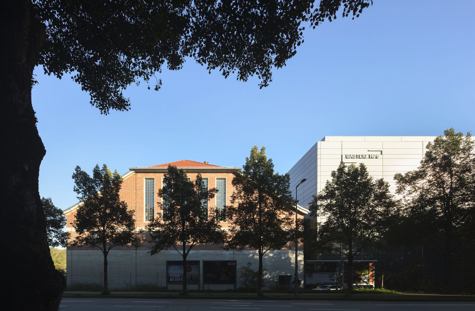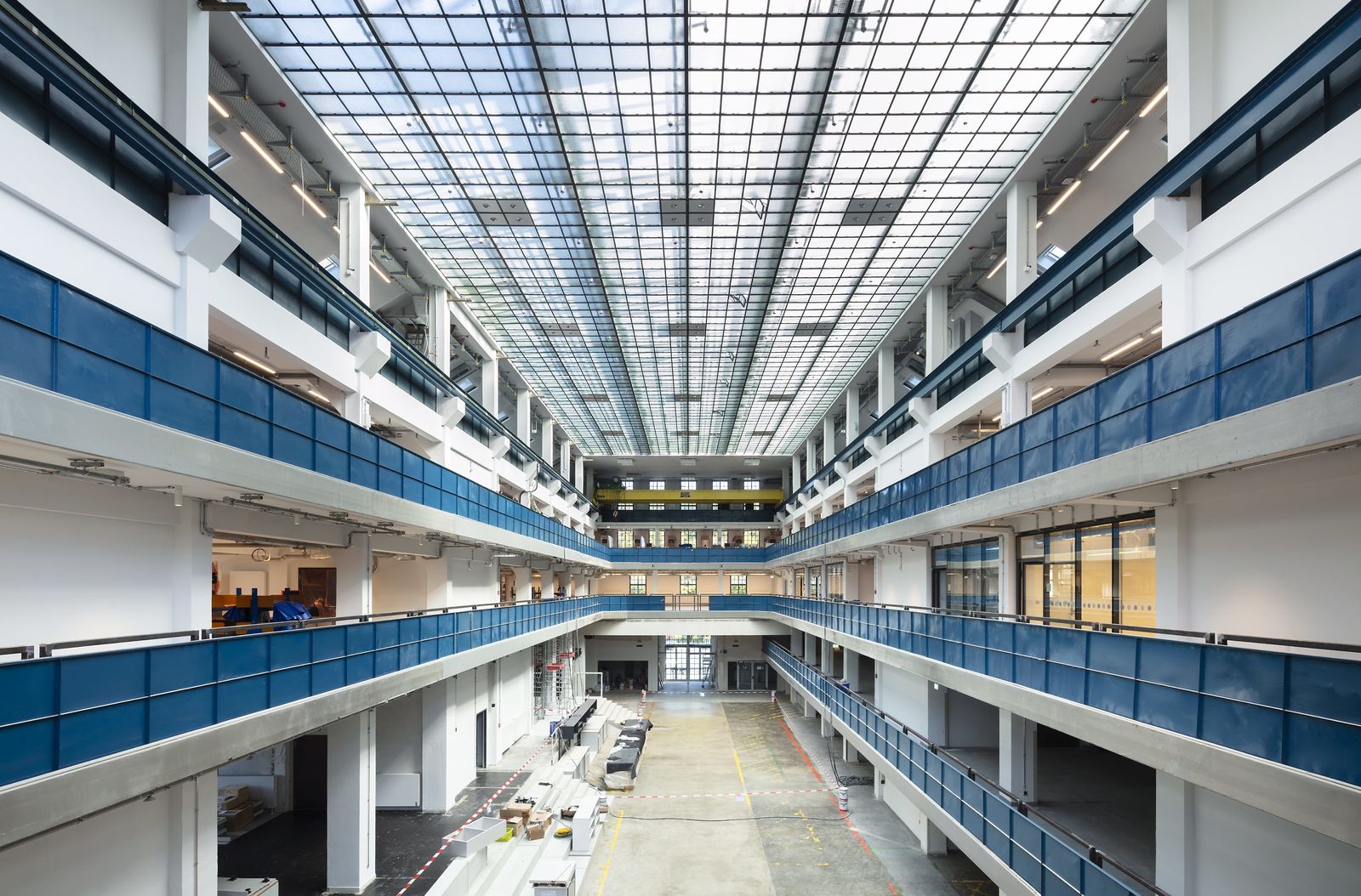 By utilizing Hall E for the HP8 center, a new public facility is being created at the banks of the River Isar, which will exist beyond the Gasteig use period. At the same time, the industrial character dating from 1929 will be preserved. The external appearance is dominated by concrete and red-brick facades, whereas the interior features a building-high atrium with top lighting and blue balcony railings fronting the surrounding tiers. In addition to the Isarphilharmonie foyer on the first floor, a branch of the Munich Public Library with an events venue, seminar and meeting rooms, and arts agency and eatery premises round off the room schedule, thereby creating a public space that will be popular and busy throughout the day.