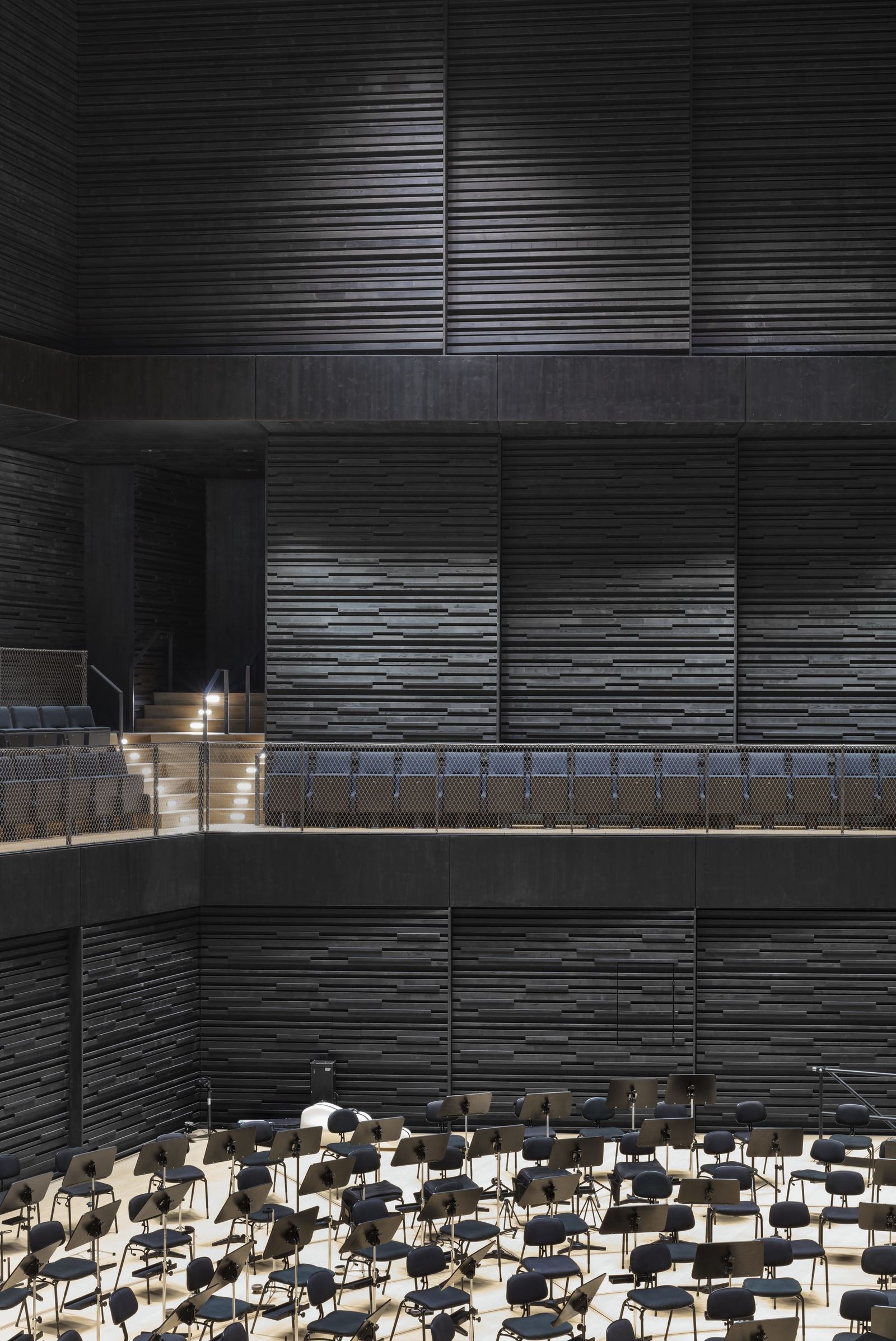 The hall has been designed in the form of a classic “shoe box”, in which the orchestra takes its place on the front stage. The overall design principle of the interior was determined by the demanding acoustics requirements. From the very beginning of the design process and in close cooperation with Yasuhisa Toyota and his team of Nagata Acoustics, gmp developed the geometry of the space in accordance with acoustics principles. With the overlapping arrangement of the prefabricated elements in saw-tooth formation and their rough surface, in combination with the geometry of the stage area, the rising parquet, and the seating, the sound-reflecting surfaces combine perfectly for the purpose of good acoustics. The result is a very special sound experience; in addition, an intimate atmosphere is created by the dark coloring, whilst the light-colored wood of the stage attracts the attention of the audience. “From the outside, the Isarphilharmonie building may appear plain but on the inside we did not economize on anything”, says Max Wagner, Managing Director of Gasteig München GmbH. “Everybody was immediately delighted with the vibrancy of the hall and with the sound experience”.
