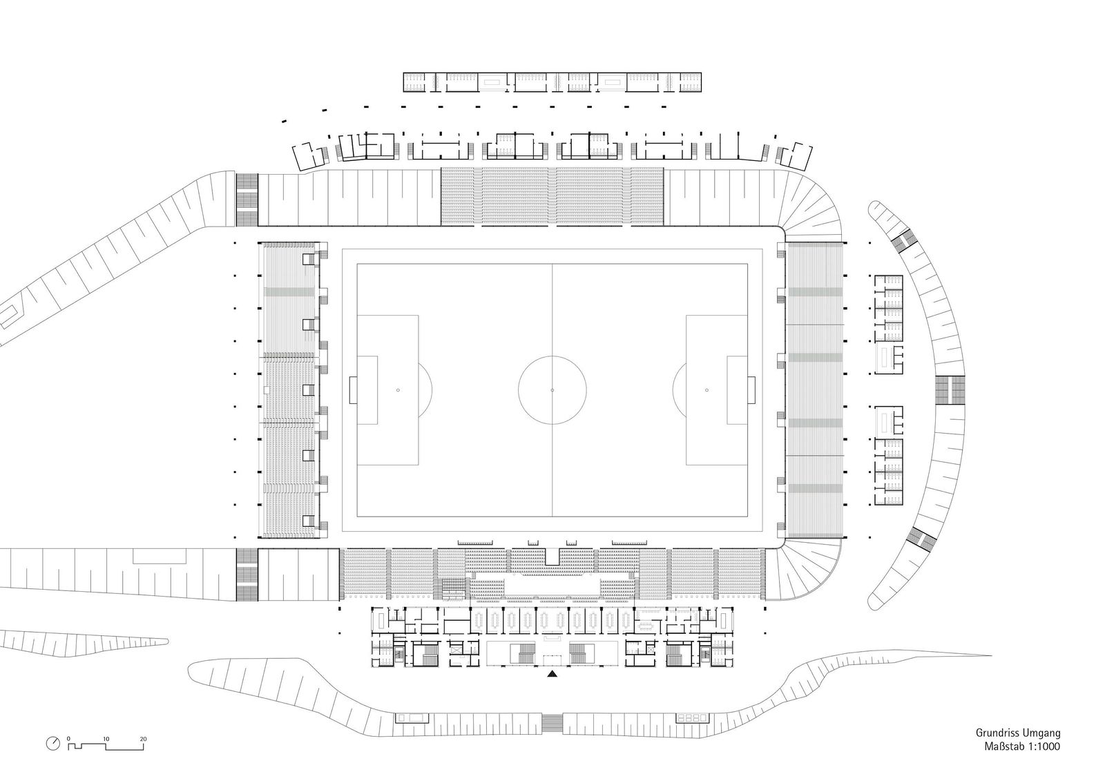The newly constructed main grandstand integrates the special functions of the stadium in the central tract with team, VIP, business and press facilities, and serves as the “new address” of the Ludwigspark Stadium. The east grandstand was built as a standing grandstand only, whereas the one to the west has both standing space and seats. This also contains the guest block with standing space and seats. A new main circulation level has been created that links all four grandstands at a height of 7.70 meters, based on the existing topography of the stadium terrain.