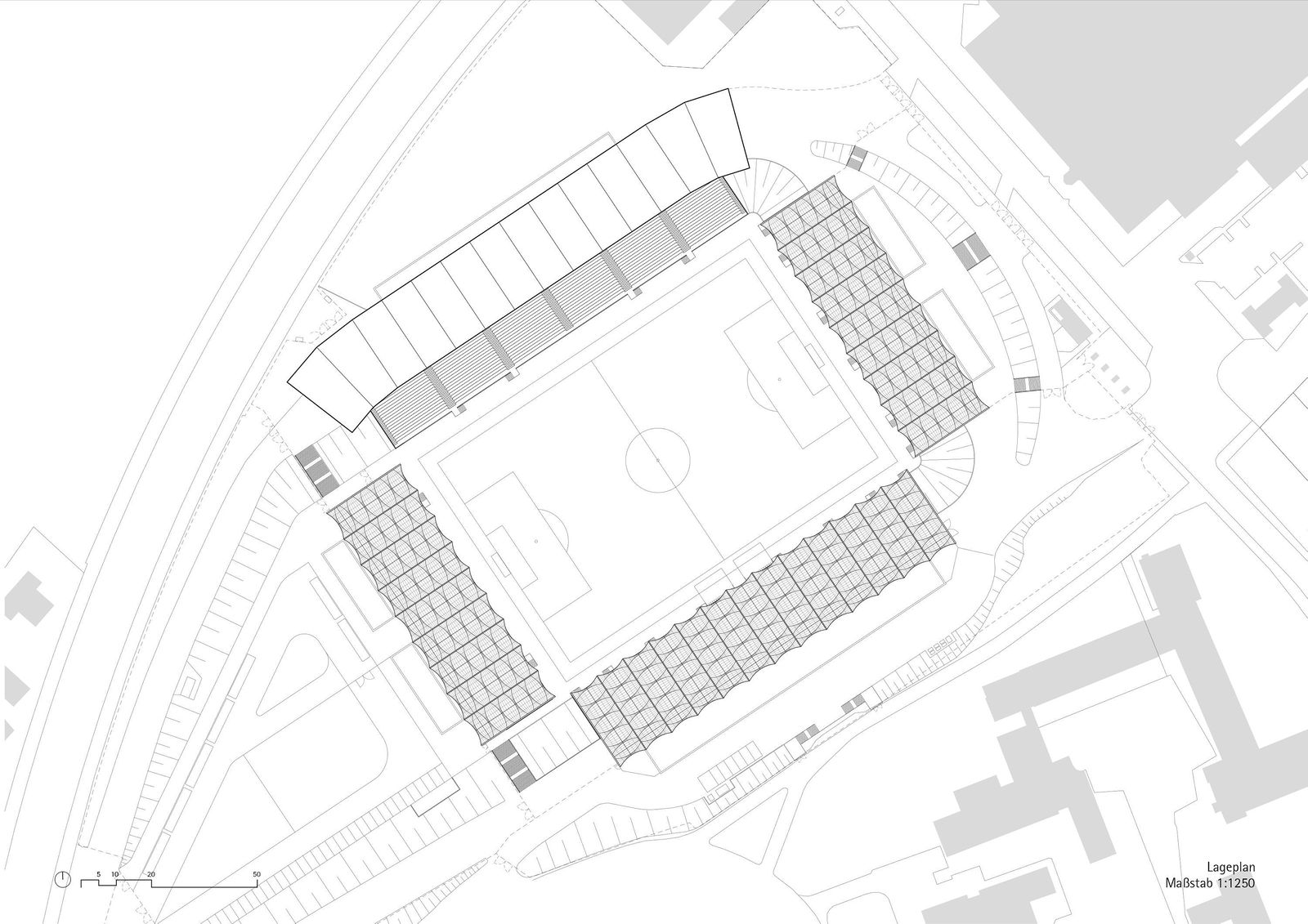 The new roofs of the main grandstand and those to the east and west in the Ludwigspark Stadium are cantilevering constructions in which projecting steel members are covered with a textile roofing membrane. The loadbearing structure is based on a grid with 8.80 meter spacing. Each of the 8.80-meter-wide fields is supported by lateral curved girders, which in turn rest on reinforced concrete supports. At the rear edge, the roof is stabilized by vertical members. Rainwater is discharged to the rear via the slight slope of the roof; the vertical members also serve as drainpipes. The cantilevering girders are connected to each other with slanting steel arches running parallel to the grandstands, which also serve as substructure of the membrane whilst also ensuring horizontal stability. This creates a roof edge that emphasizes the openness and lightweight nature of the structure. (sbp)