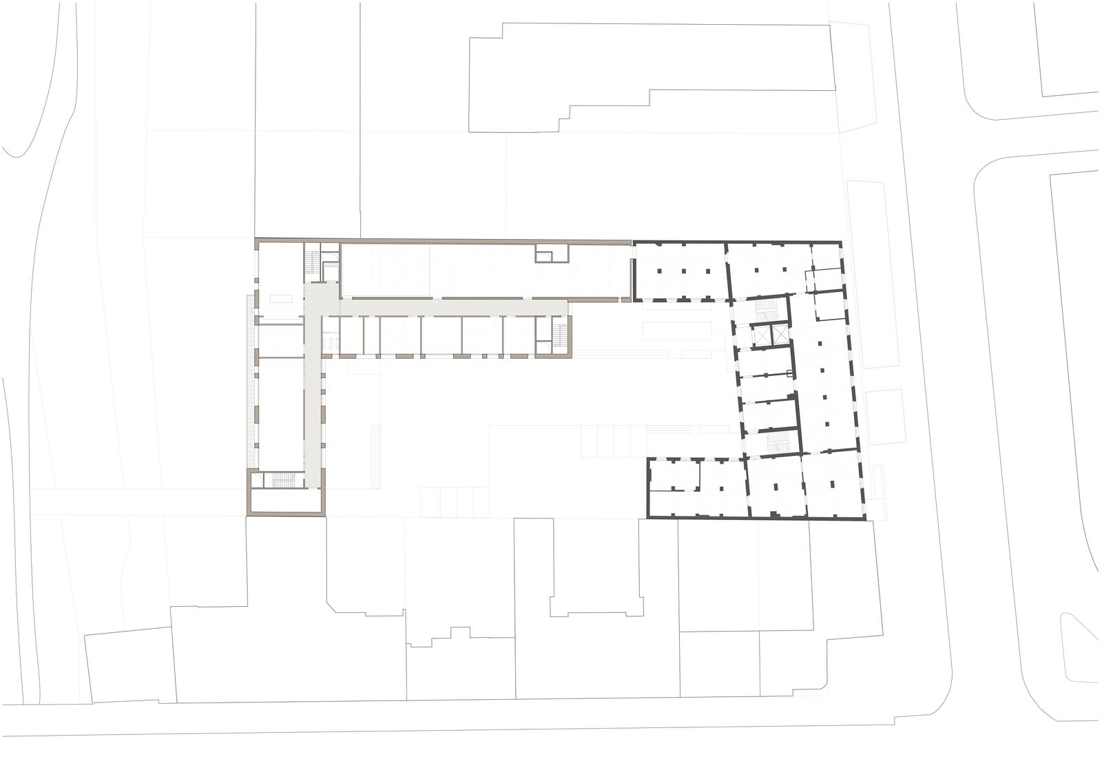 The extension building designed by gmp is connected to the existing facility to the north of the site. In terms of urban design, this arrangement provides a convincing solution as the new building resembles the existing facility in its overall volume and – with its L-shaped layout – also blocks off the site towards the west and the urban freeway. In this way, the neighboring residential buildings become part of the newly created urban inner courtyard, and an effective acoustic screening is achieved that blocks noise from the urban freeway and the railway track. In line with the planned low-tech strategy, the layout of functions within the building makes ideal use of the different climate and acoustic zones created.