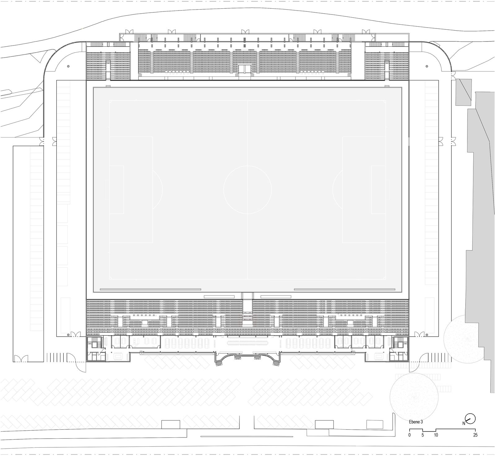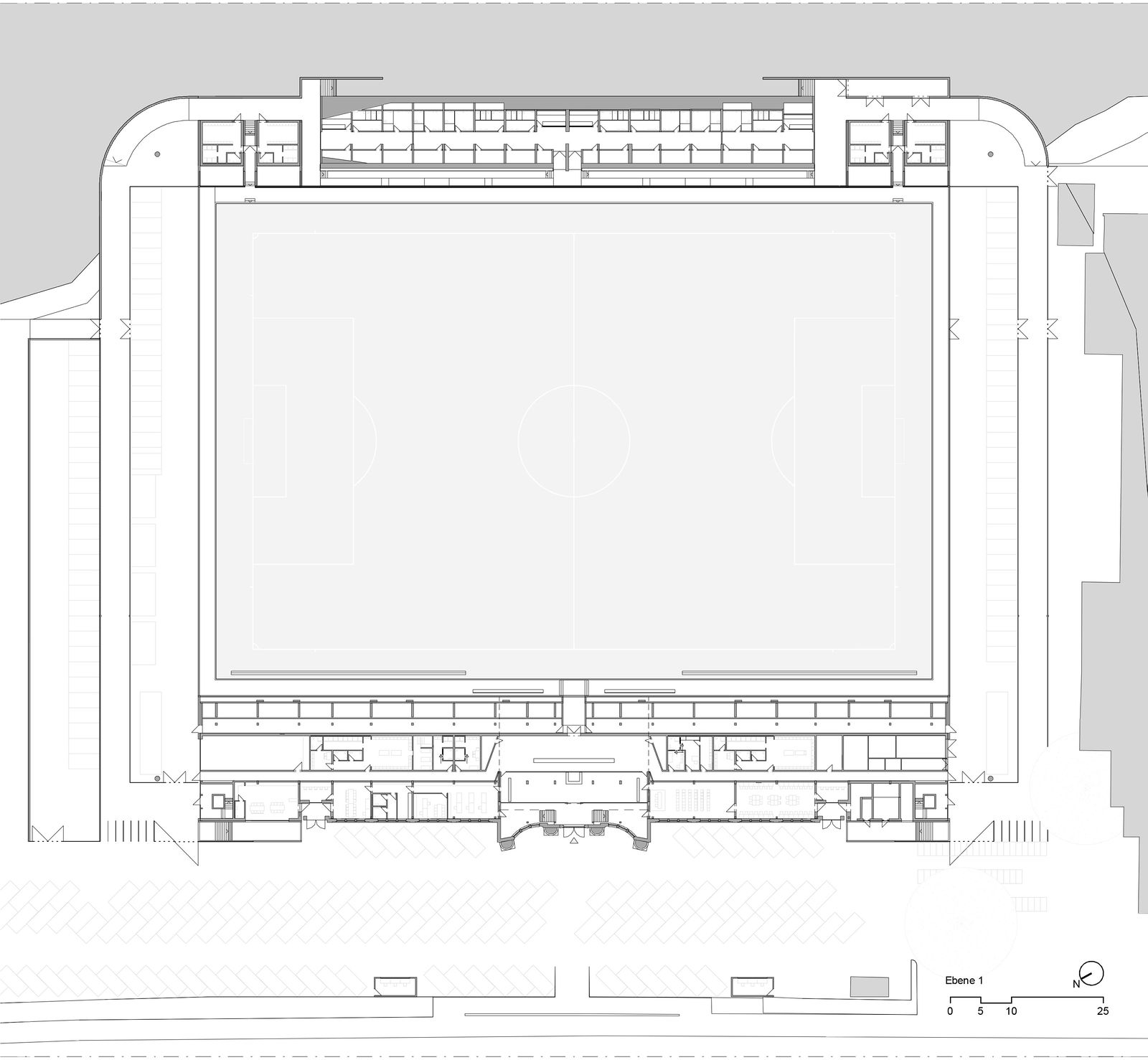 The “Zanvettor” grandstand – a new construction in the purist style – was built behind the stadium portal, which is protected as a historic structure. The monumental portal was carefully integrated in a fair-faced concrete base and was roofed over using steel lattice girders. The space below the grandstand is used for all the facilities needed in connection with Serie B matches. These include better equipped dressing rooms for the teams, the press room, and a press work room that faces the field. The historic portal provides access to the fan shop and eateries, which can also be used when no matches are taking place. The administrative premises required for efficient management of the stadium are located on the upper floor.