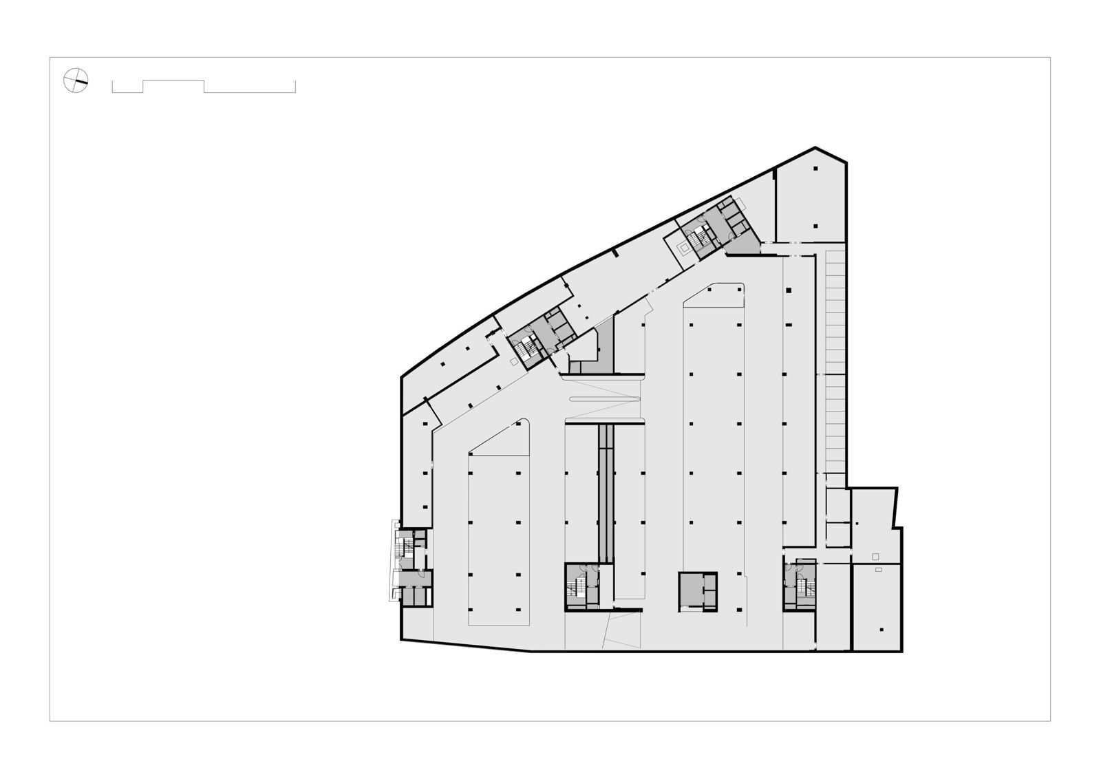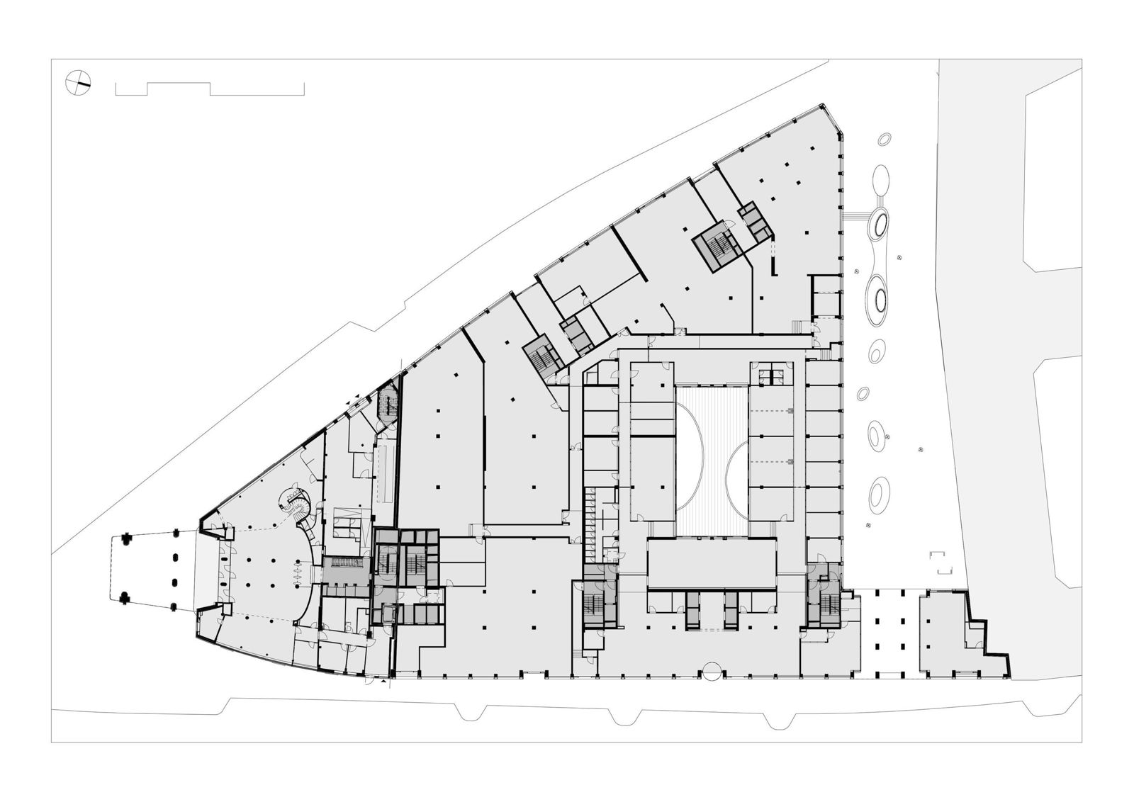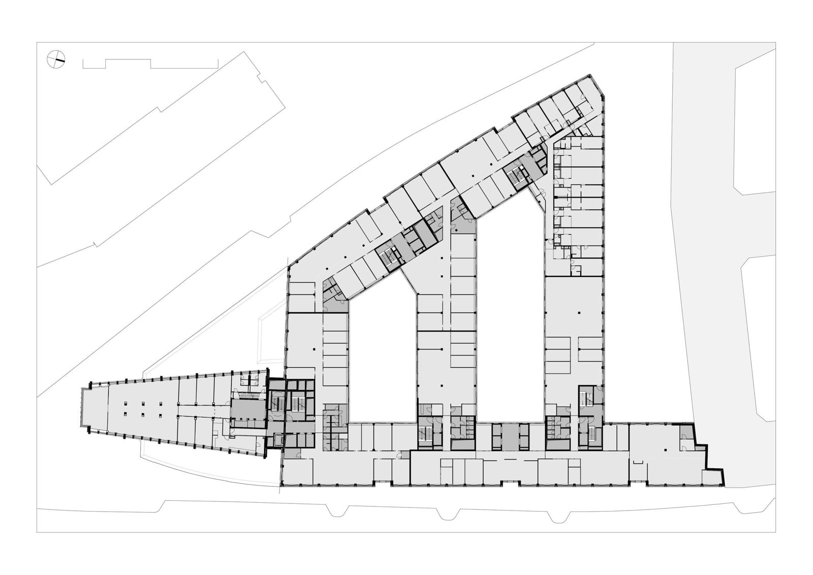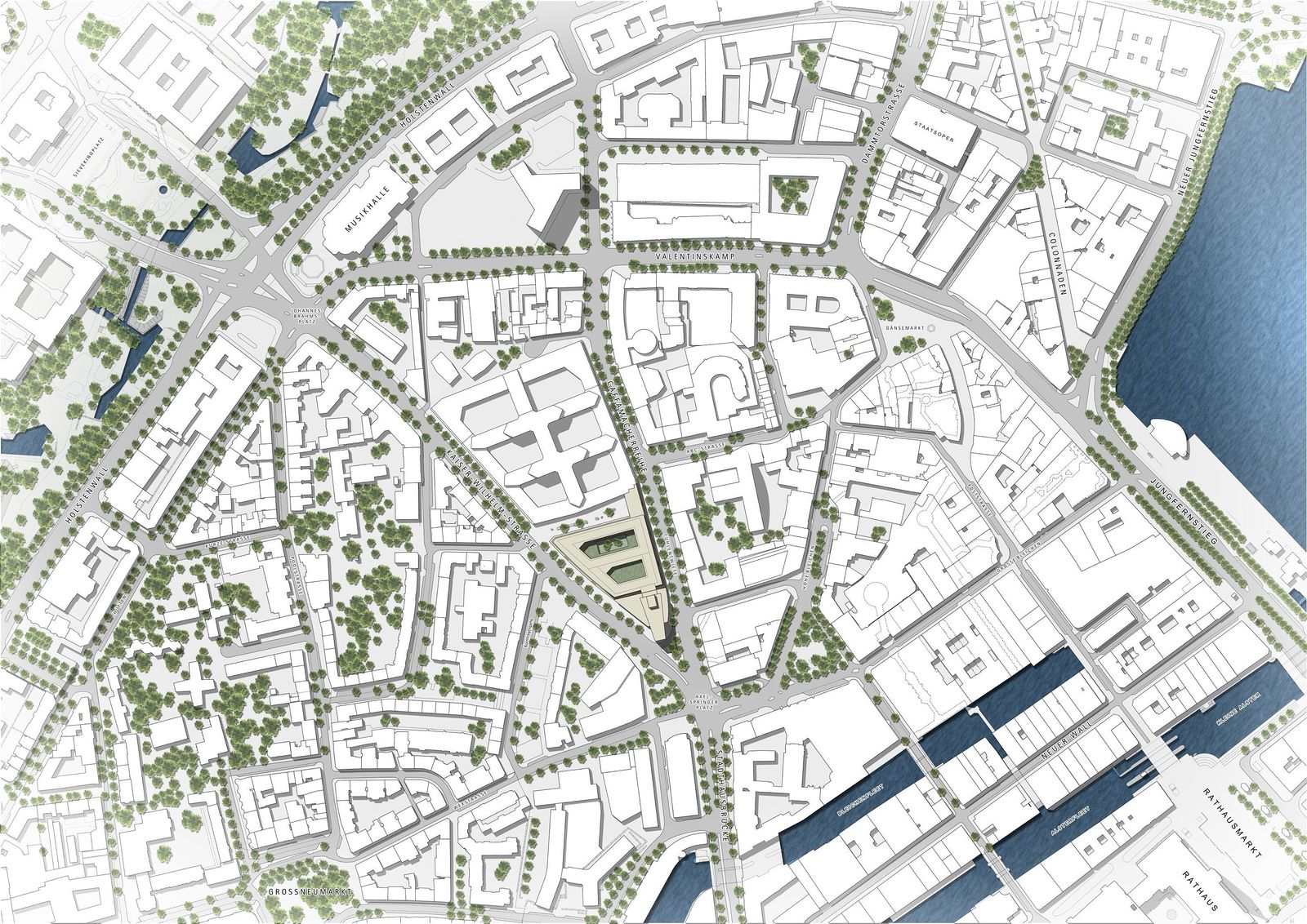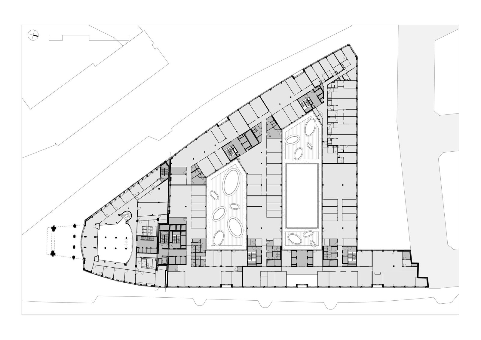 Adjacent to the high-rise building, where the middle tract of the publishing complex used to stand, an eight-story office and business building is being built. The large development follows the line of the street, creating a solid block edge facing the public space. In addition, two stories at the top are recessed, replicating the eaves outline of the neighboring buildings and thereby placing the new building harmoniously in its neighborhood. The first floor will accommodate commercial units and restaurants; most of the upper floors are designed for offices. These stories are flexibly laid out, with the fitting-out grid and depth of the building allowing for open-plan, group, and individual offices. Two courtyards forming recesses in the block provide light to the surrounding offices. In addition, the new building will have 53 apartments. The roof terraces with views across Hamburg are open to all users. A pedestrian zone will be established between the Springer Quarter and the District Offices to the north, which can be used by the public to walk across the quarter.