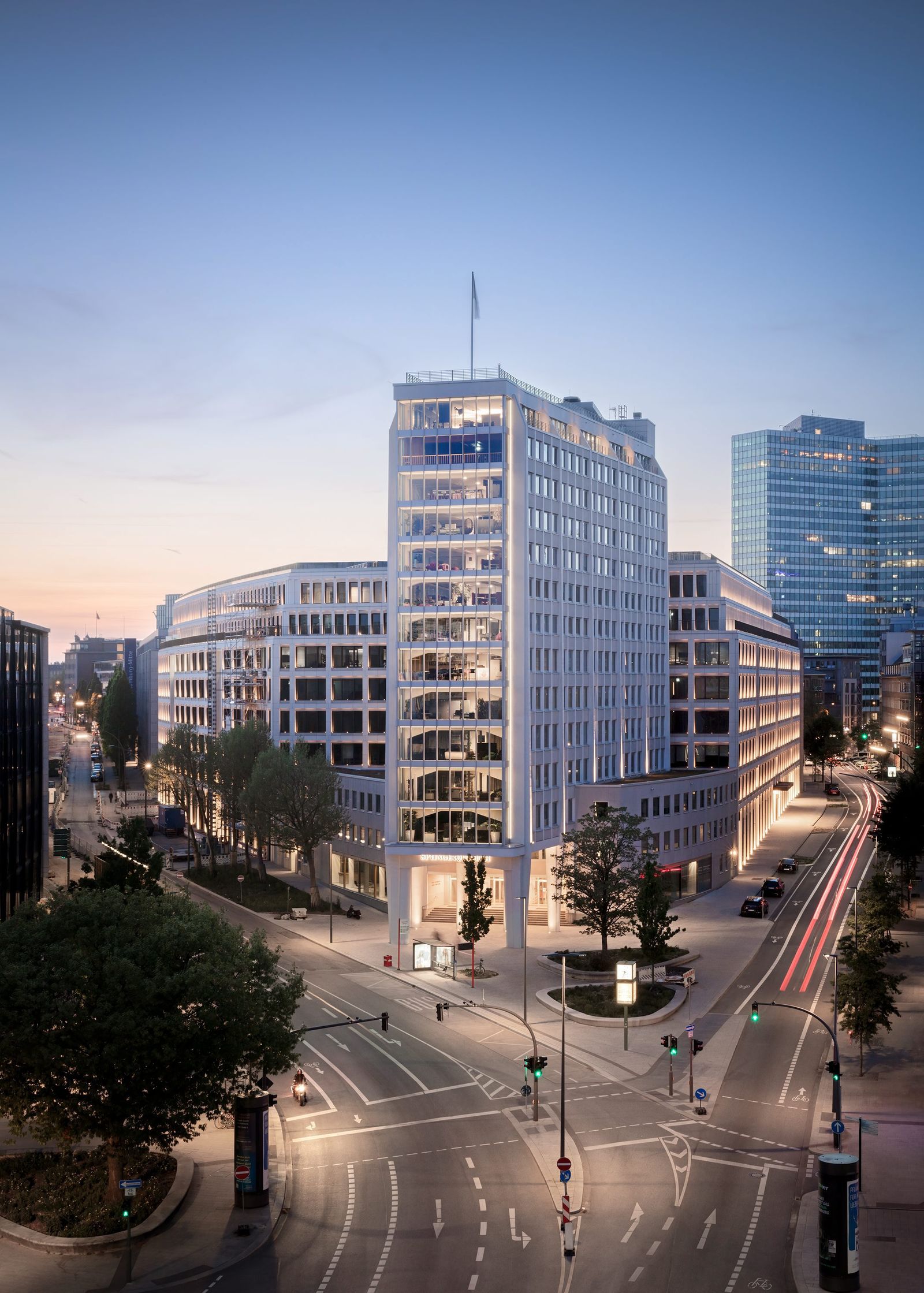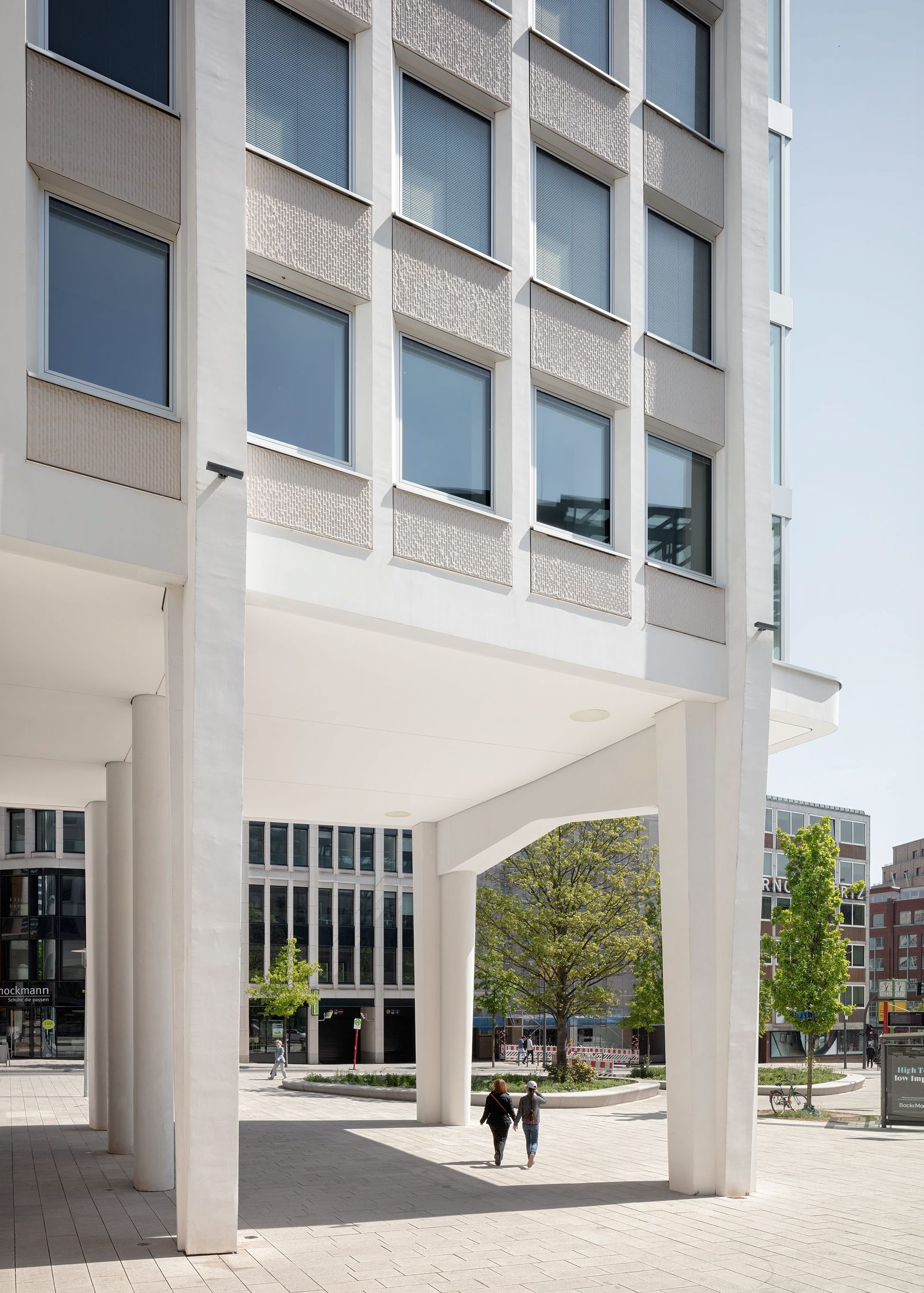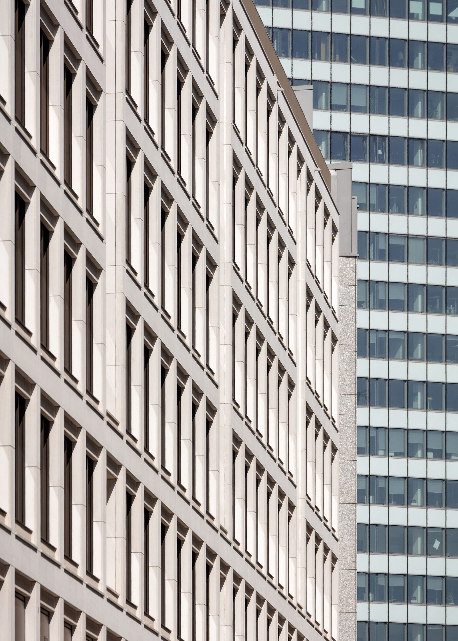 With its light-colored natural stone facade, the new building replicates the material, texture, and color scheme of the existing high-rise building, creating a coherent ensemble. The grid facade with recessed lintel and sill ribbons echoes the proportions of the existing 1950s building. Vertical breaks in the facade define the entrance areas and subdivide the long street frontages into easily distinguishable units.