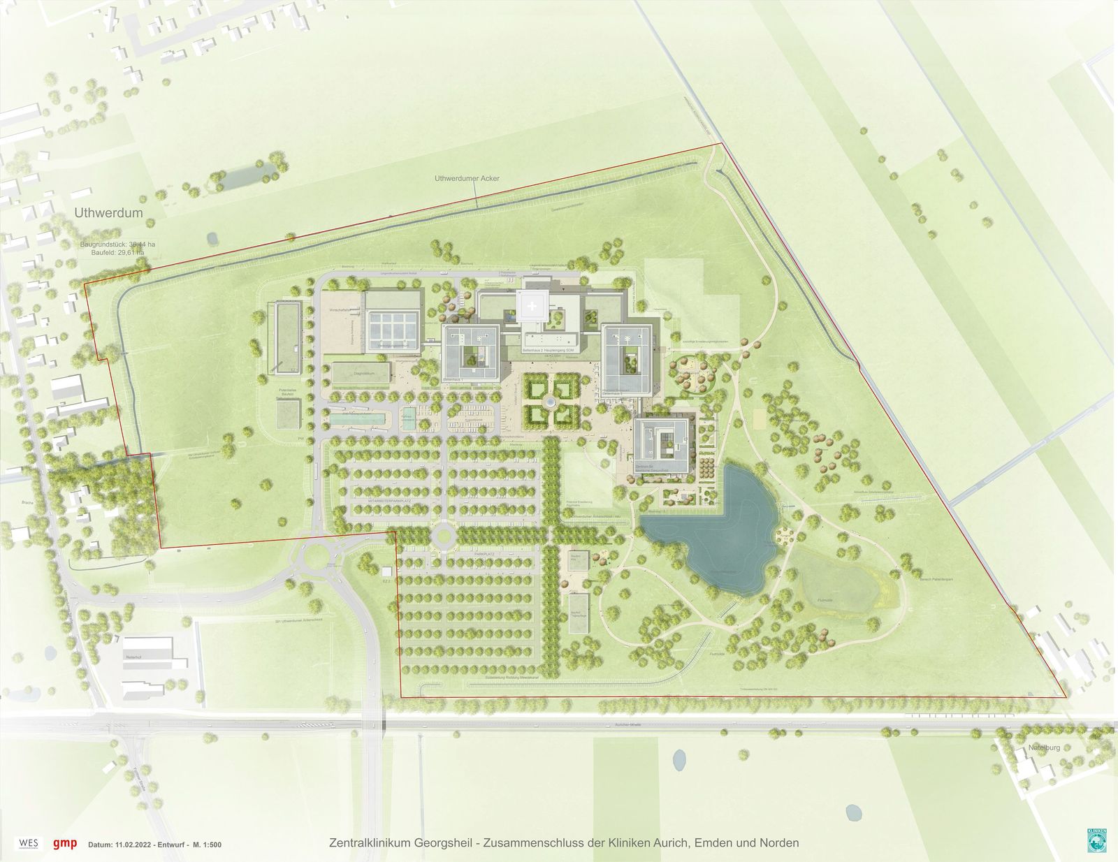 Under the motto “alltohoop” (all together), the three hospitals in Aurich, Emden, and Norden merge to form a shared medical center. The new campus for Aurich Rural District and the town of Emden is not only intended to provide modern working conditions for members of staff and a quality experience for patients and visitors, but also, in particular, to create a new shared identity. In the Europe-wide design competition with subsequent public procurement procedure for the new Georgsheil Medical Center, the design by gmp and WES won over the jury and was awarded 1st prize.