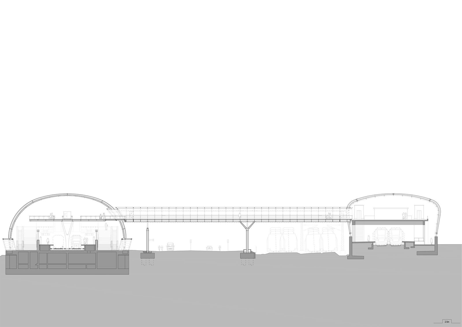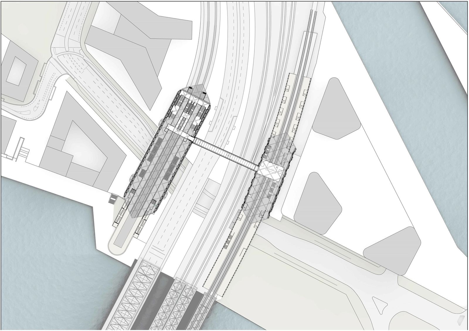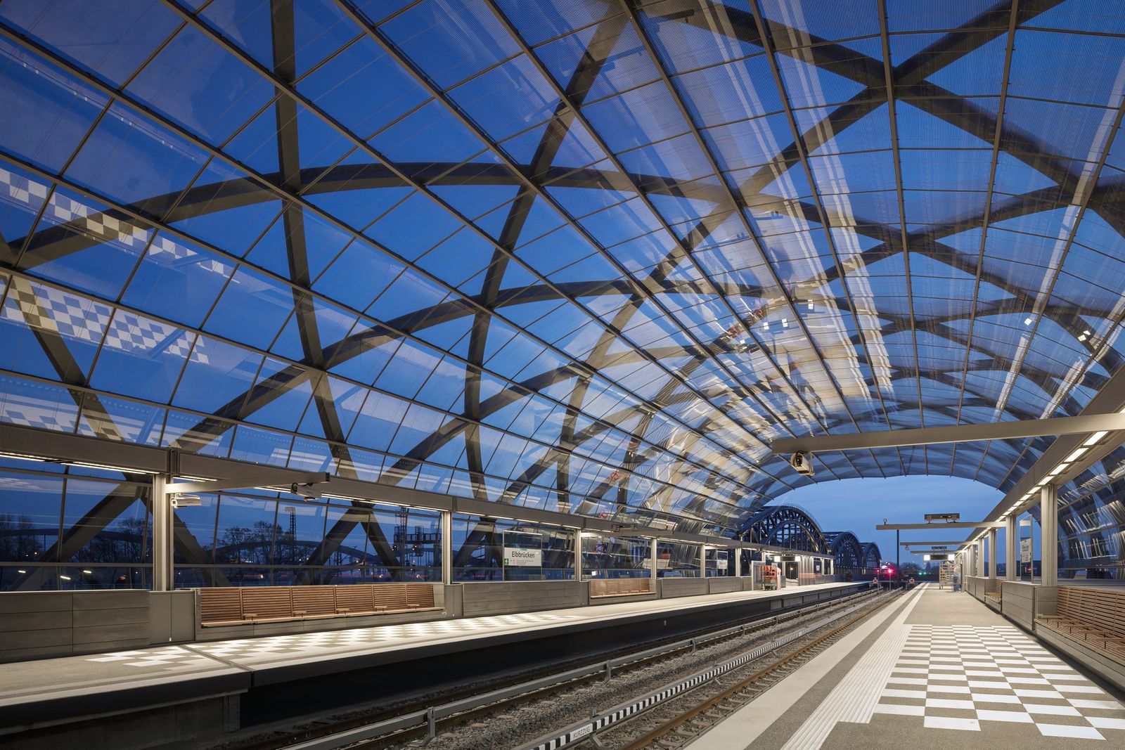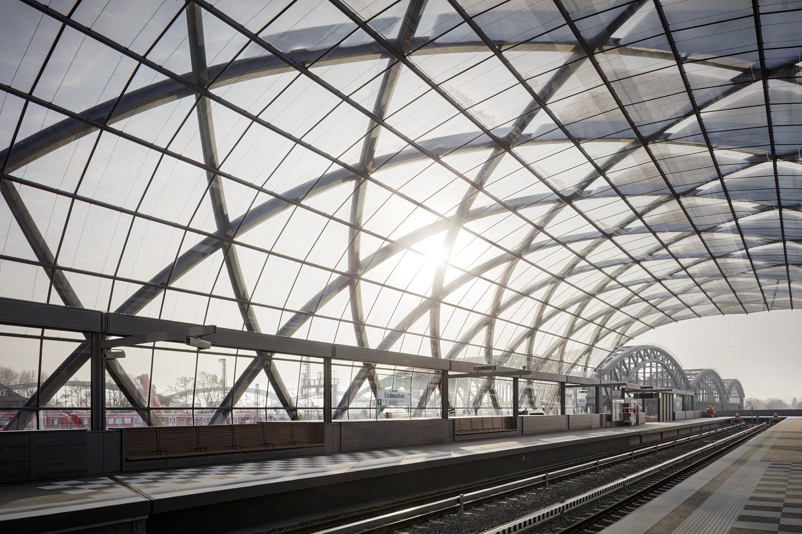 The underground station and the roof structure of the S-Bahn station bear the same architectural signature, with the result that the transportation facilities and Elbbrücken bridges appear as a holistic ensemble. gmp, in collaboration with structural engineers schlaich bergermann partner (sbp), submitted the design for the three-dimensional geometry of the steel and glass structure as a modern reflection of the imposing historic Elbbrücken bridges, which are listed as a historic monuments. The roof structure of the underground and S-Bahn stations creates an ellipsoidal arch profile consisting of crossing arched steel frames. The twisted steel beams are arranged to form a diamond-shaped grid pattern in which the individual arches stabilize one another. The structural steel members are outside the envelope – the glazing being supported on the inside – thereby achieving a distinguished presence in the cityscape and creating an aesthetic response to the adjacent Elbbrücken bridges. In line with the diamond pattern, the roof ends on both gable sides form conspicuous projecting points.